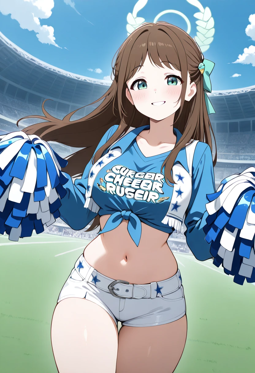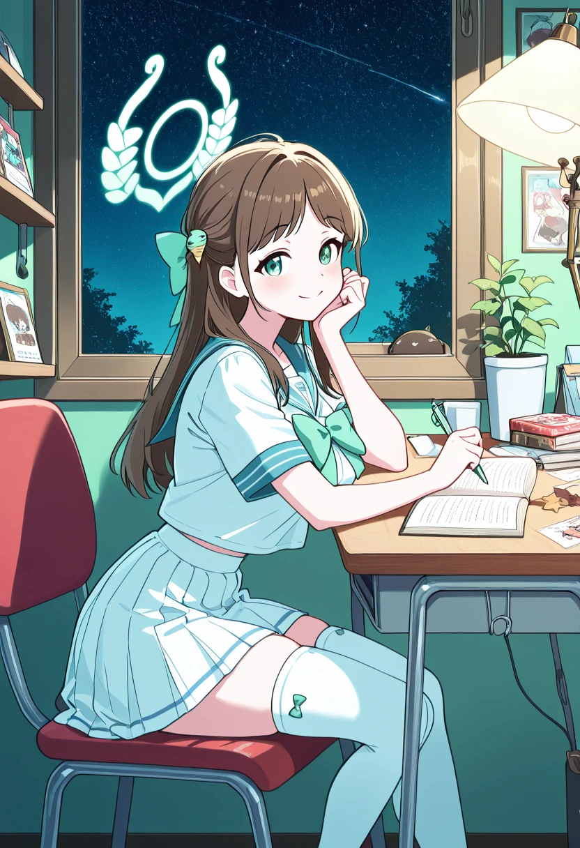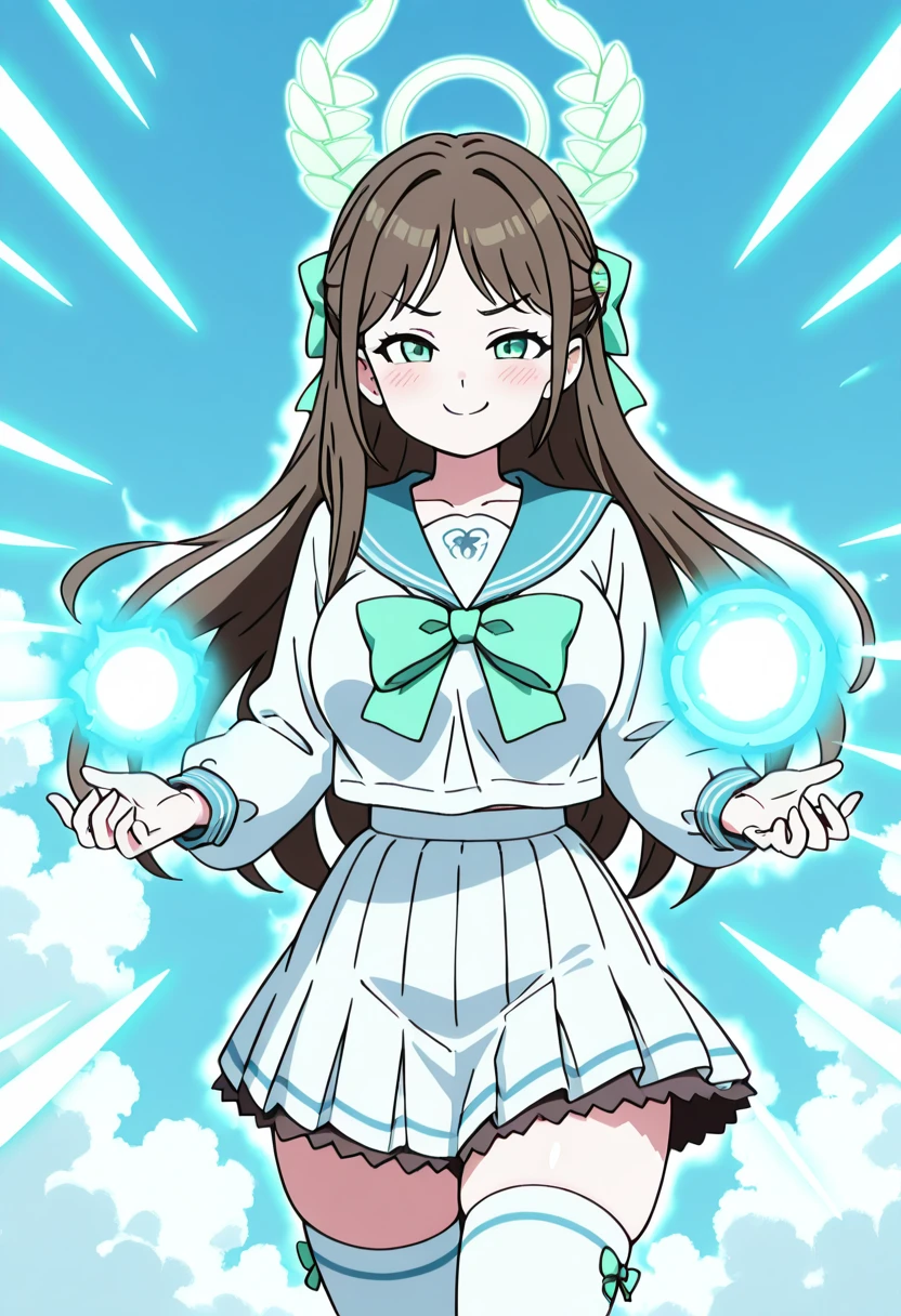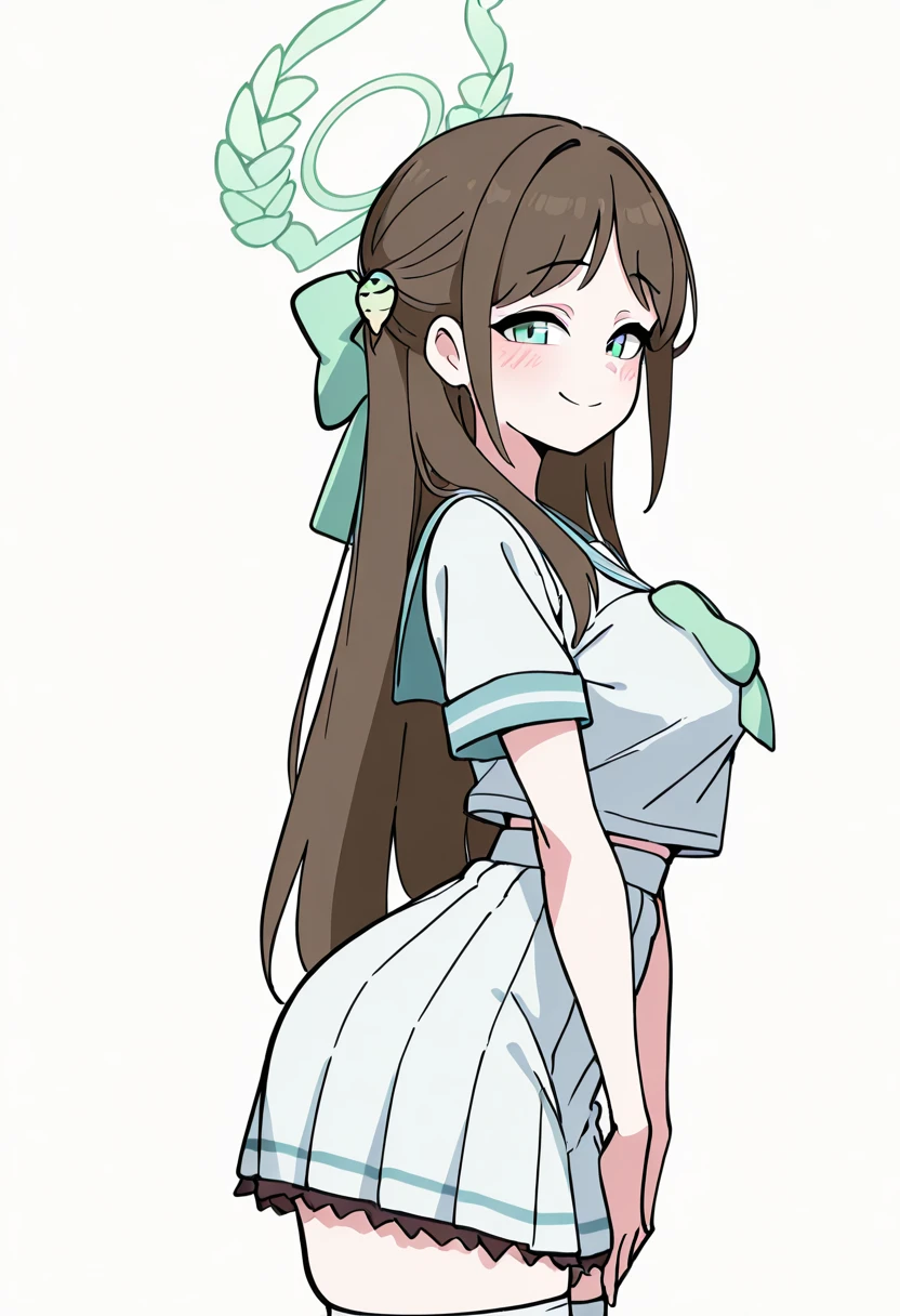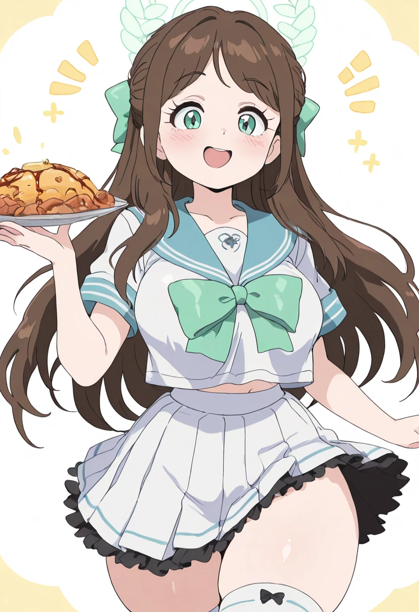 zzAiri, green eyes, brown hair, food-themed hair ornament, green halo, hair bow, hair ornament, long hair, aged up, large breasts, white serafuku, blue sailor collar, green bow, white skirt, black frills, white thighhighs,