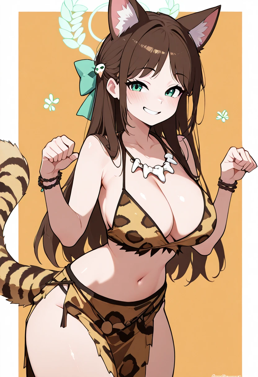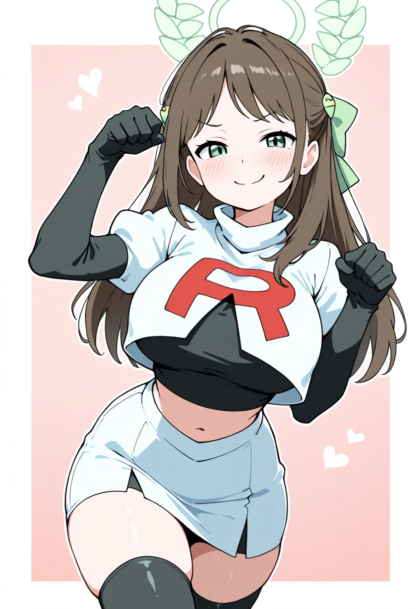 zzAiri, green eyes, brown hair, food-themed hair ornament, green halo, hair bow, hair ornament, long hair, aged up, large breasts,
