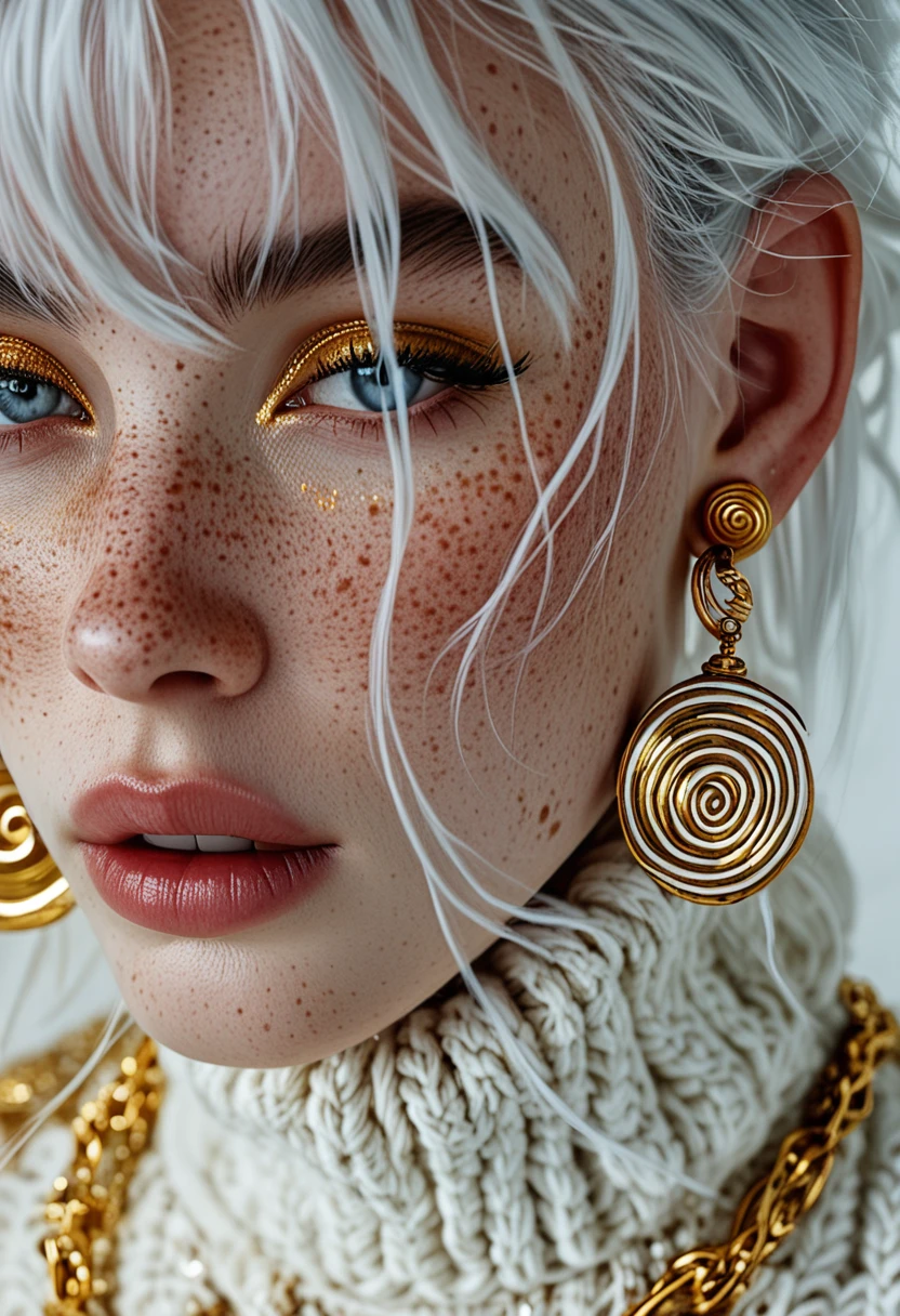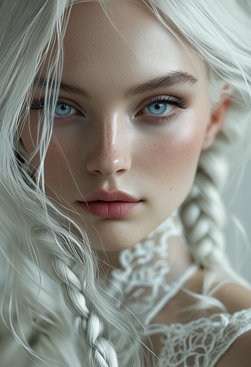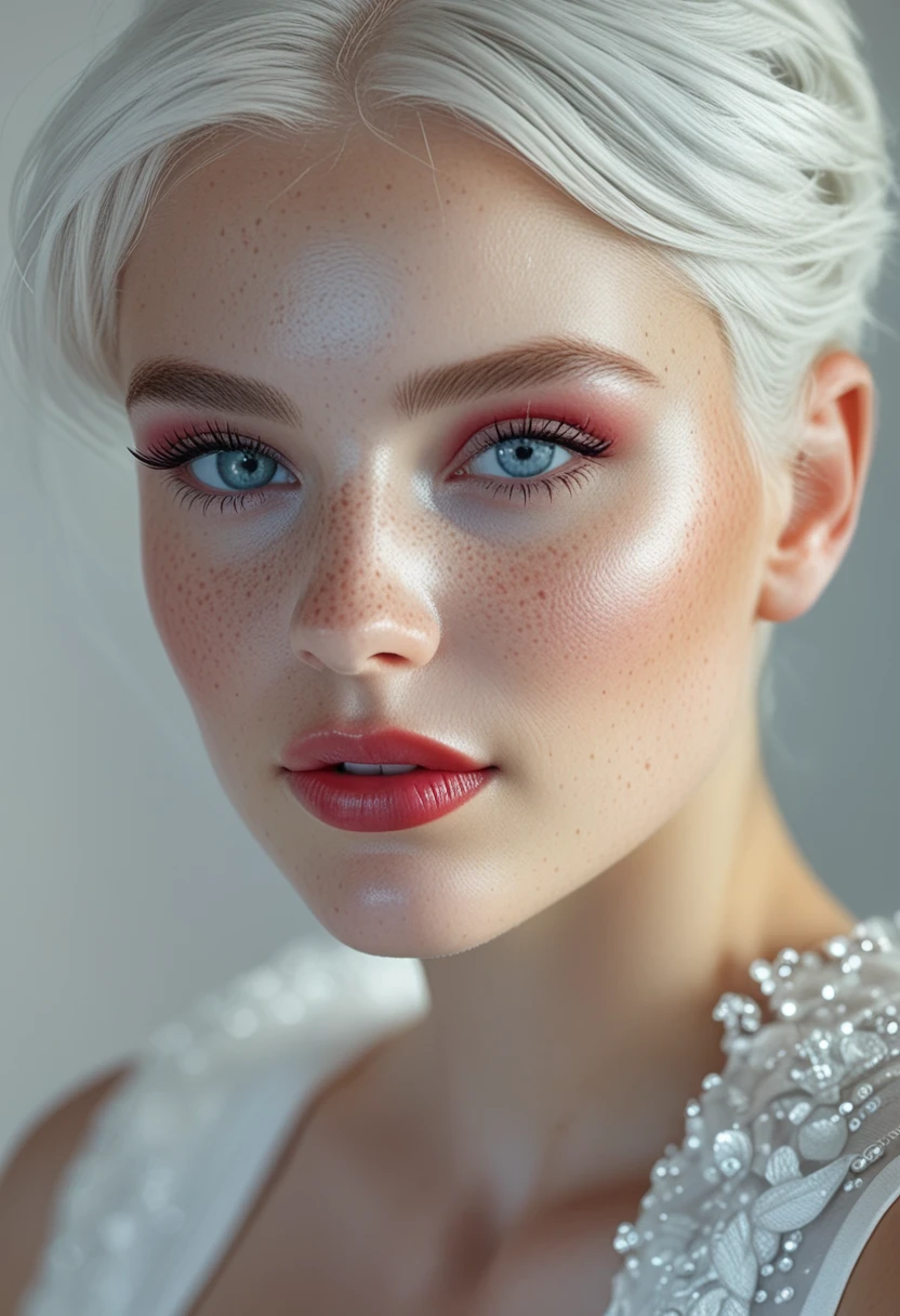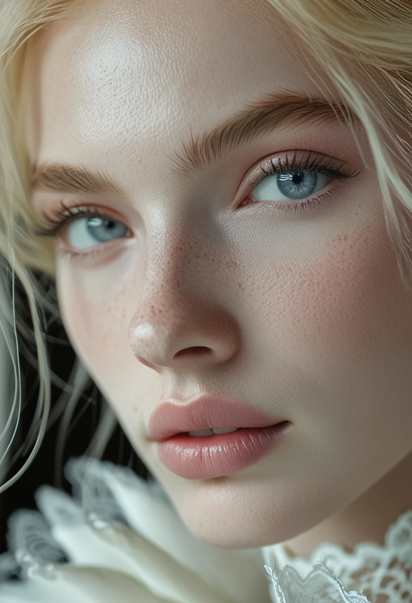 This LoRA trained on CyberRealistic Pony v16 for a very specific style: close-up portraits featuring platinum blonde / pale silver hair, extremely pale skin with visible freckles and natural texture, and full, plump lips.