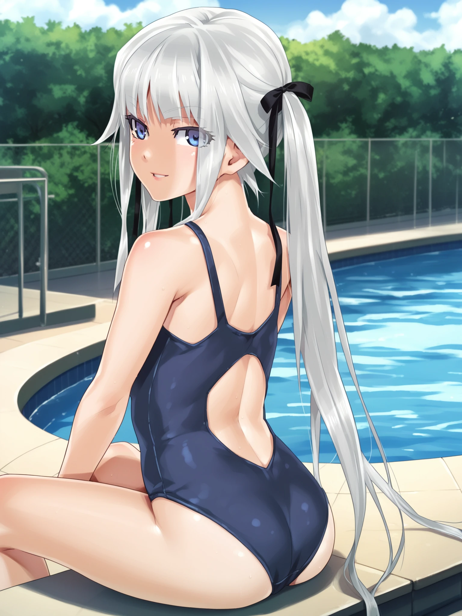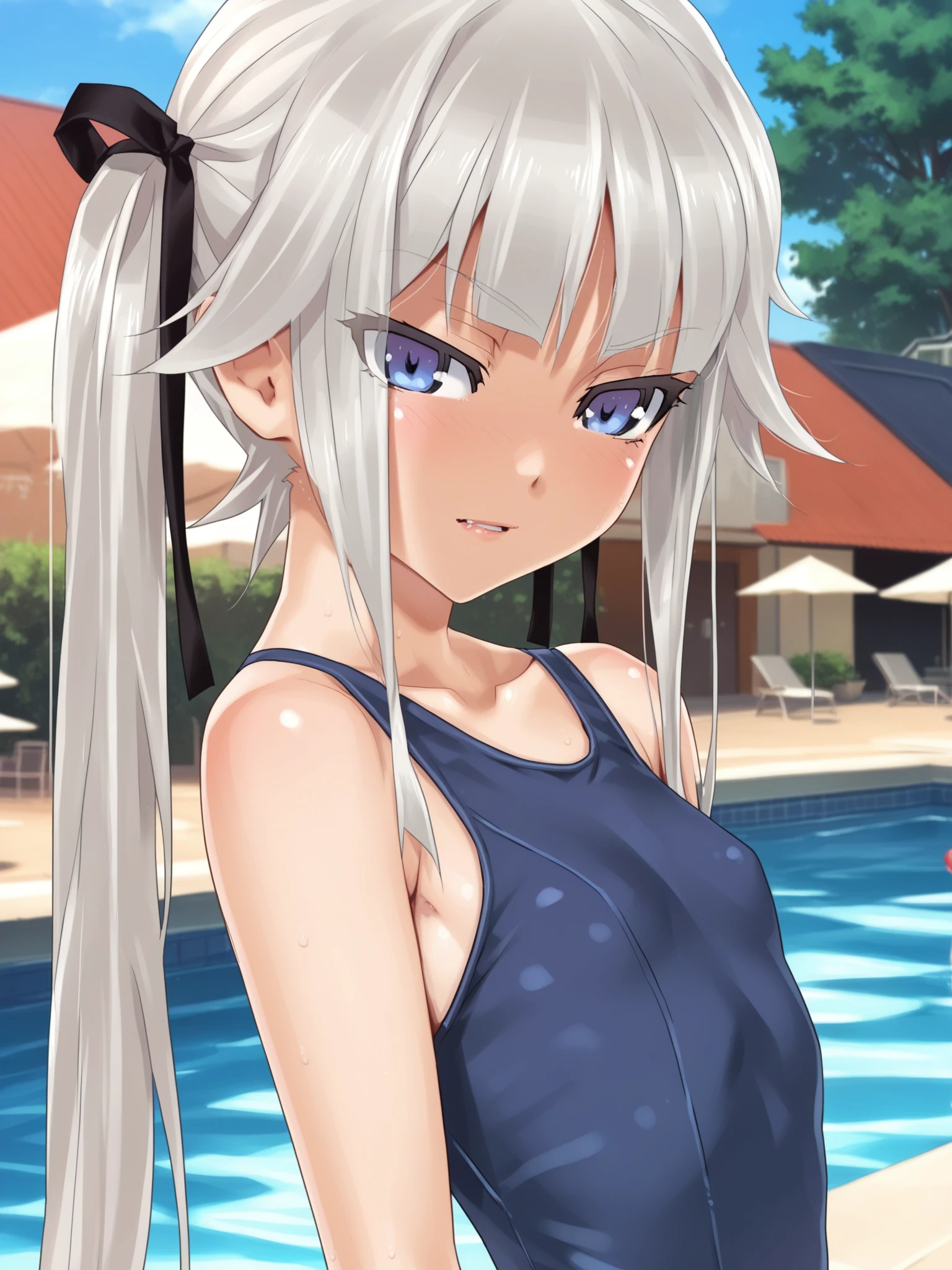 • School swimsuit: blue eyes, twintails, hair ribbon, black ribbon, school swimsuit, blue one-piece swimsuit