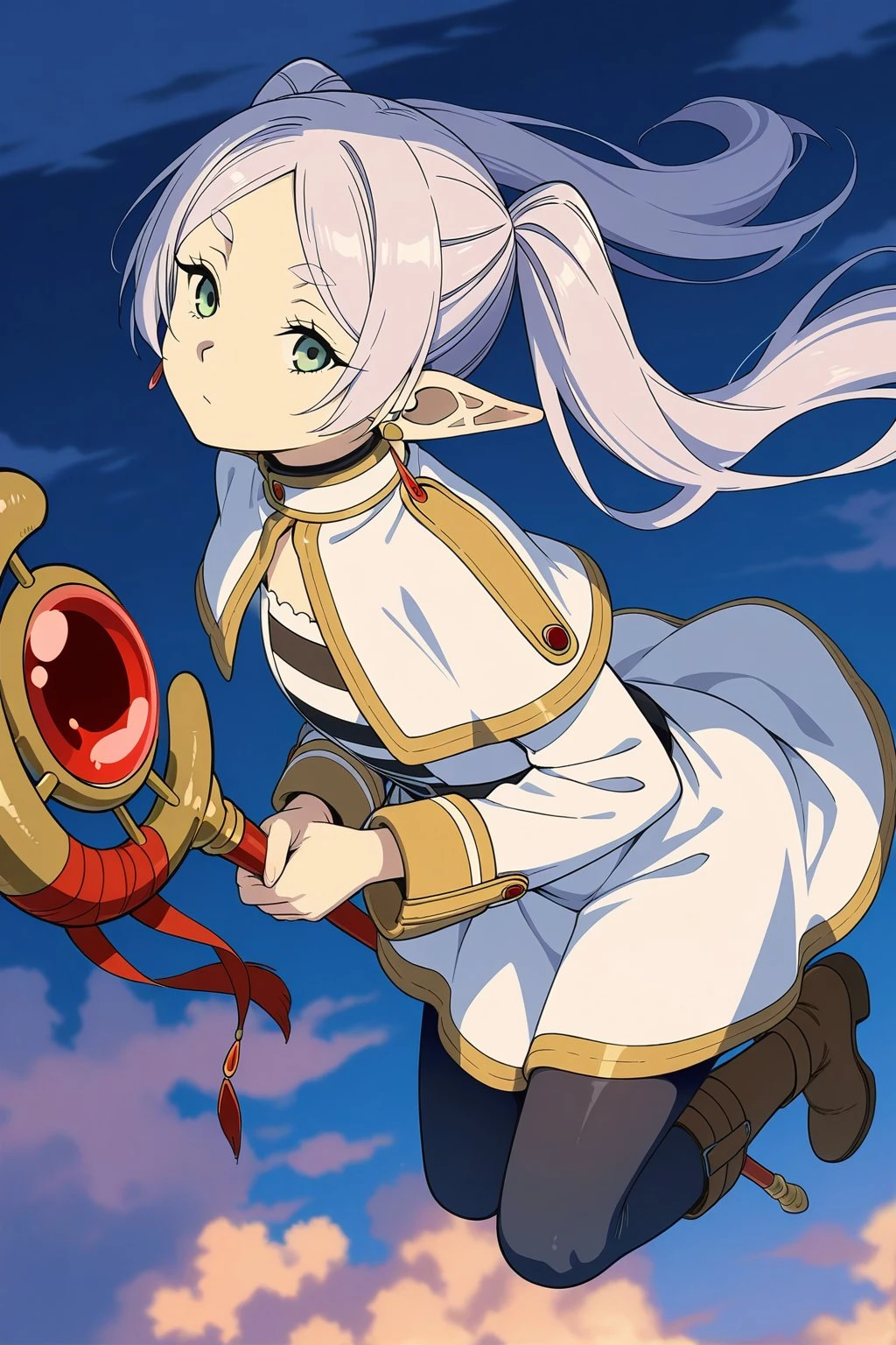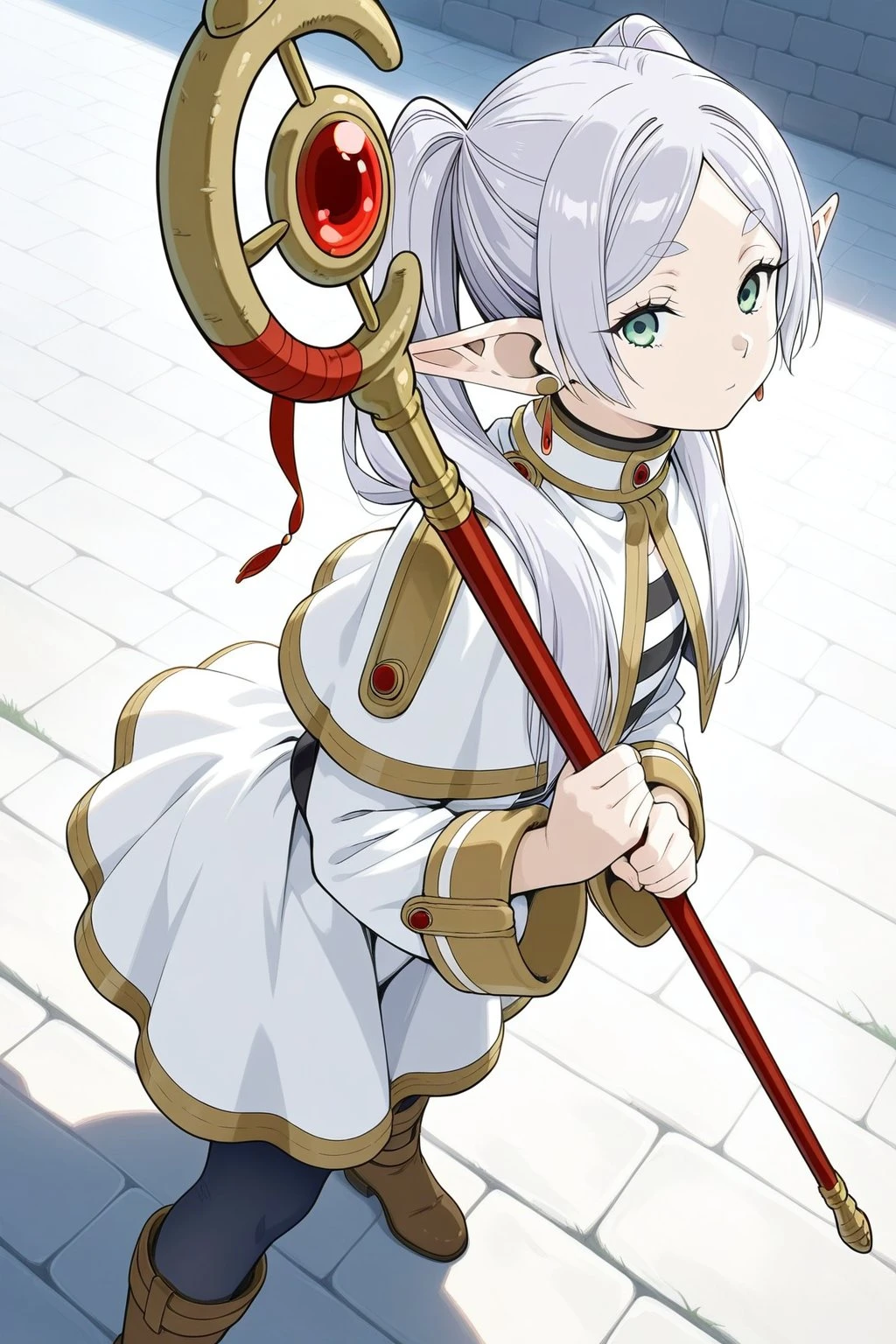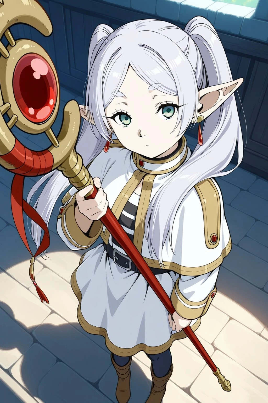 masterpiece, best quality, amazing quality, fine details, Frieren, elf, solo, breasts, flat breasts, long hair, white hair, twintails, bangs, parted bangs, pointy ears, green eyes,