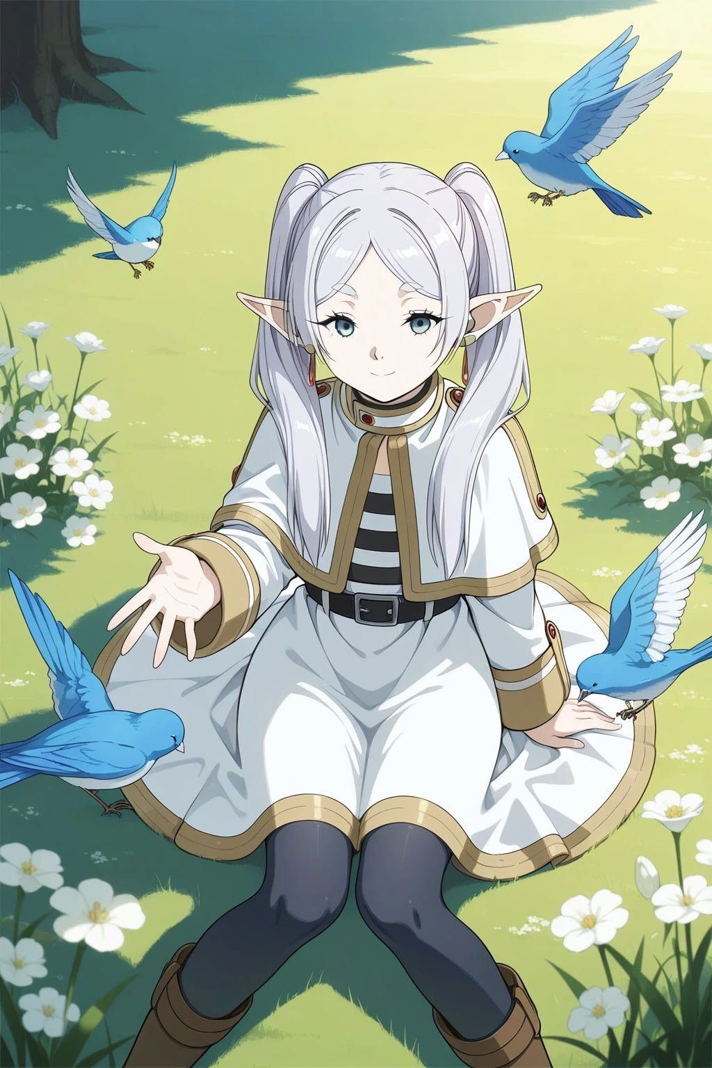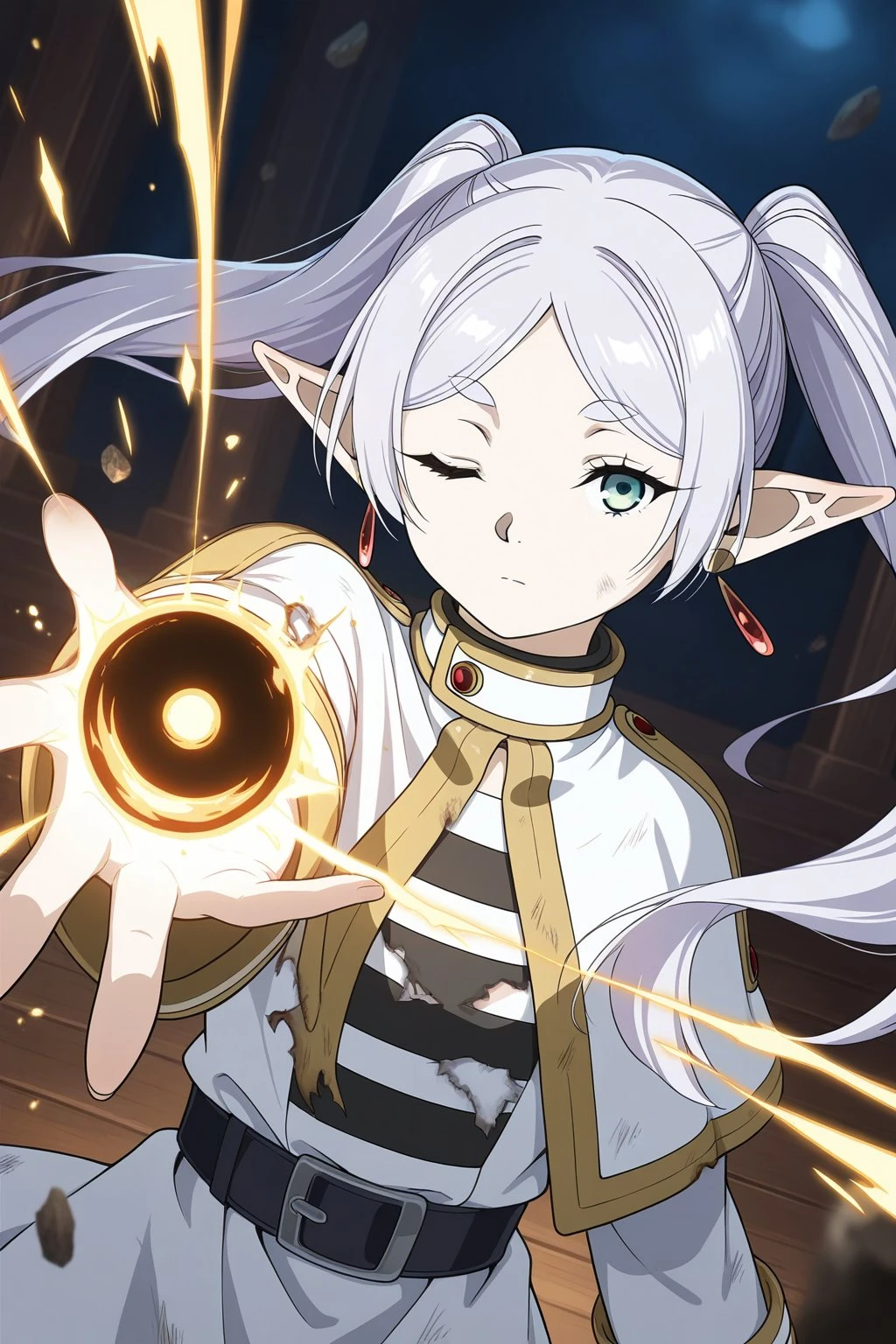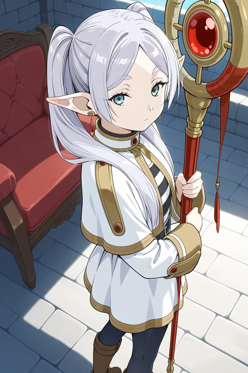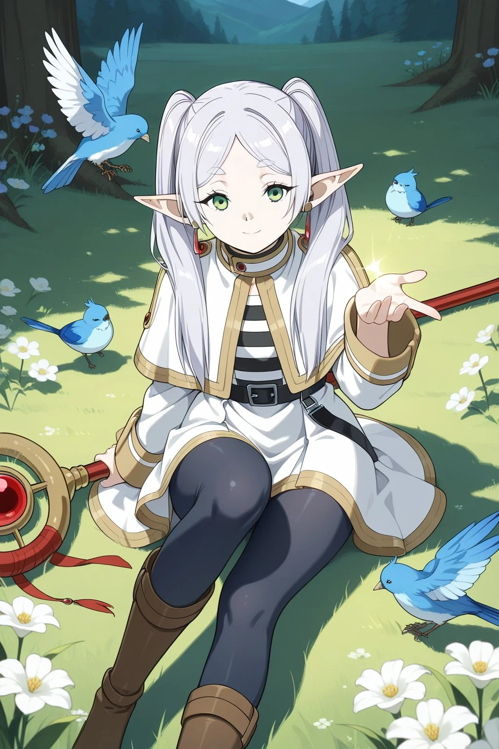 masterpiece, best quality, amazing quality, fine details, Frieren, elf, solo, breasts, flat breasts, long hair, white hair, twintails, bangs, parted bangs, pointy ears, green eyes,