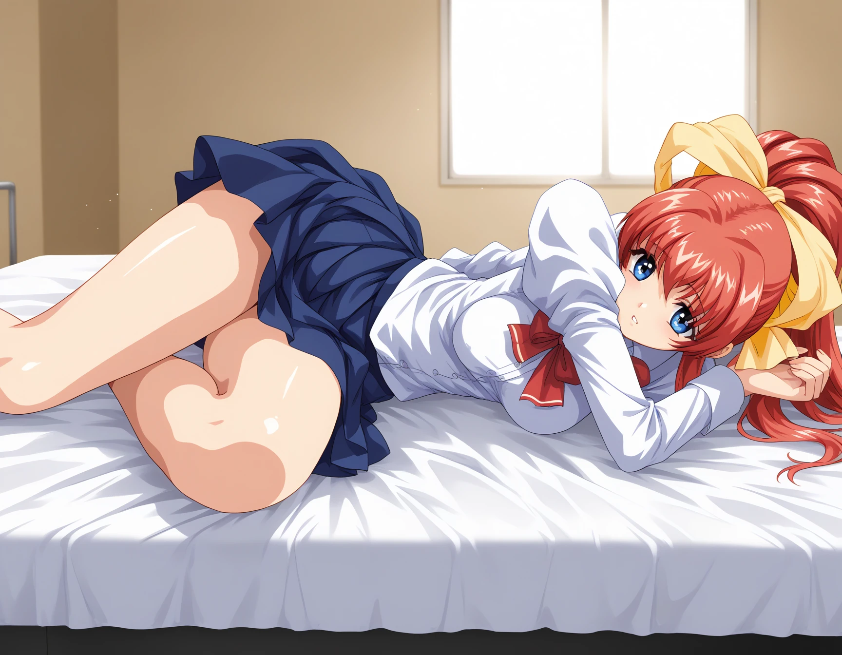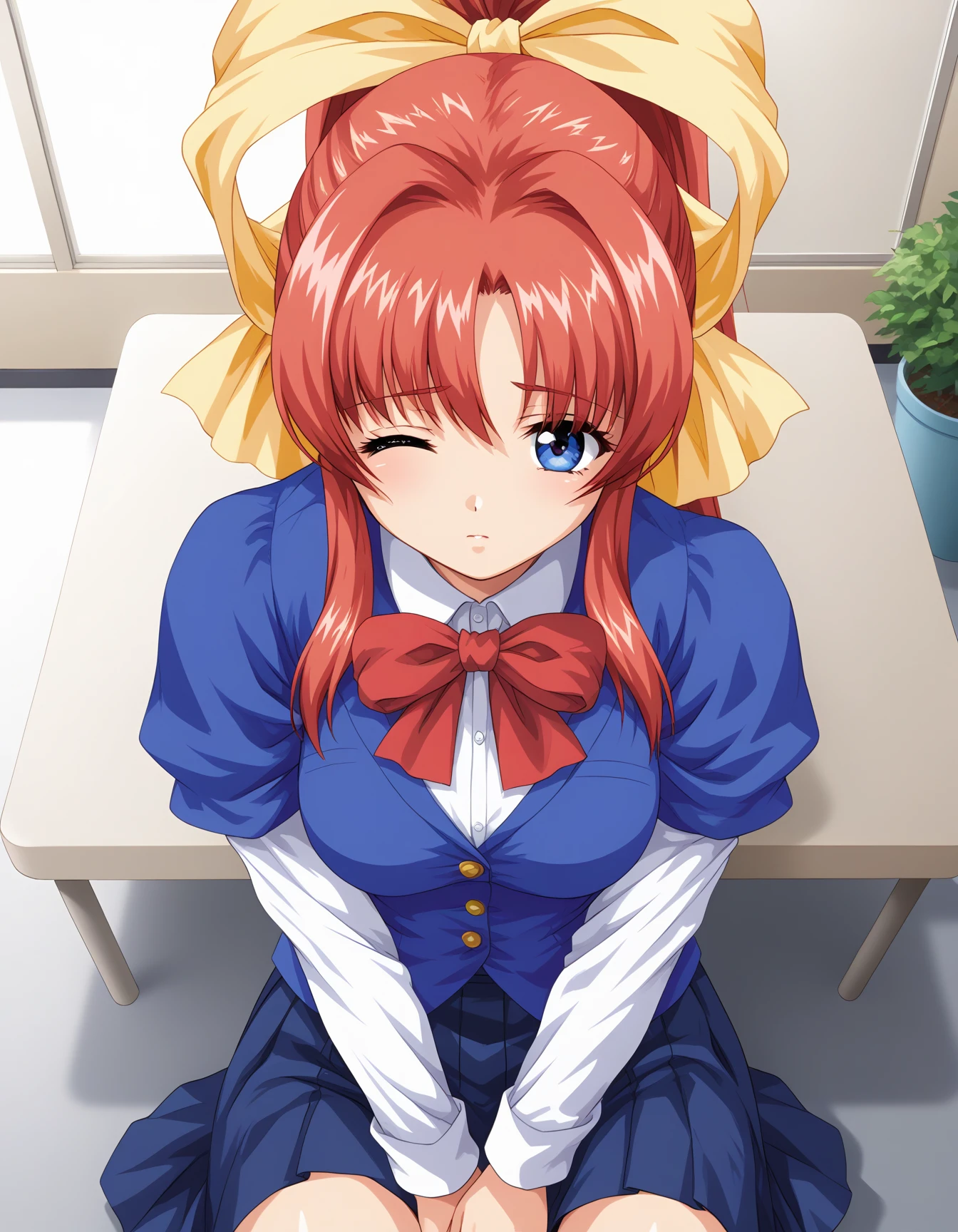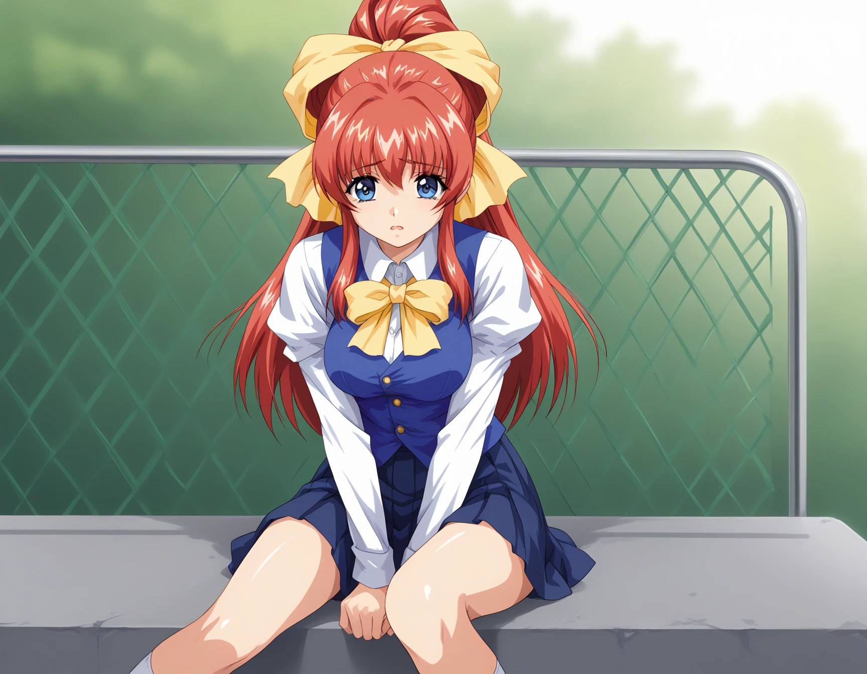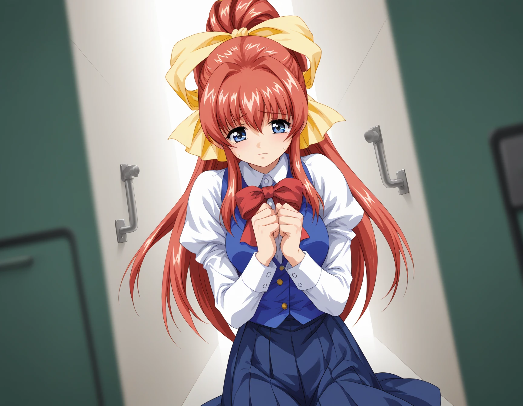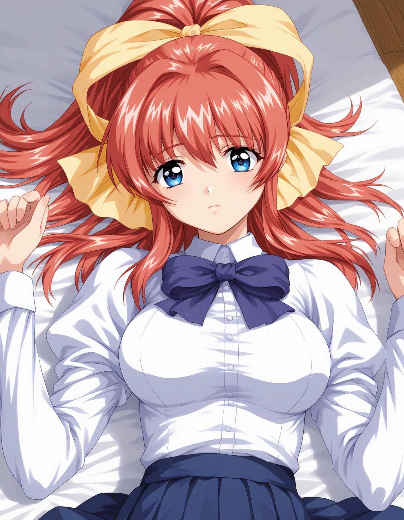 Kasugai_Mizuho, 1girl, large breasts, blue eyes, red hair, long hair, ponytail, bangs, hair between eyes, long sidelocks, hair intakes, hair bow, hair ribbon, yellow ribbon, school uniform, long sleeves, puffy sleeves, shirt, skirt, pleated skirt, bow tie, ribbon tie, red ribbonDescription