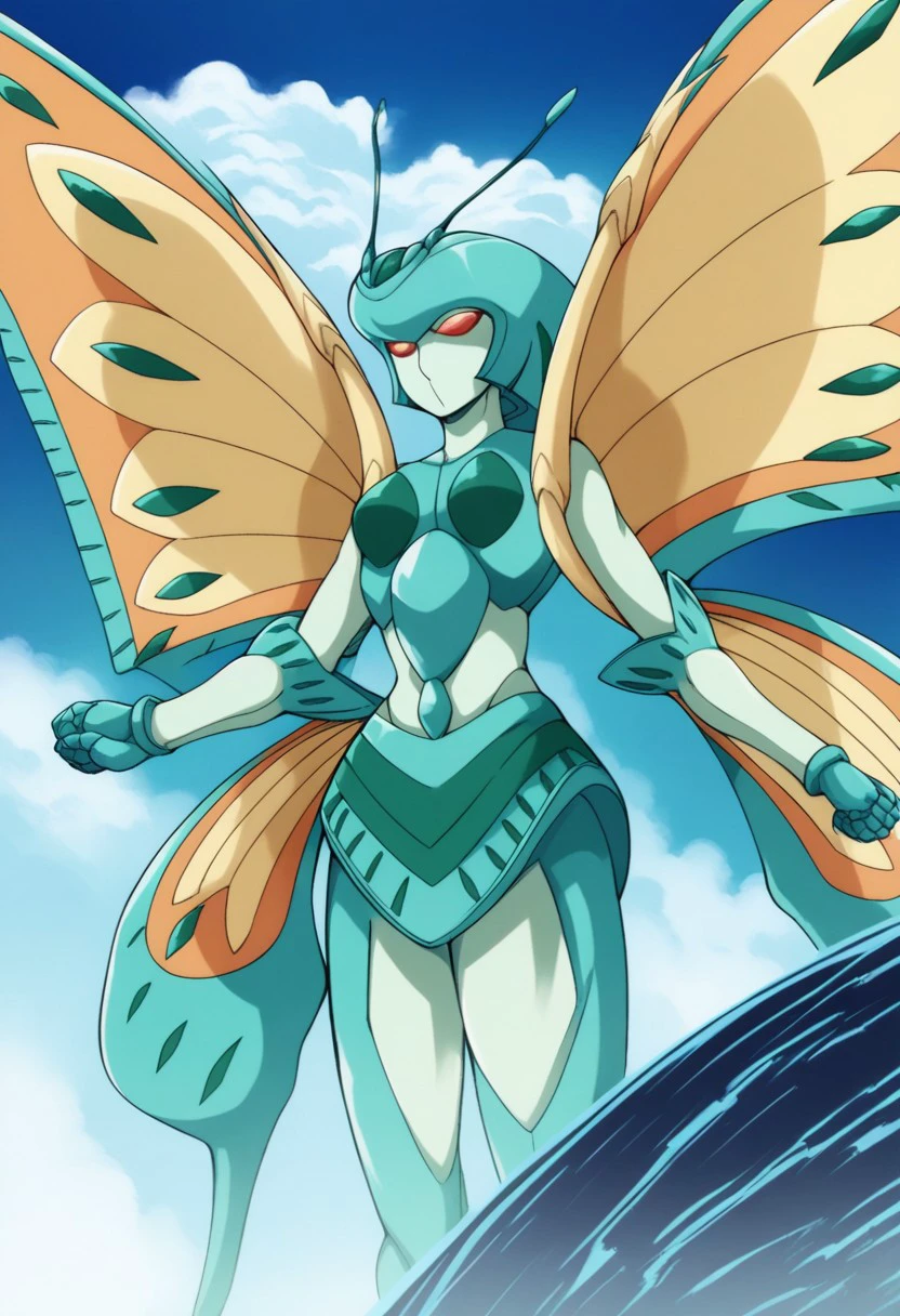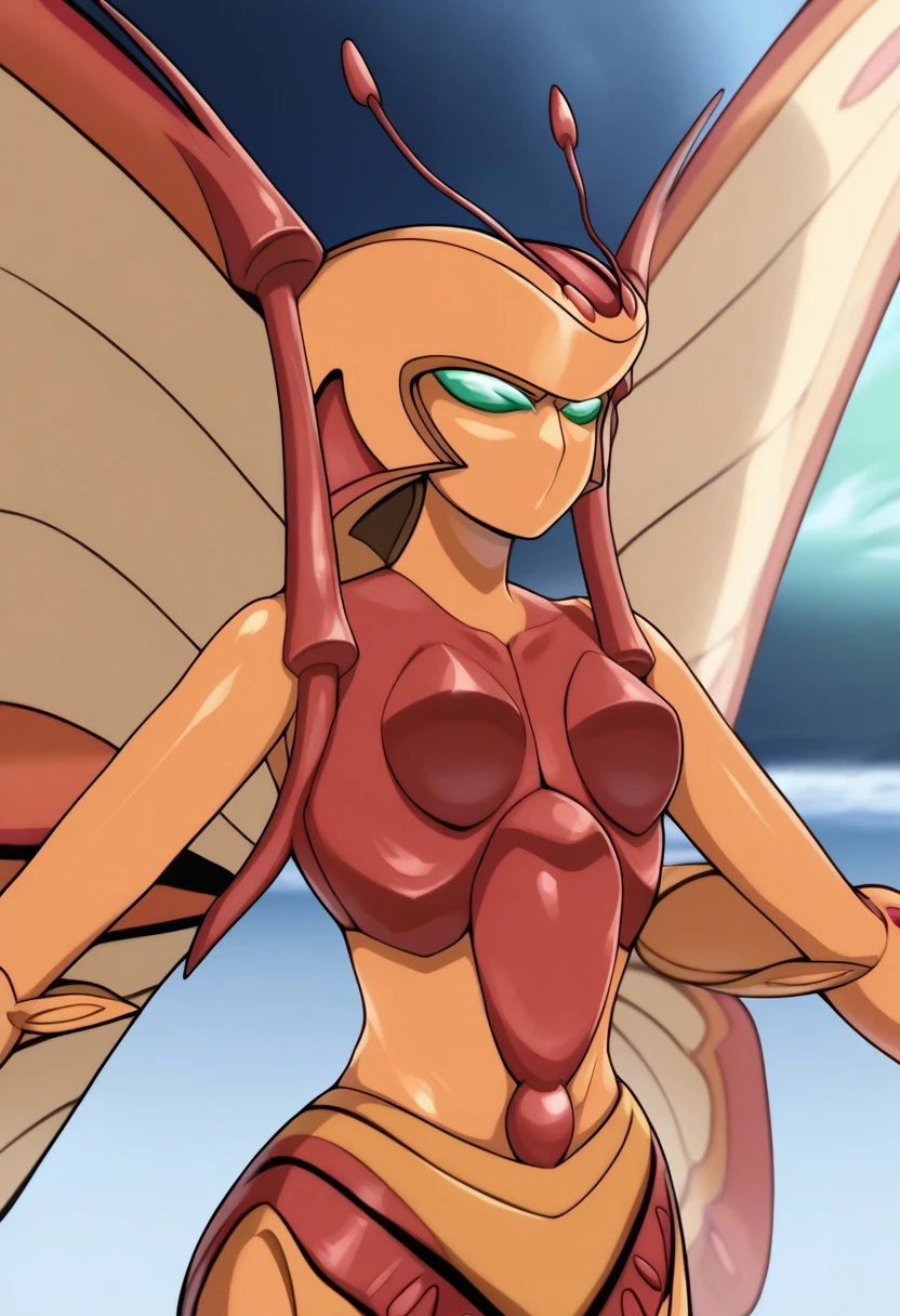 Ventus monarus prompt:bakugan,1girl,monarus,ventus monarus,bakugan (creature),butterfly wings,wings,midriff,breasts,solo,robot,no humans,mecha,red eyes,parody,cloud,bug,sky,color skin,green skin