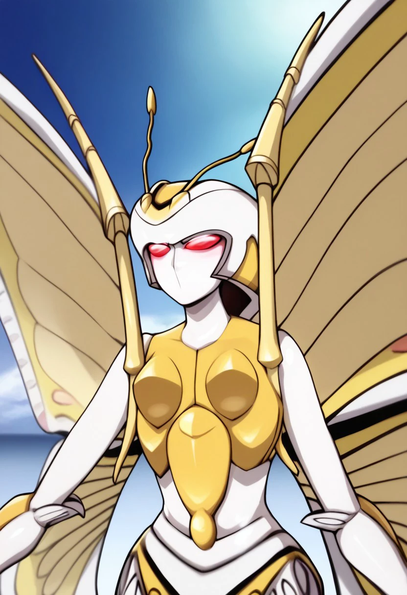 Haos monarus prompt:bakugan,1girl,monarus,haos monarus,bakugan (creature),butterfly wings,red eyes,white skin,color skin,solo,wings,antennae,red eyes,robot ,no humans,insect wings,midriff,breasts