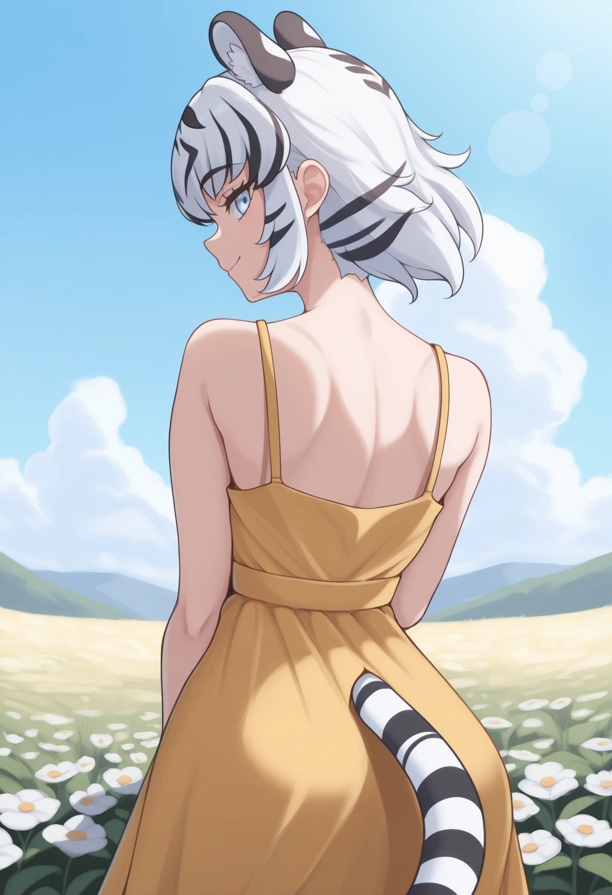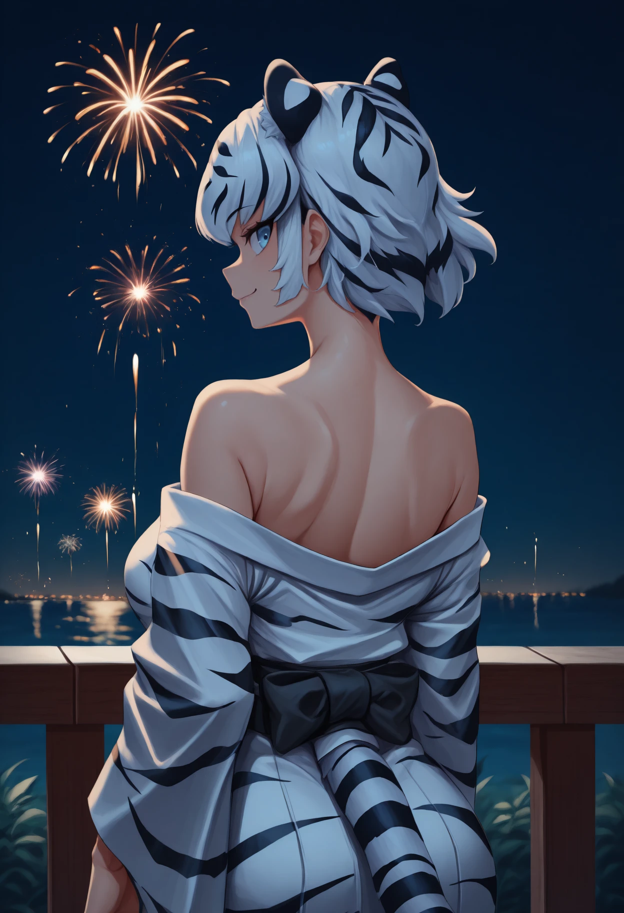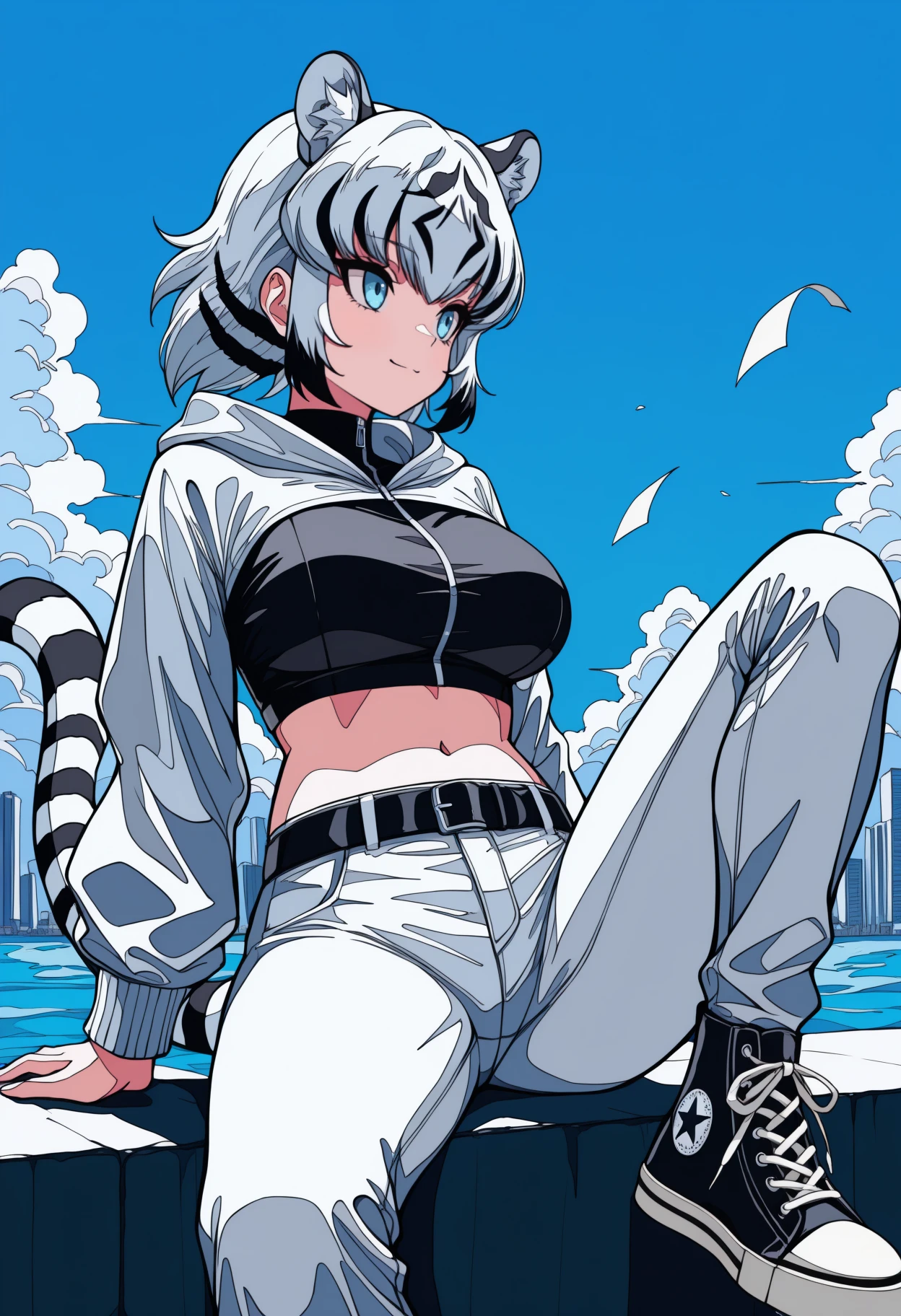 Trigger + Appearance: wh1te t1ger, tiger tail, short hair, two-tone hair, white hair, black hair, animal ears, extra ears, blue eyes