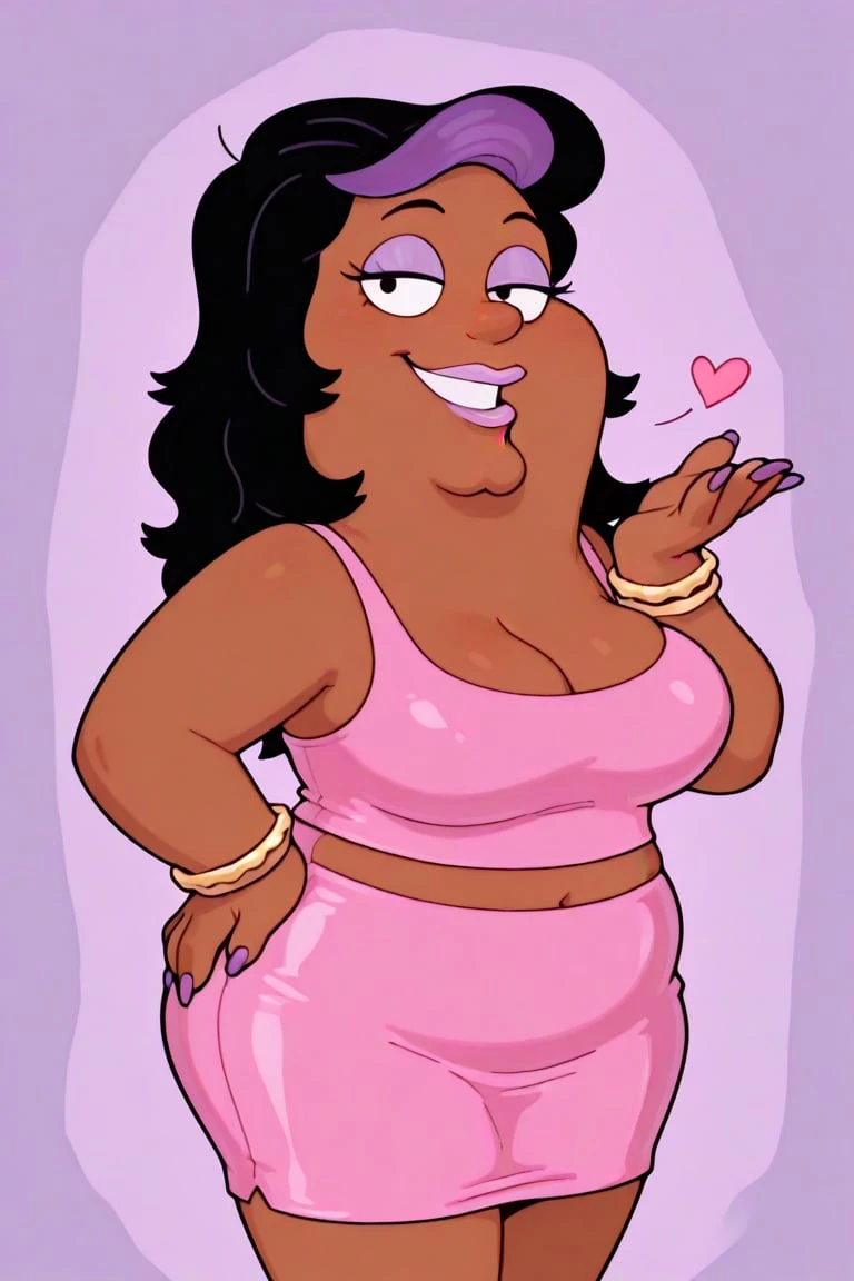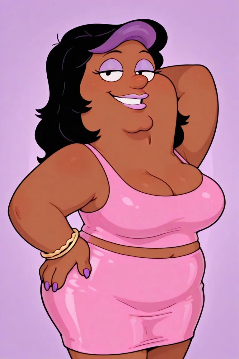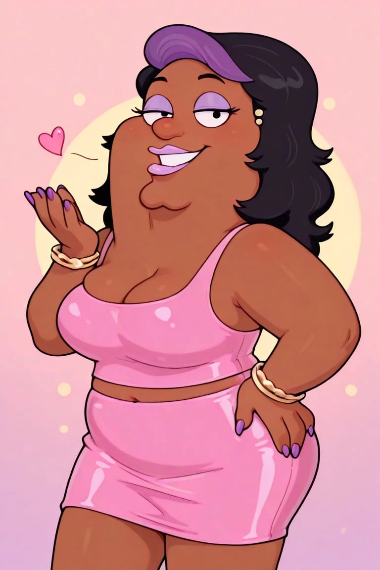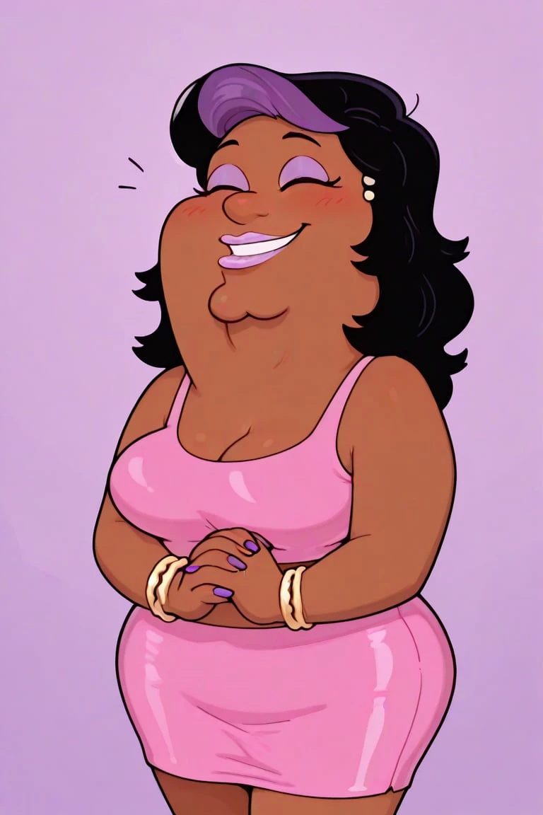 fat, dark brown skin, prominent chin, long black hair, purple bang streak, lavender eyeshadow, round nose gold stud earrings, dot eyes, lavender lipstick, plus sized, pink sleeveless top, big breasts, midriff, pink pencil skirt, golden bracelets, long purple nails, white heels