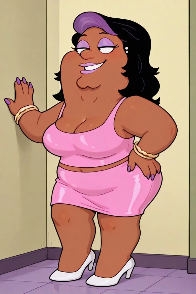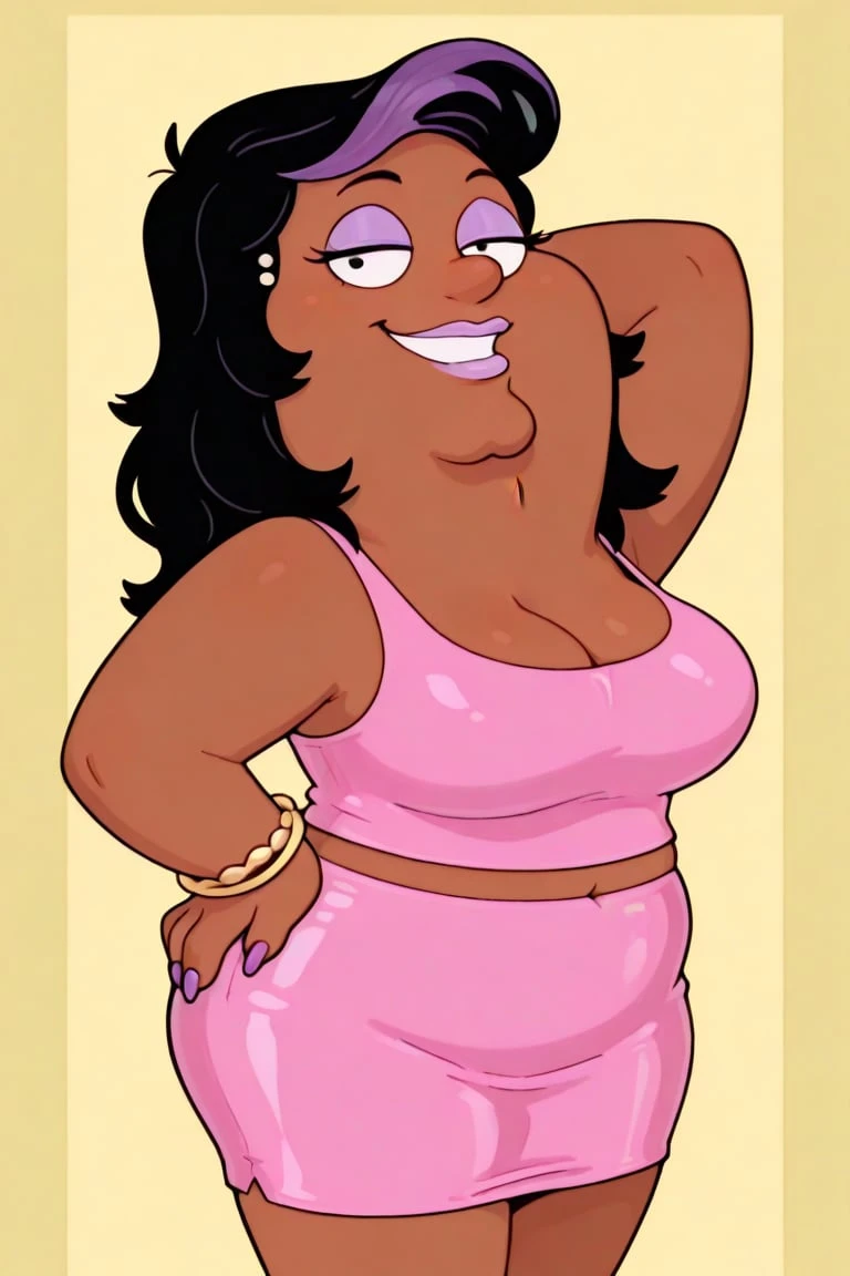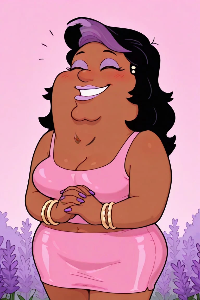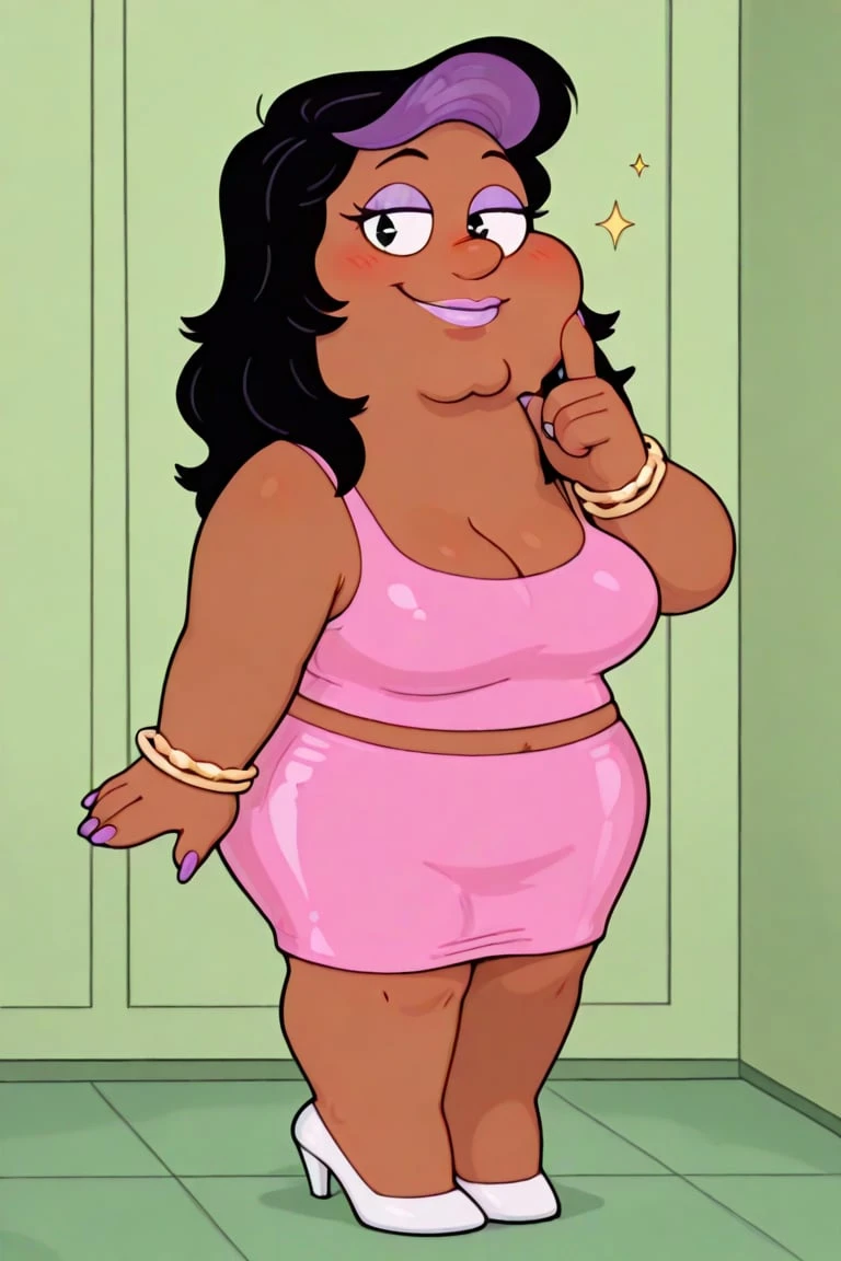 fat, dark brown skin, prominent chin, long black hair, purple bang streak, lavender eyeshadow, round nose gold stud earrings, dot eyes, lavender lipstick, plus sized, pink sleeveless top, big breasts, midriff, pink pencil skirt, golden bracelets, long purple nails, white heels