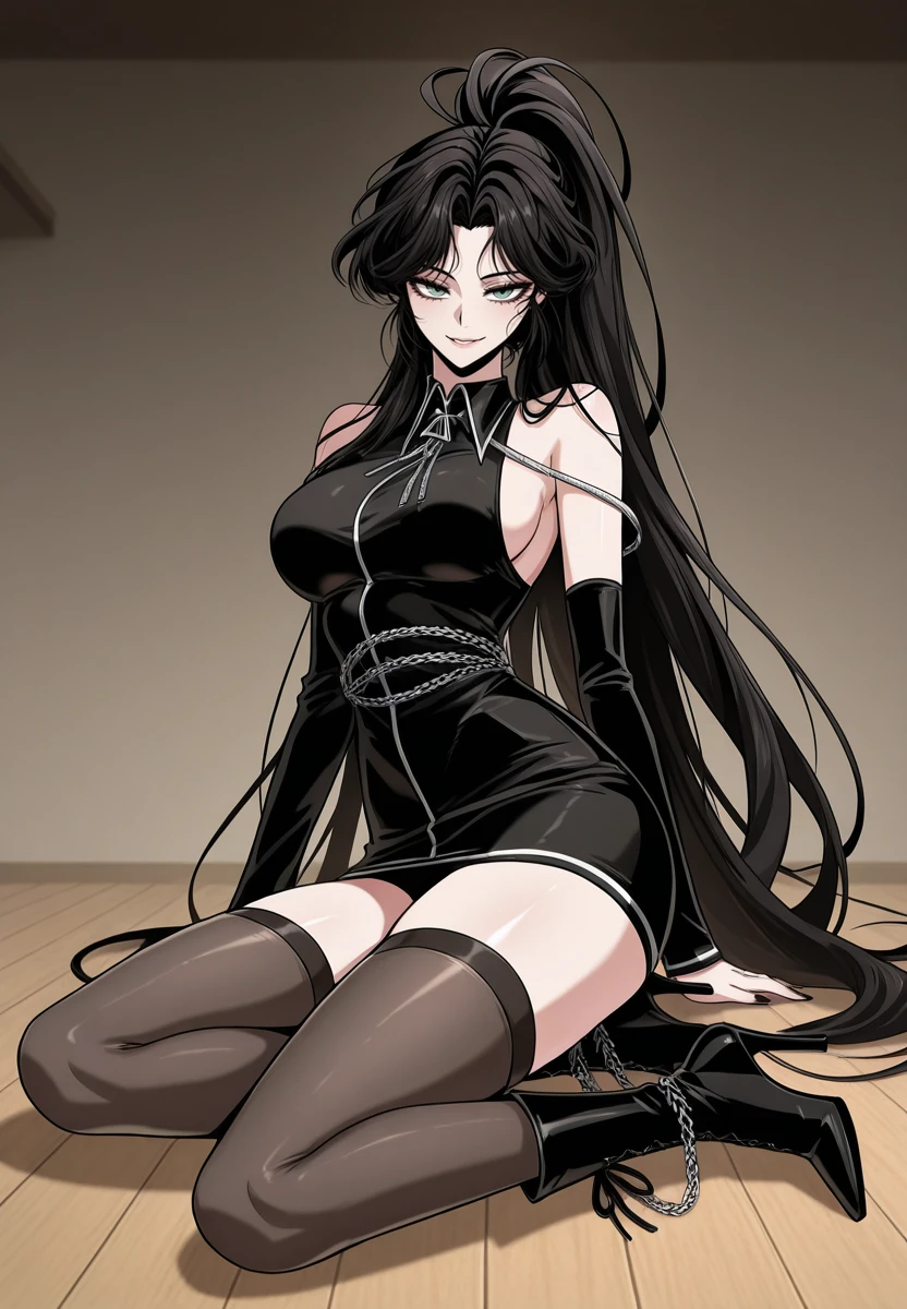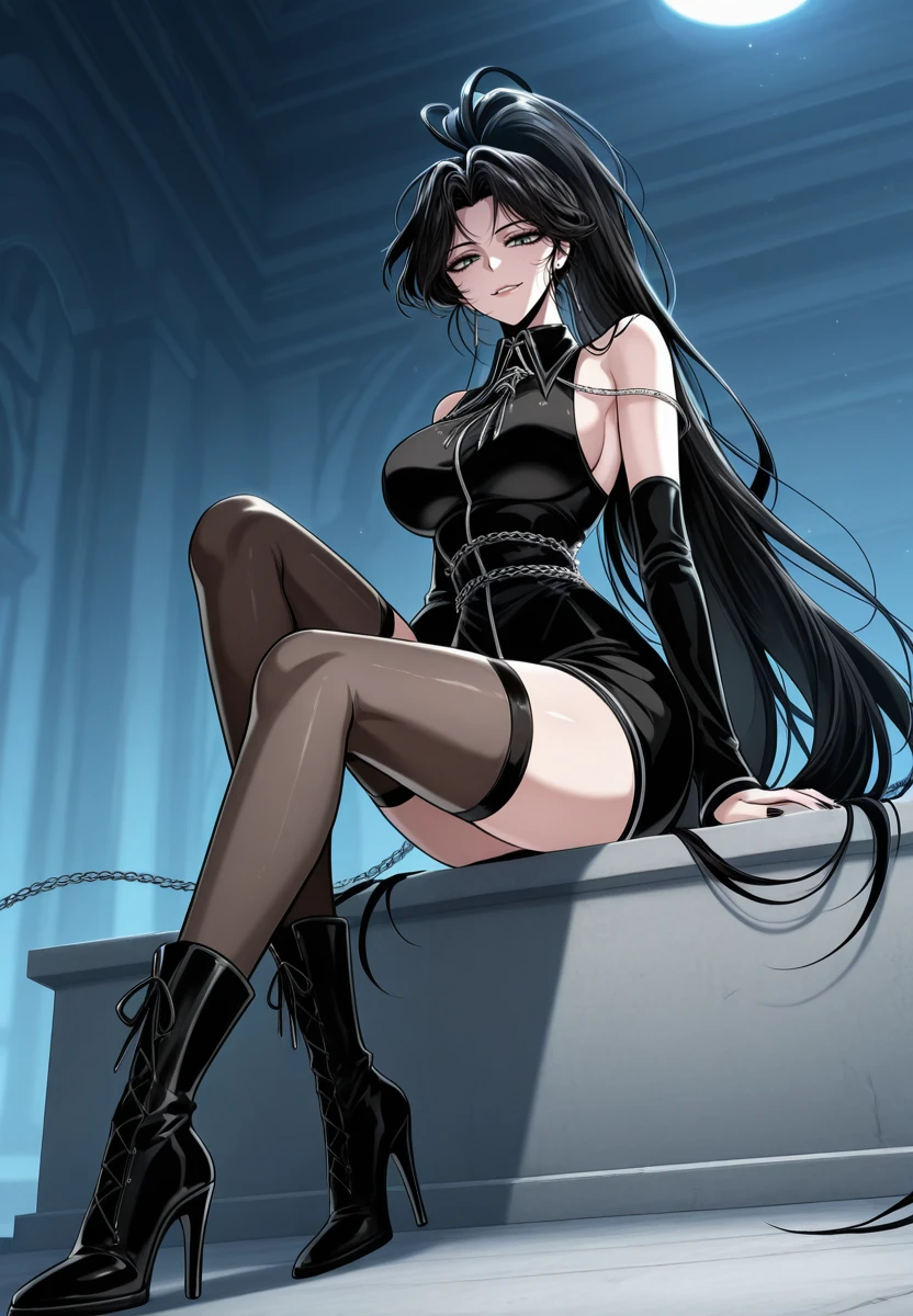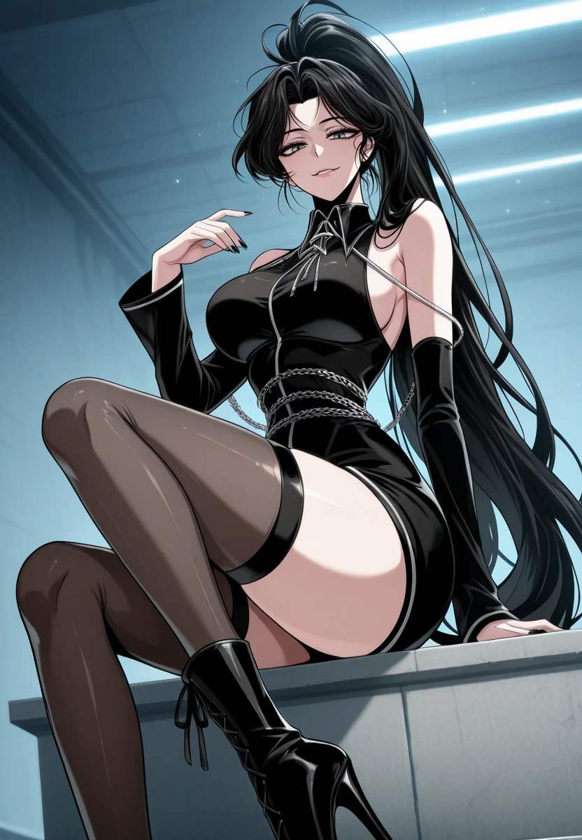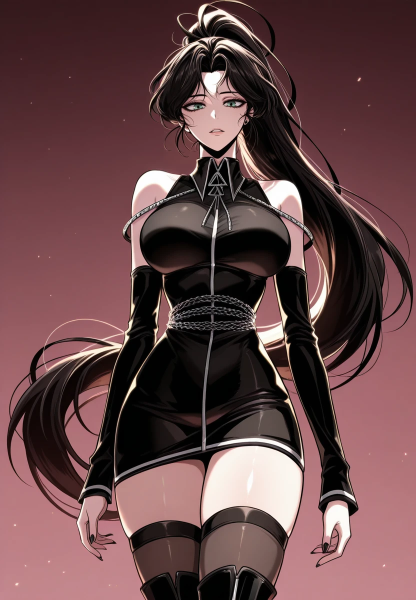 yu seolha, 1girl, black hair, green eyes, very long hair, ponytaildress, black dress, black nails, high heels, boots, zettai ryouiki, thighhighs, chain
