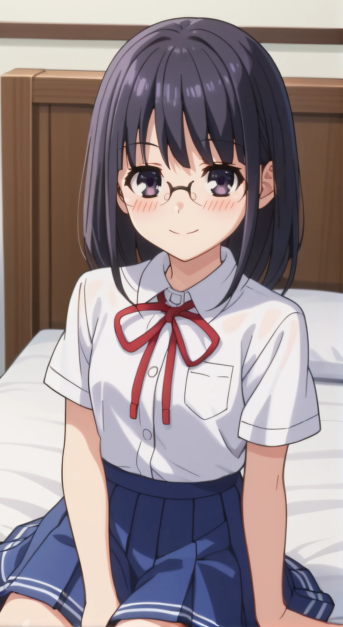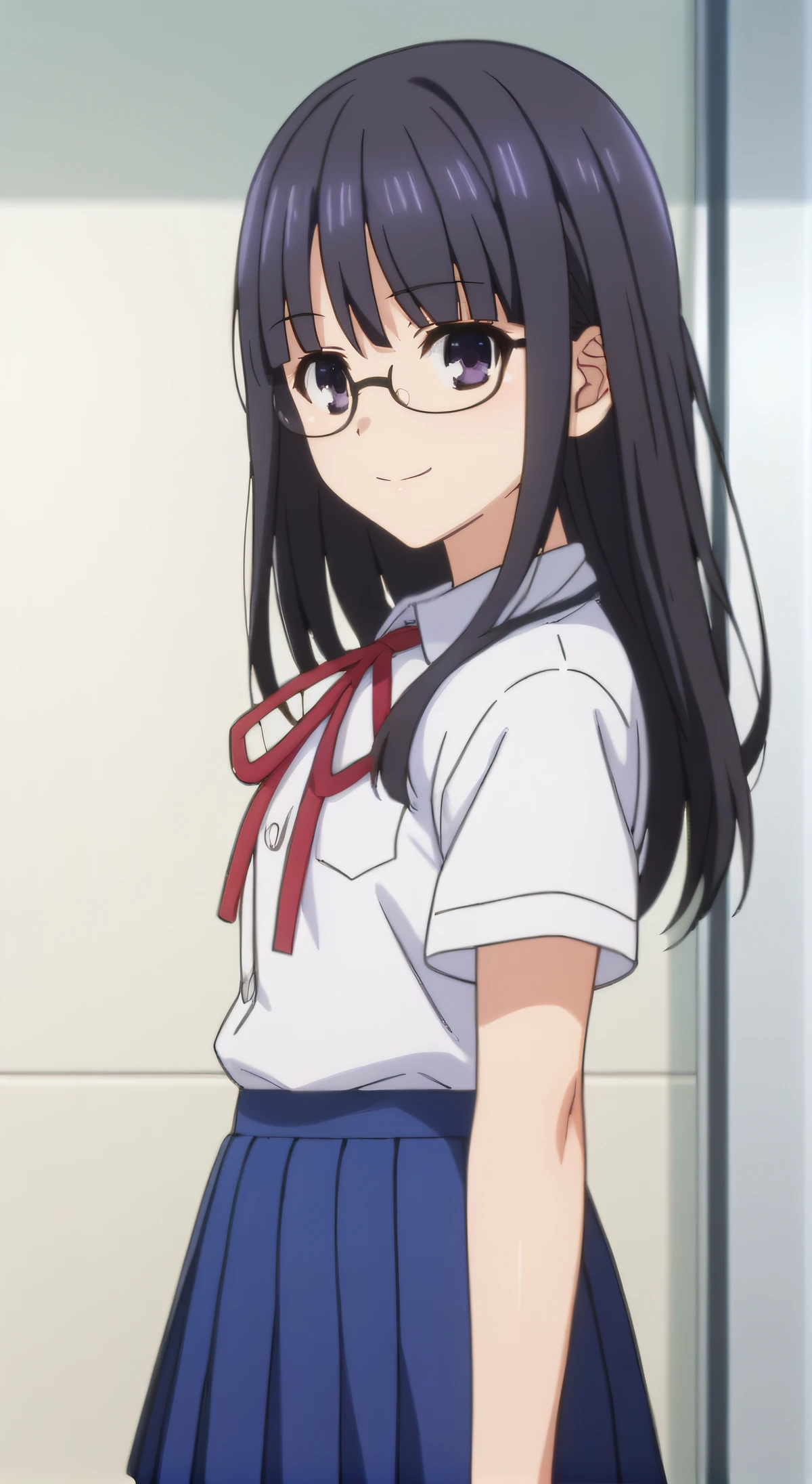 school uniform, white shirt, short sleeves, pleated skirt, blue skirt
