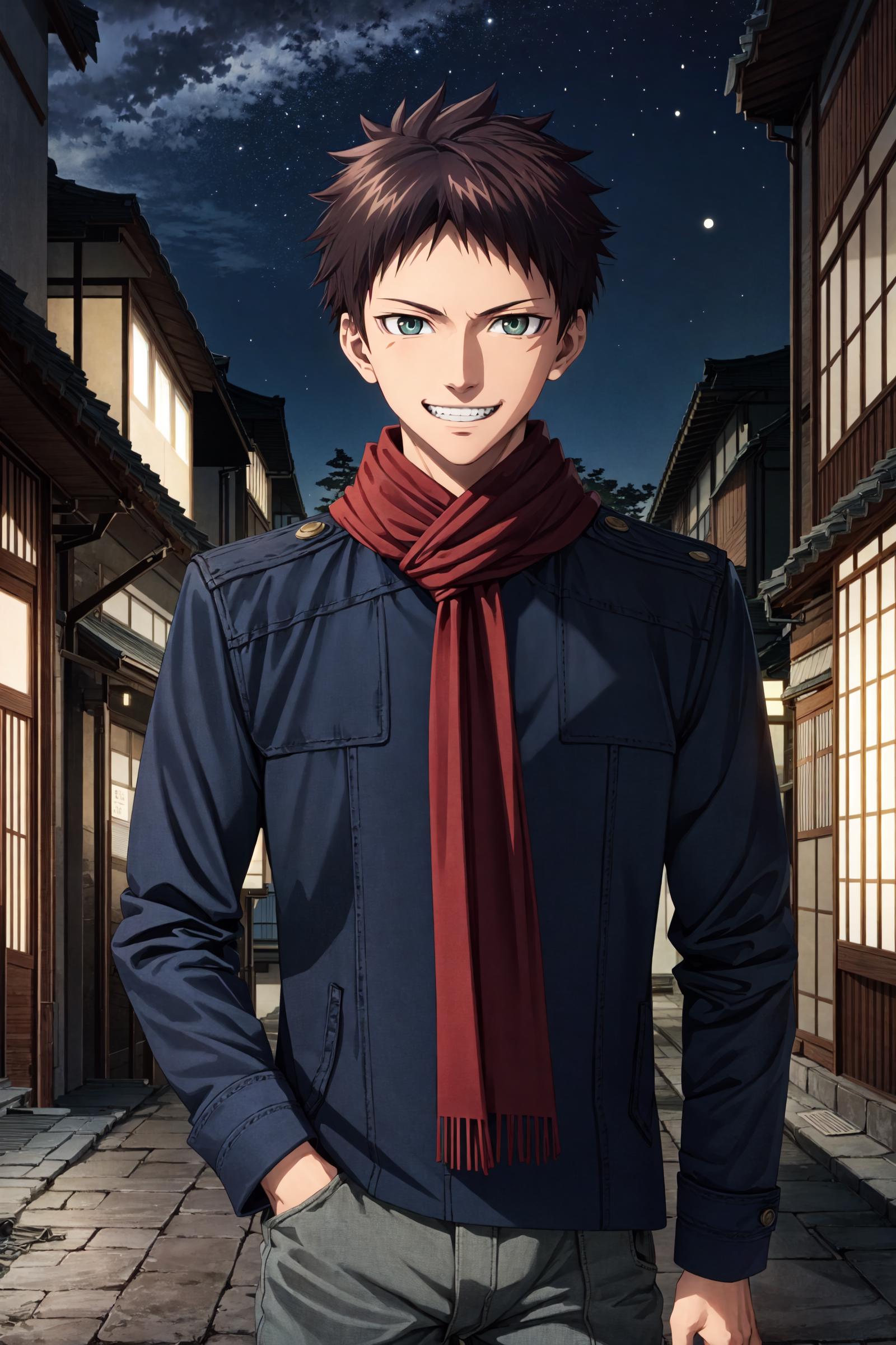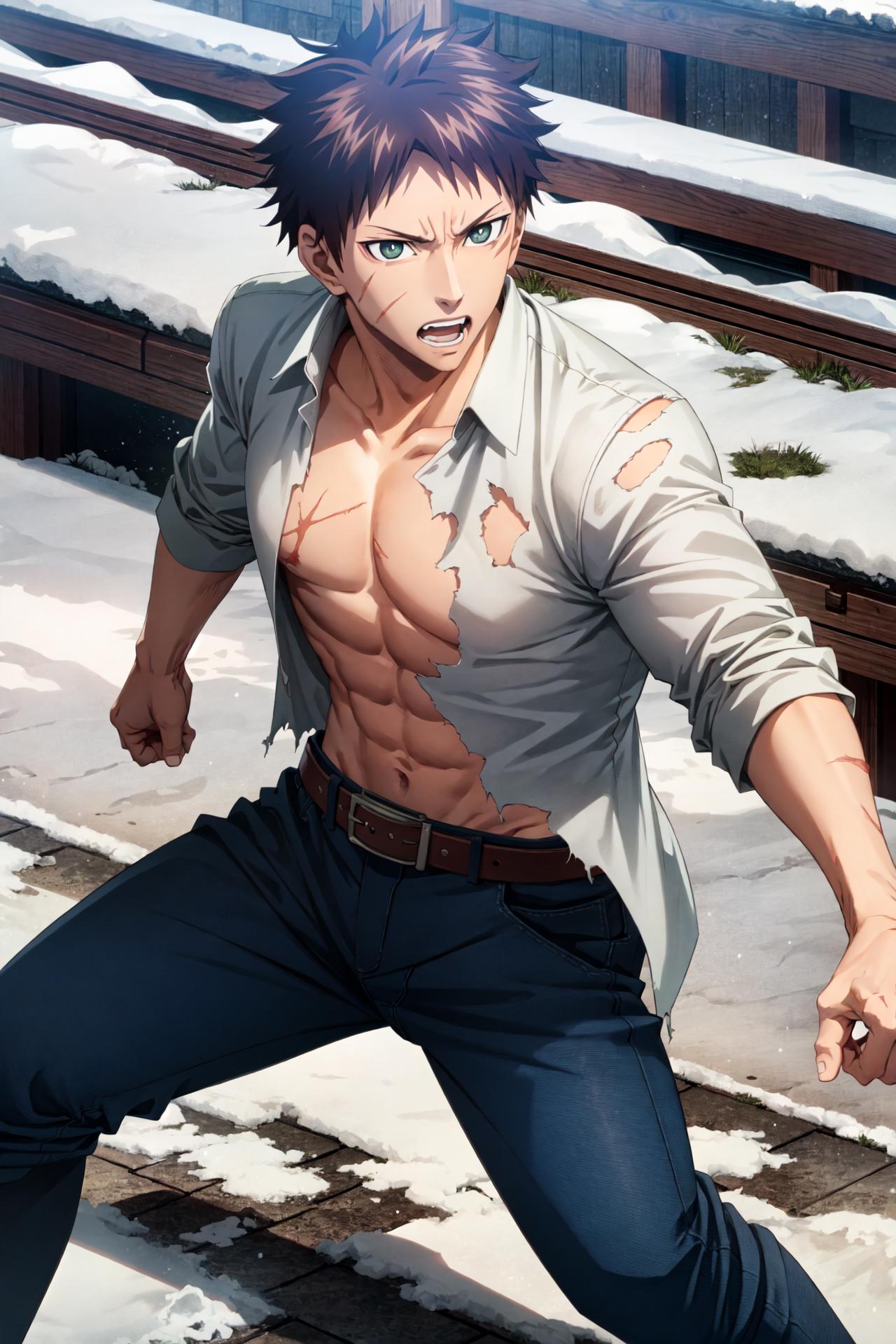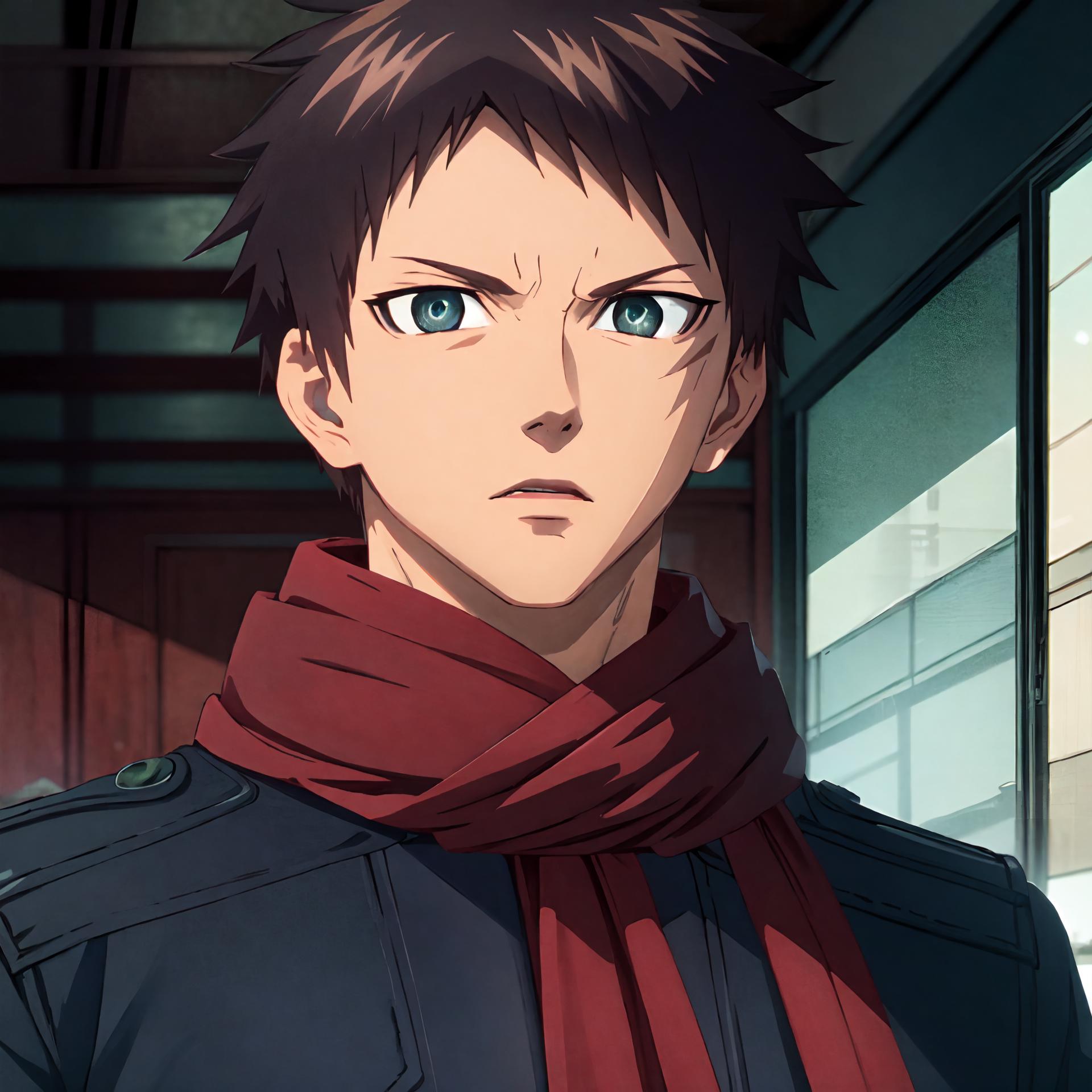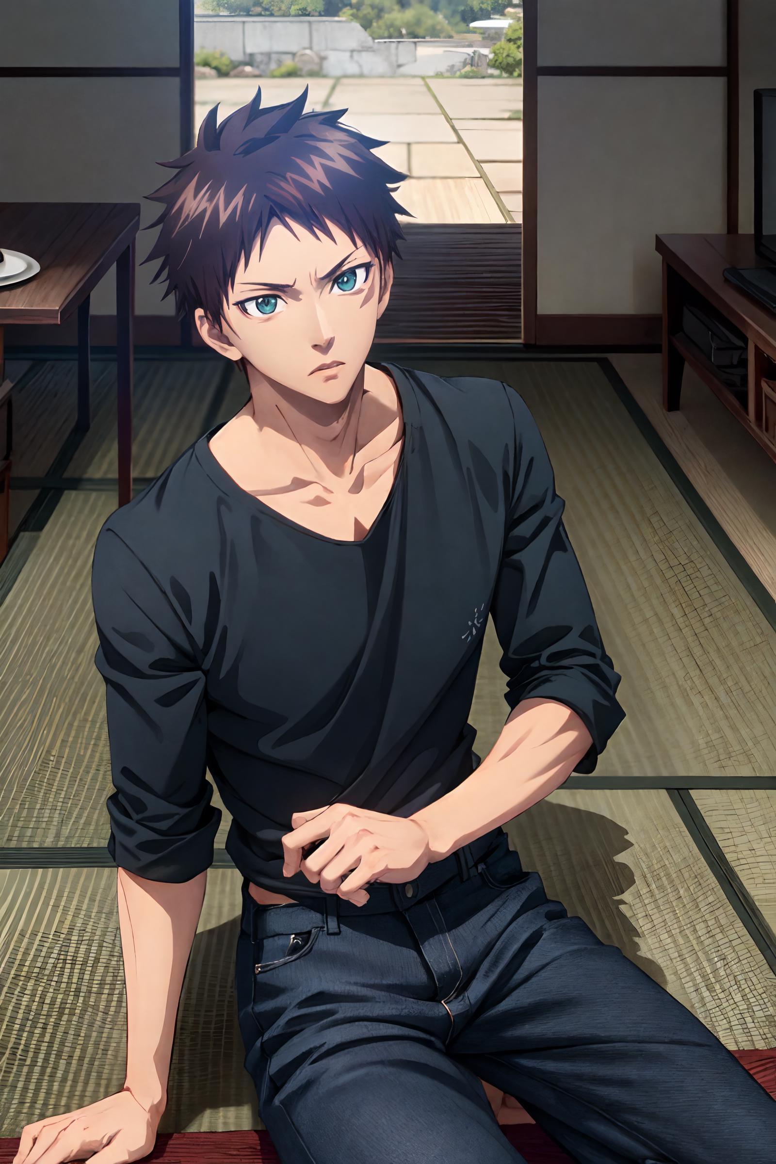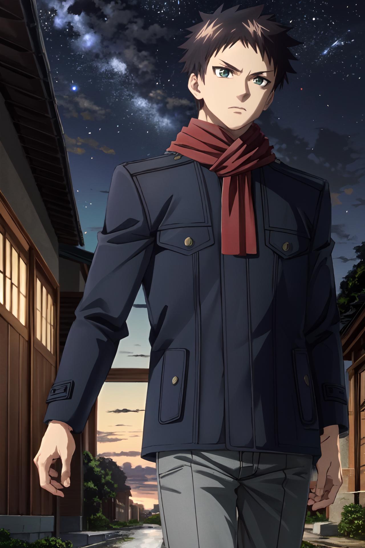 Required prompt: kunato hyouma\(mononogatari\), green eyes, blue eyes, brown hair,