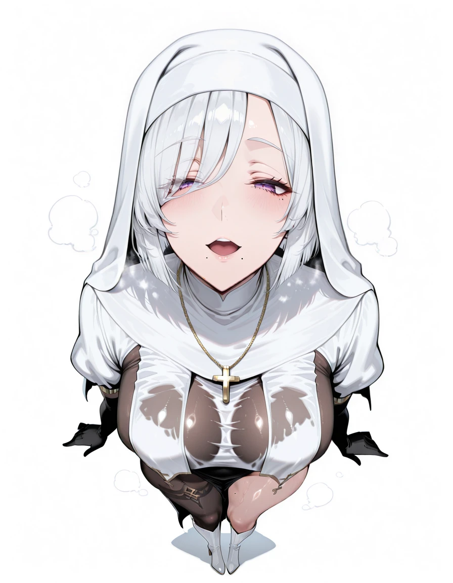 bob cut,white hair,mole,mole above eye,mole on leg,mole under mouth,large breasts,purple eyes,