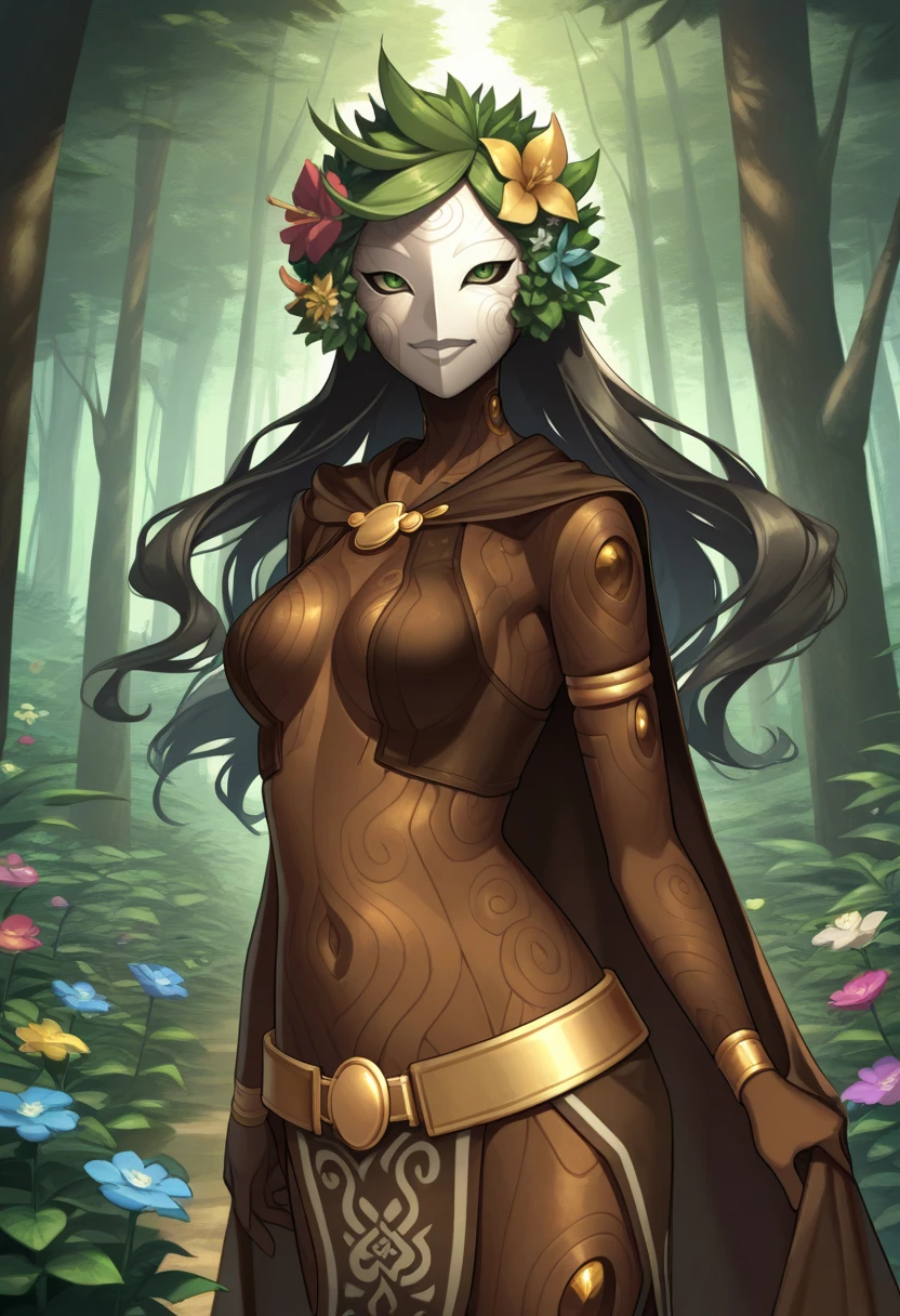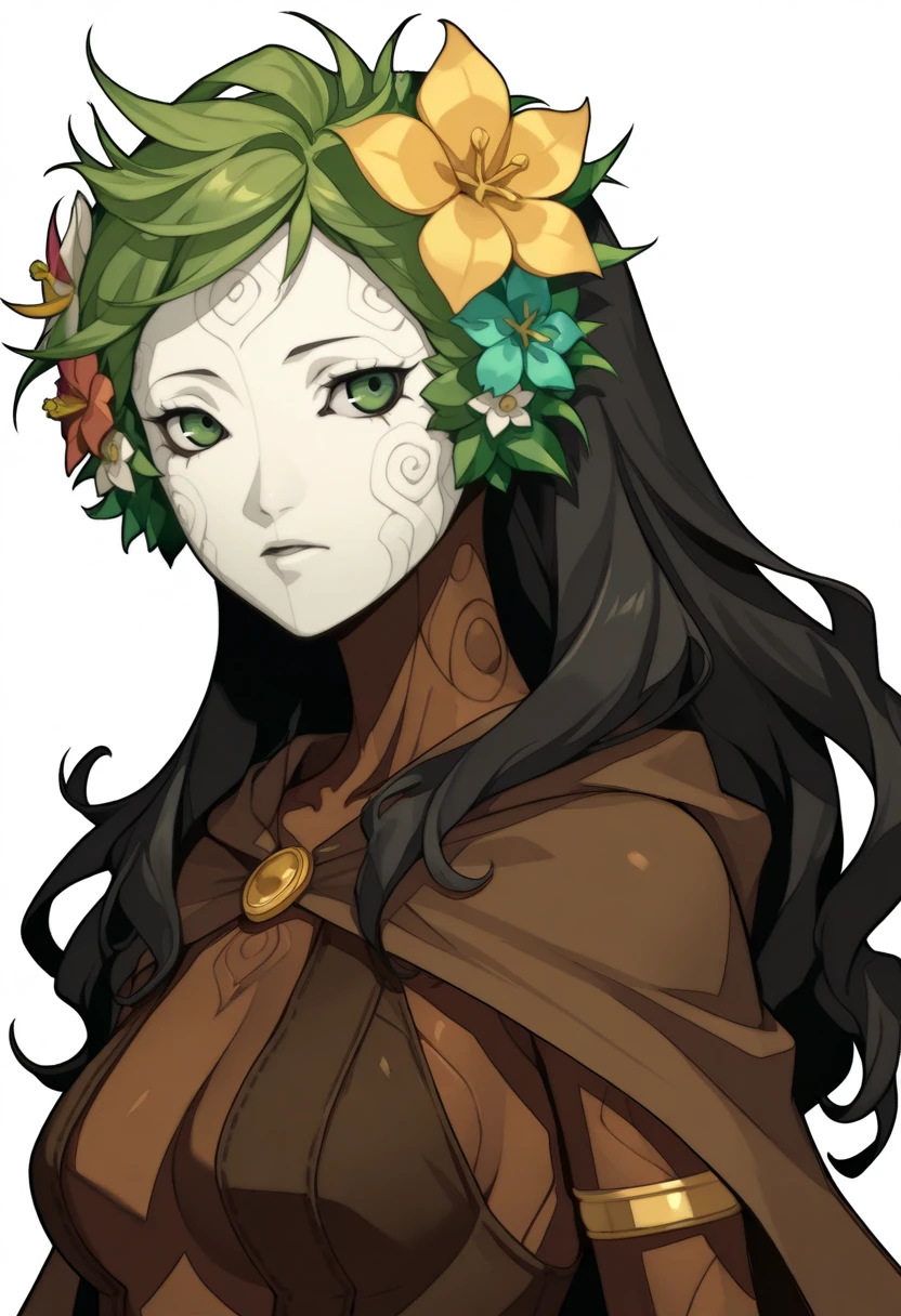 d4nusmt, monster girl, colored skin, brown skin, white face, hair flower, long hair, green hair, black hair, green eyes, brown dress, sleeveless, naval, cape, loincloth,