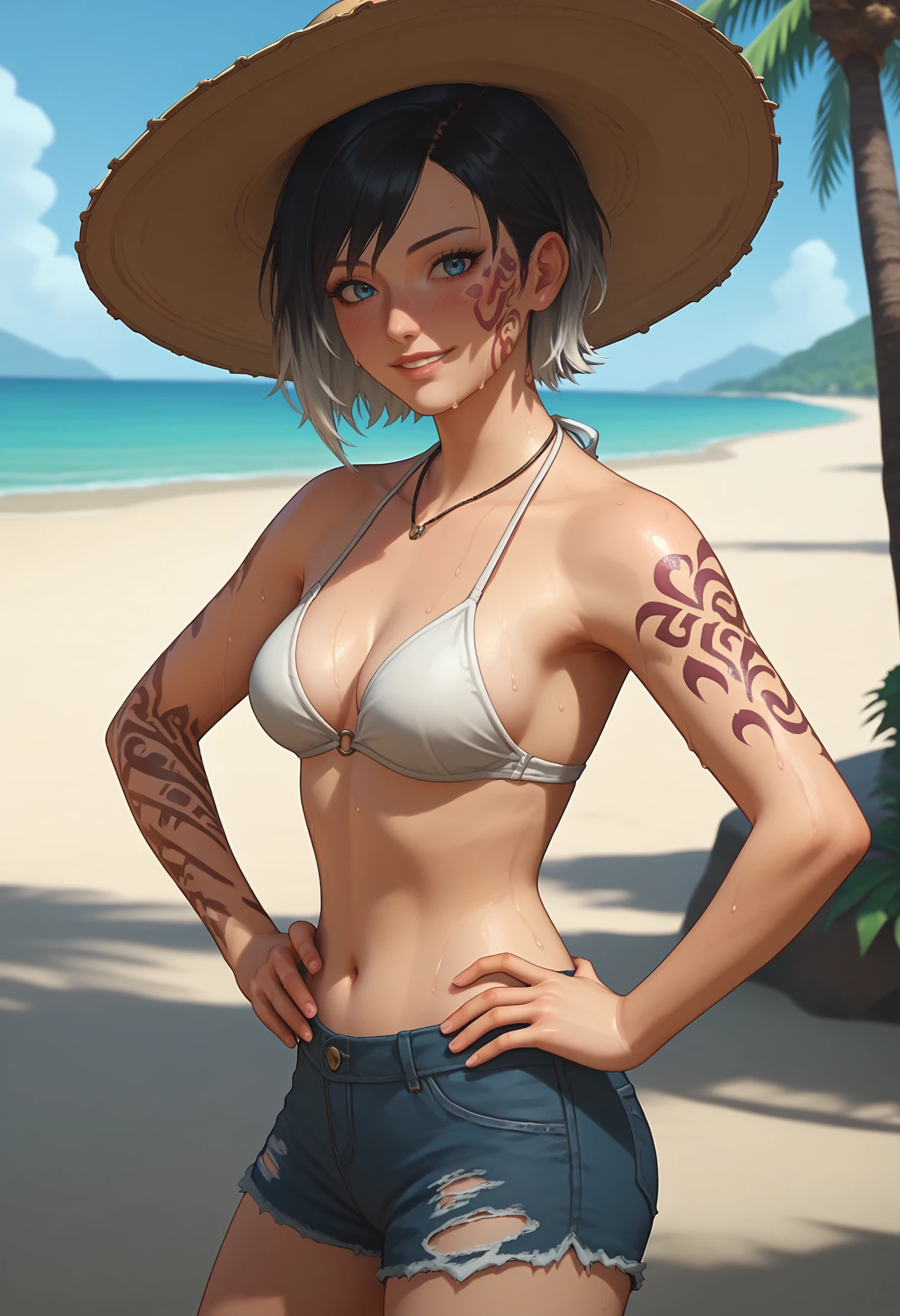 KJOpawn, short hair, black hair, multicolored hair, blue eyes, facial tattoo, arm tattoo,