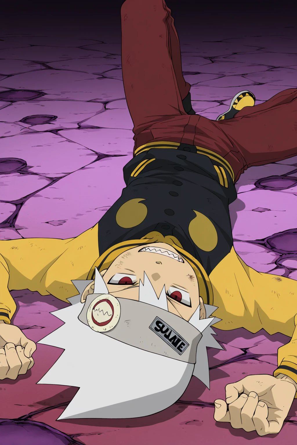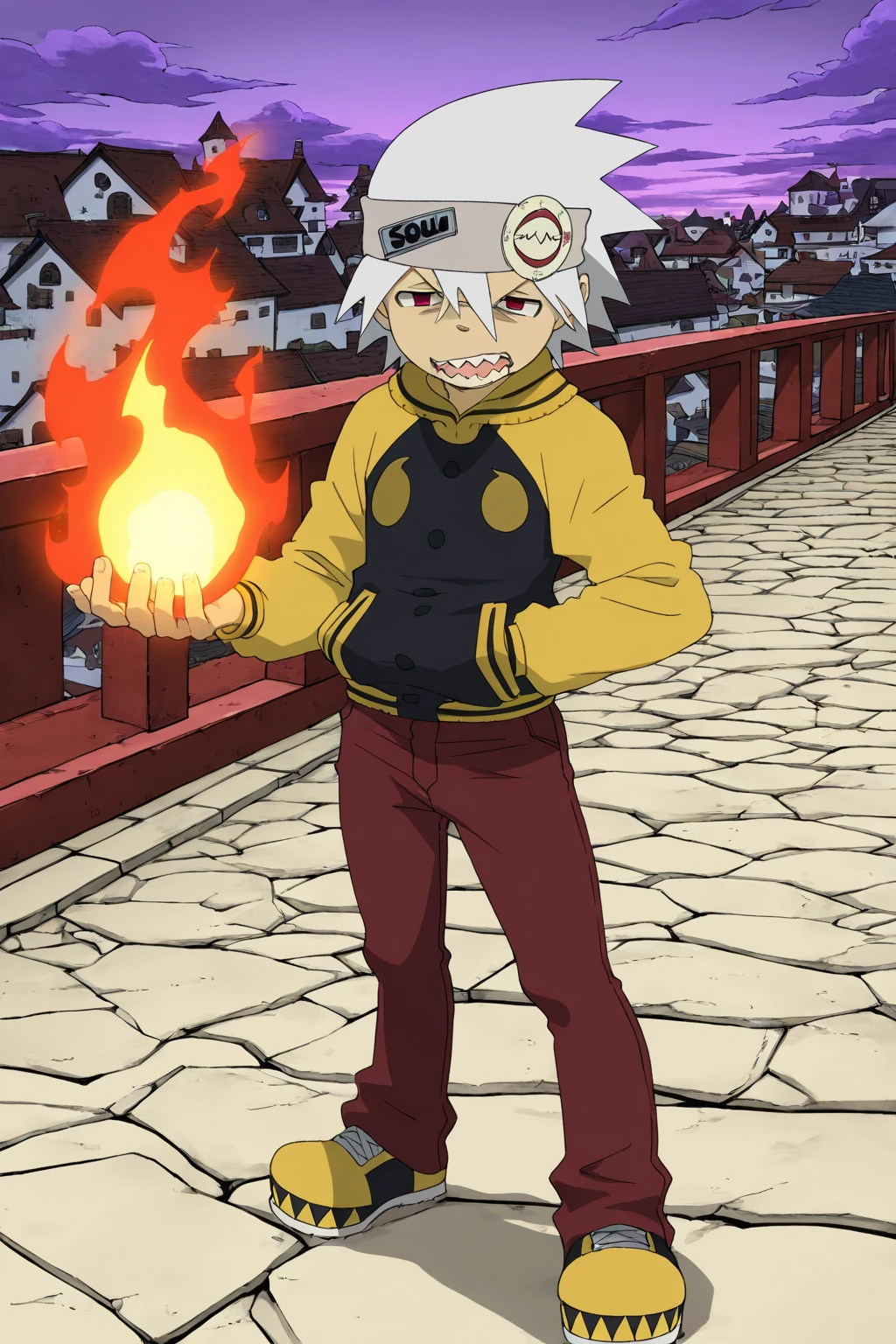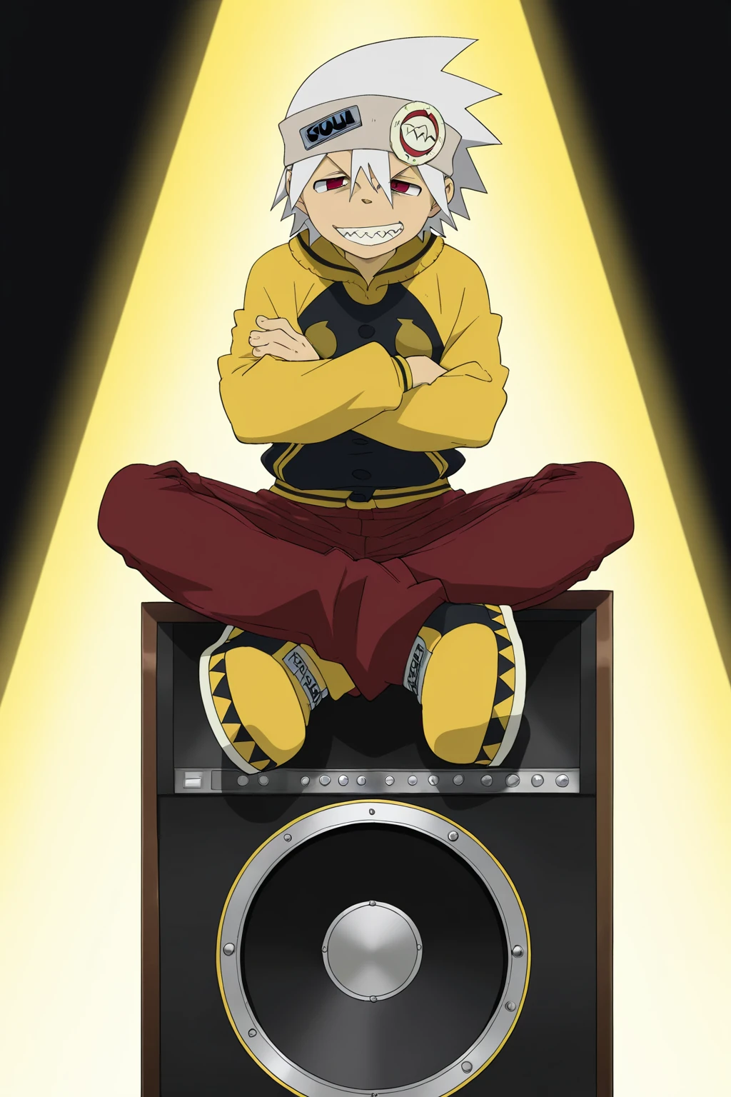 soul eater,1boy, white hair,spike hair,red eyes,sharp teeth,forehead protector,yellow long sleeves,red pants,yellow shoes
