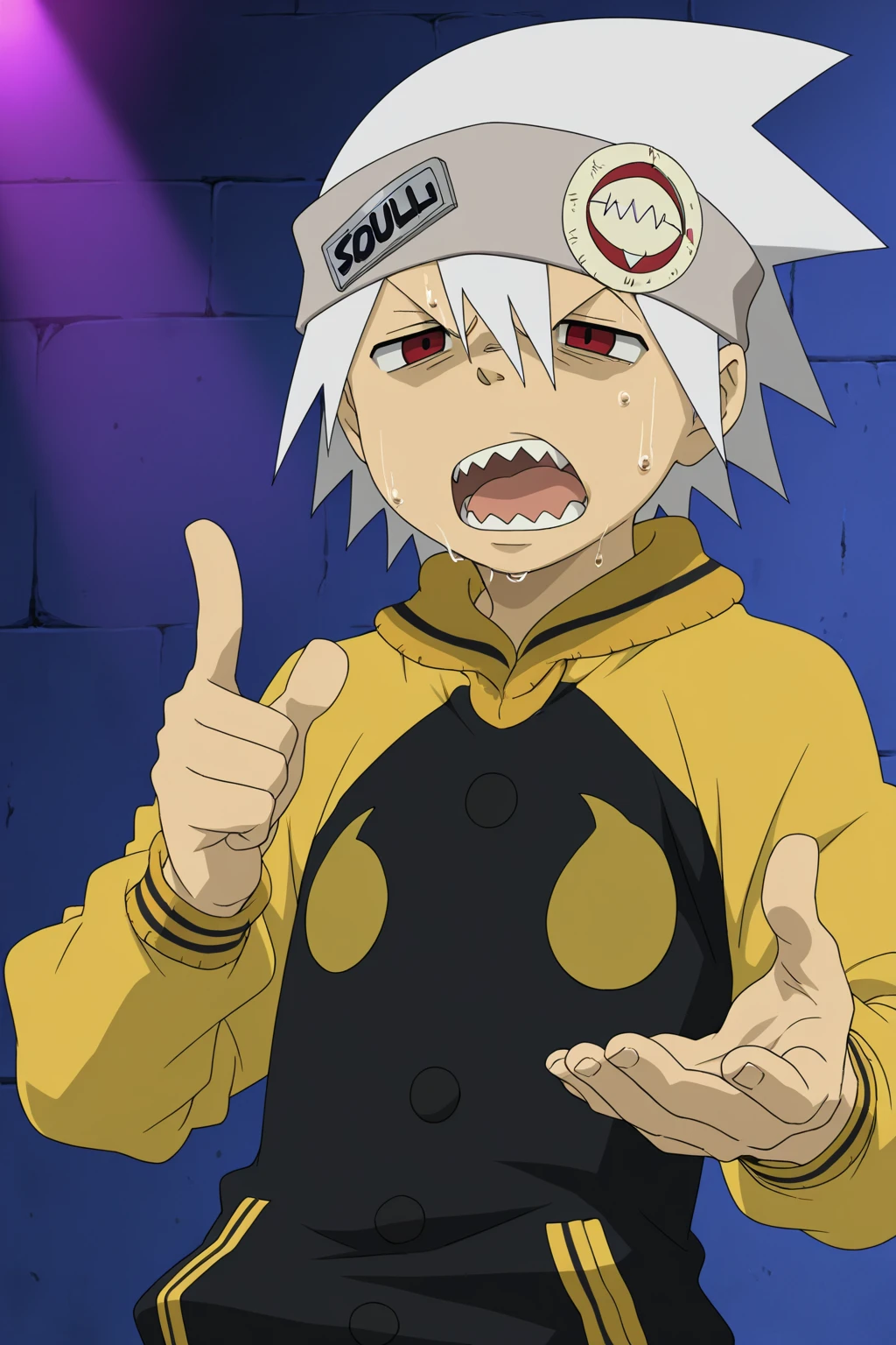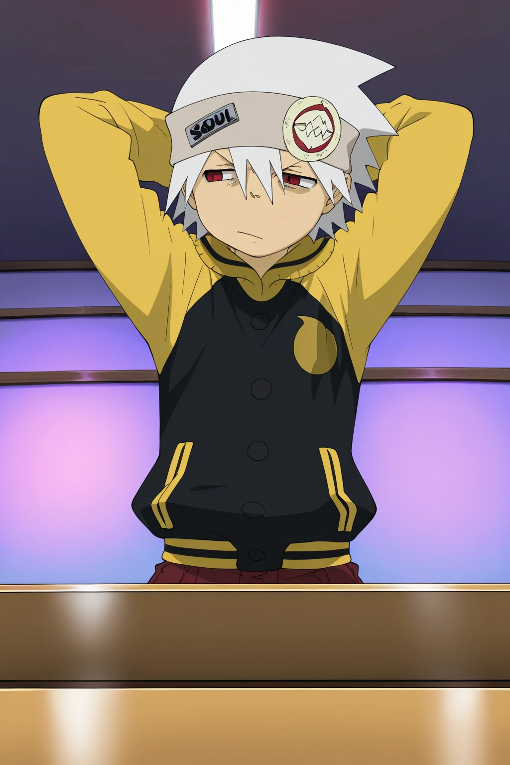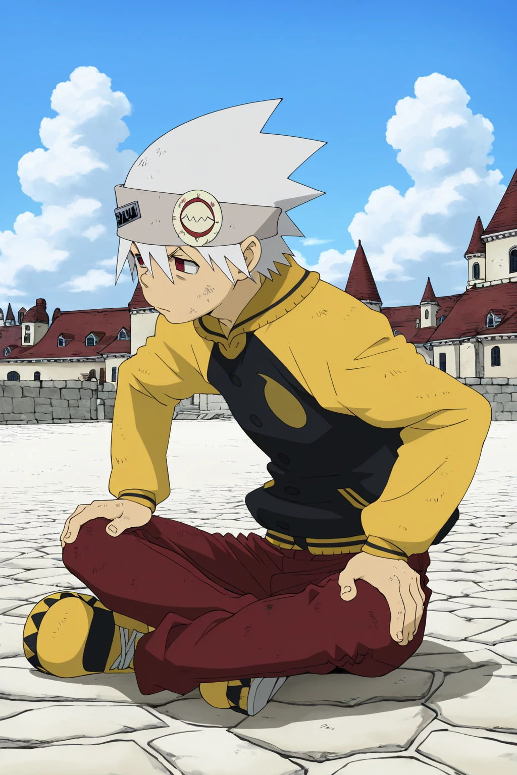 soul eater,1boy, white hair,spike hair,red eyes,sharp teeth,forehead protector,yellow long sleeves,red pants,yellow shoes