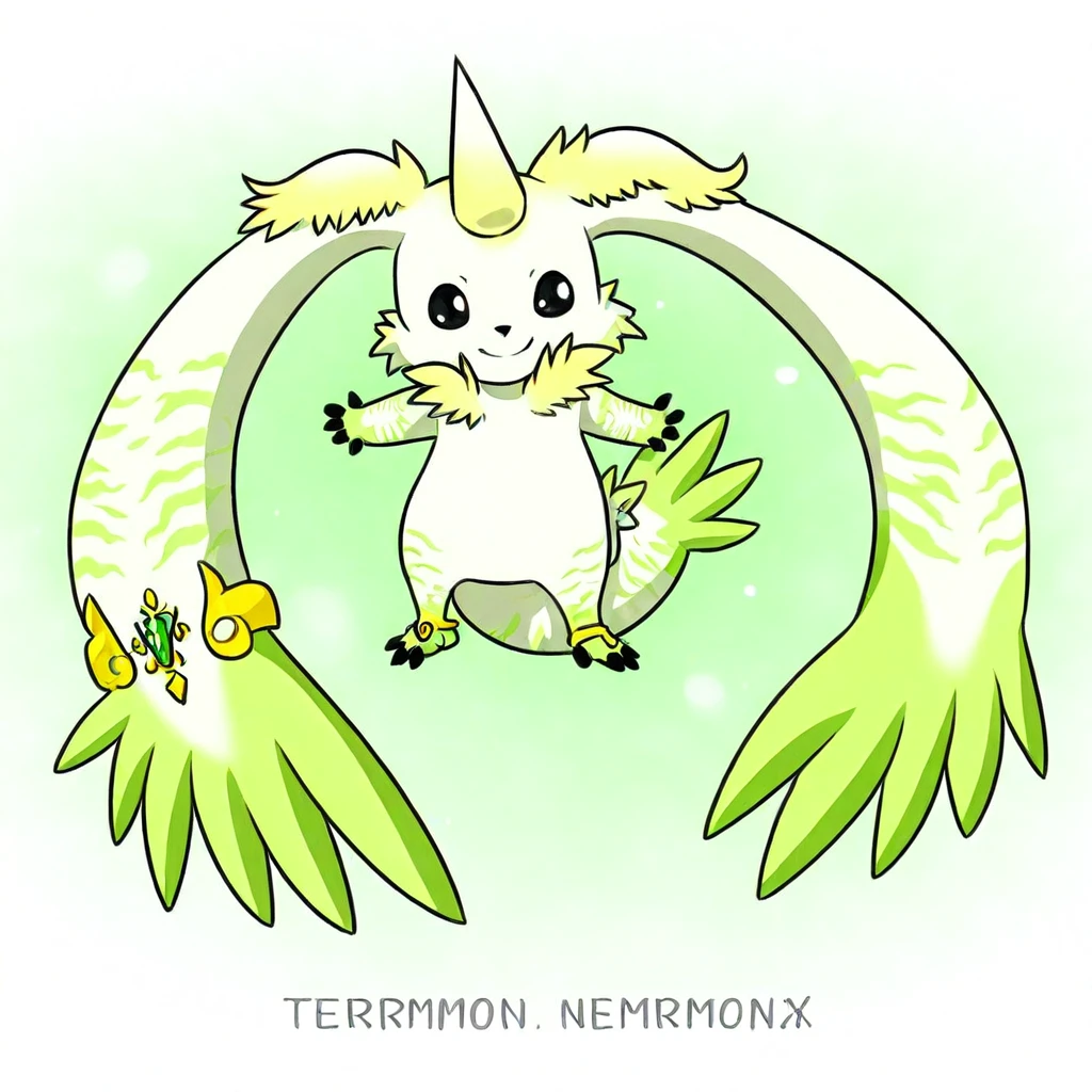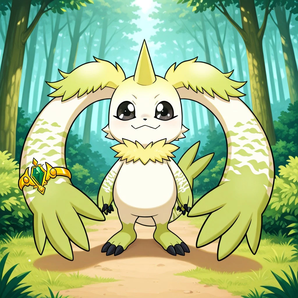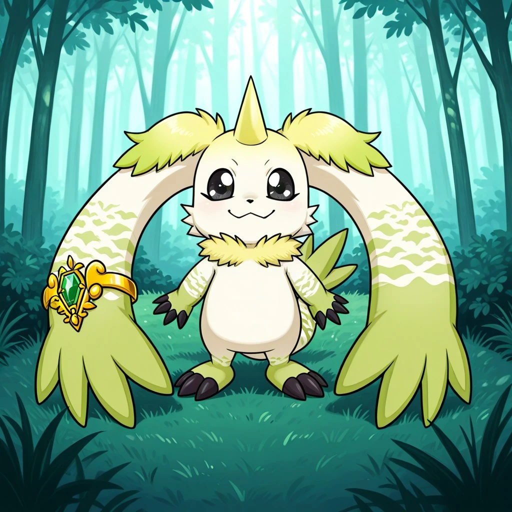digimon (creature), white and green fur, black eyes, long ears, black nose, single horn, fluffy tail, black fingers, black toes, jewelry, gem,