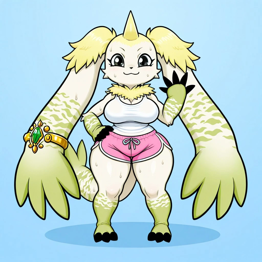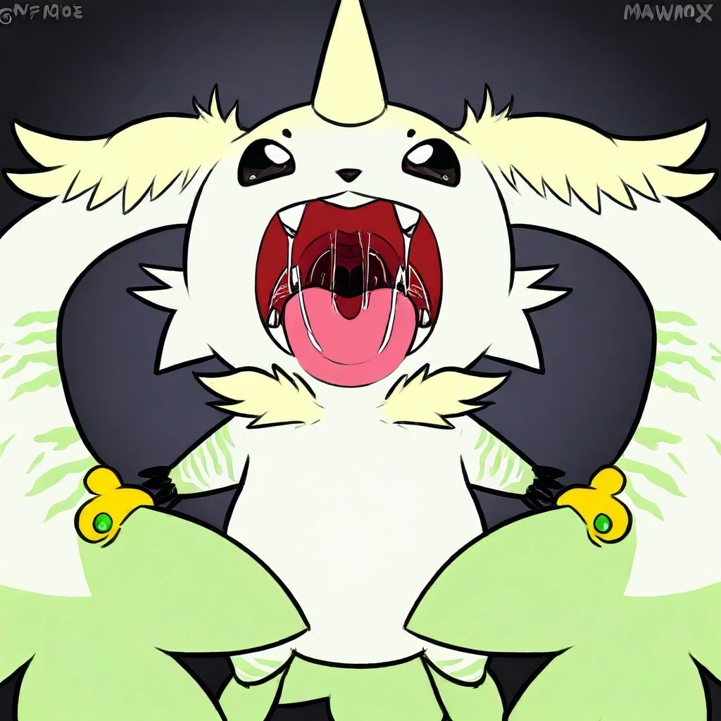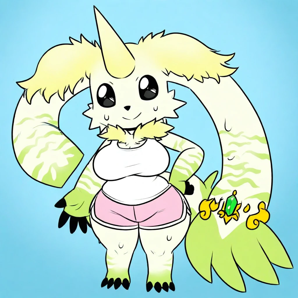 digimon (creature), white and green fur, black eyes, long ears, black nose, single horn, fluffy tail, black fingers, black toes, jewelry, gem,