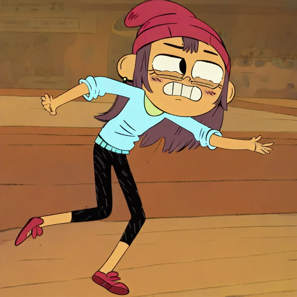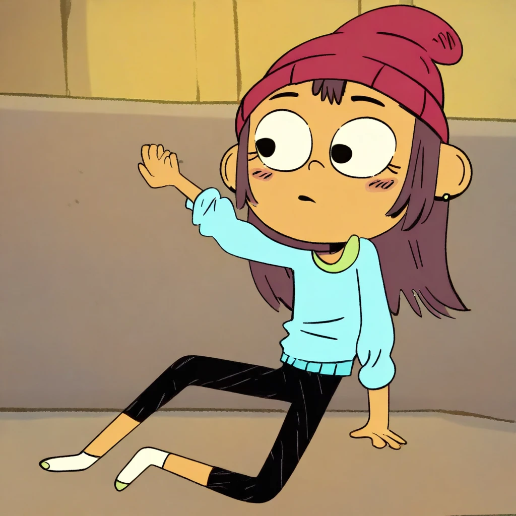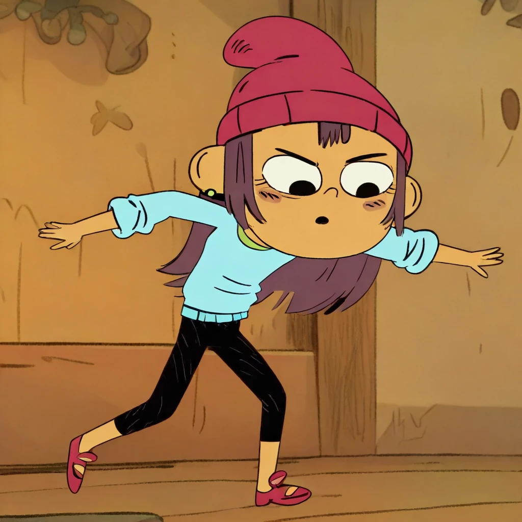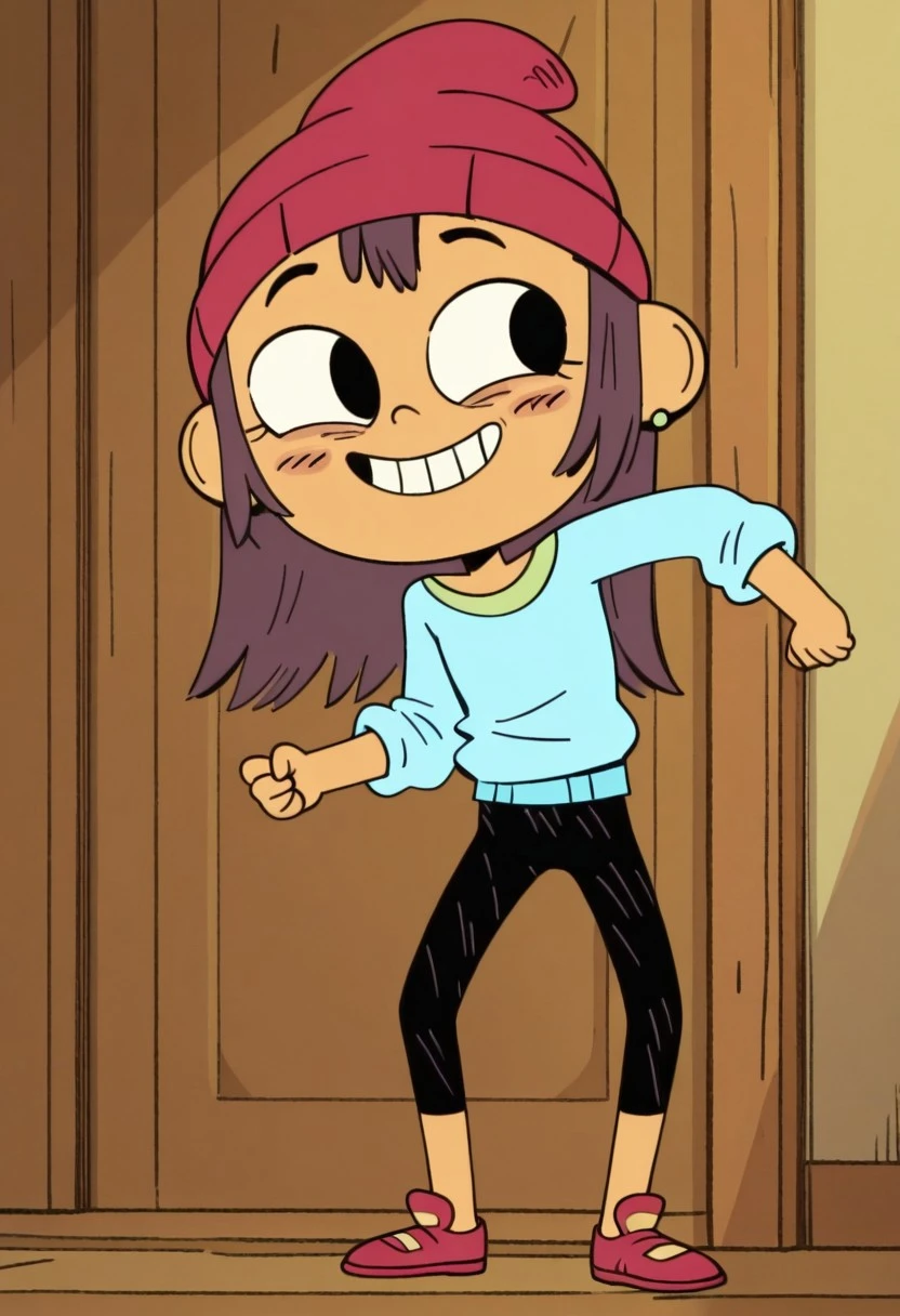 red beanie, long sleeved cyan shirt, black pants, green earrings, red shoes
