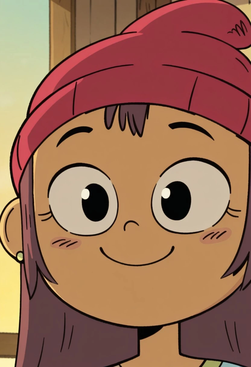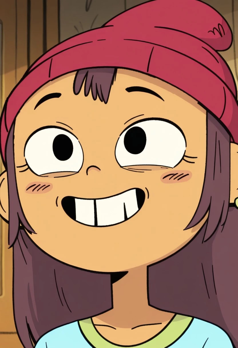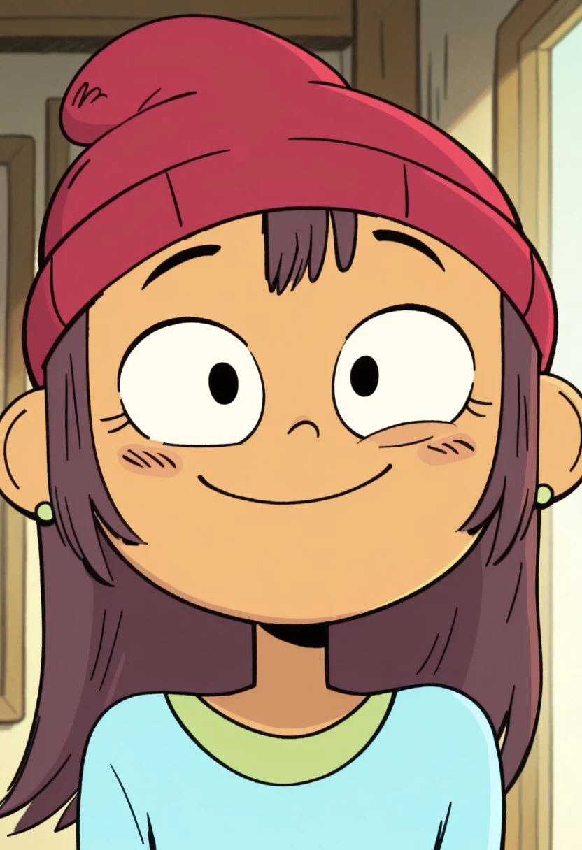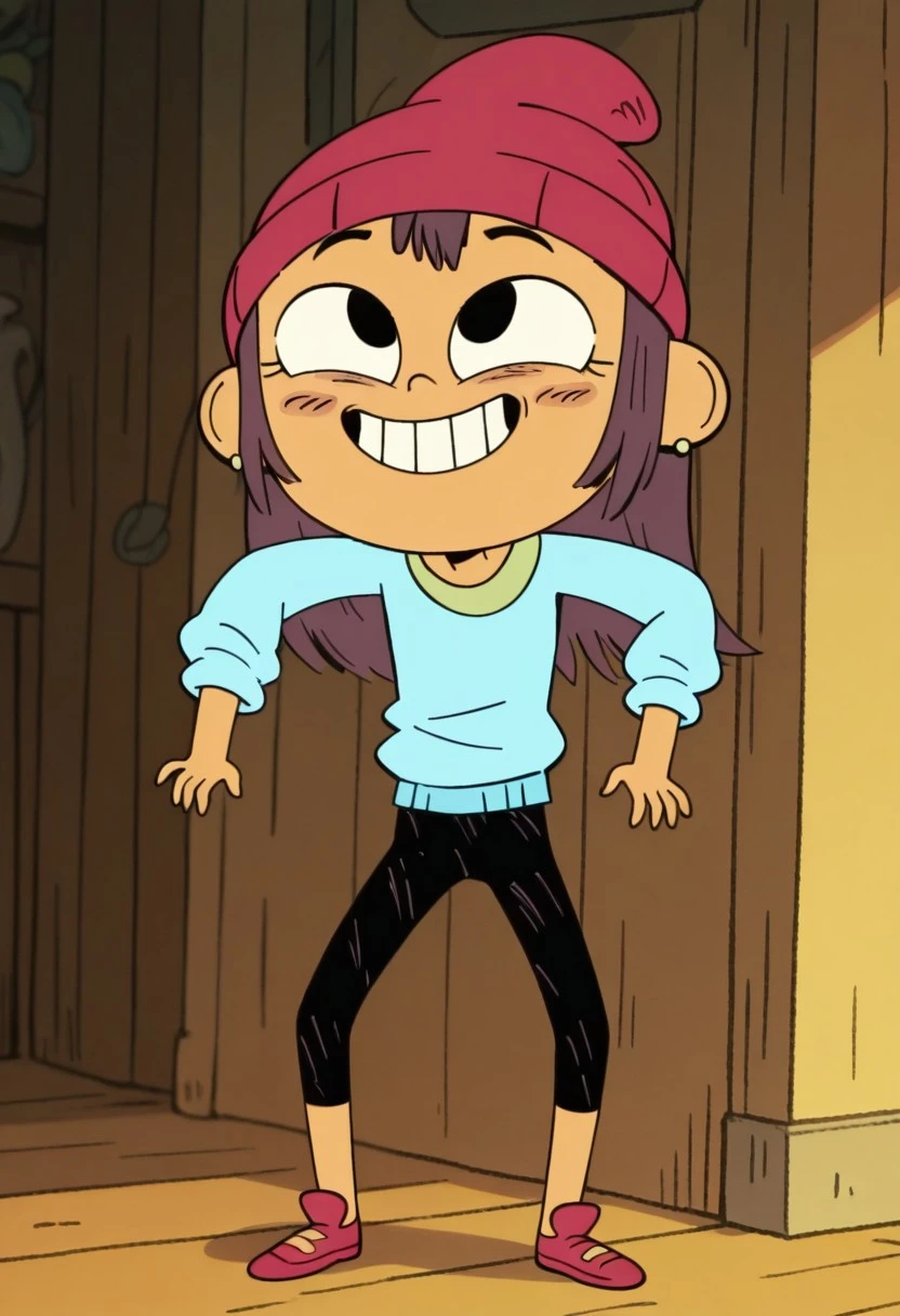 red beanie, long sleeved cyan shirt, black pants, green earrings, red shoes