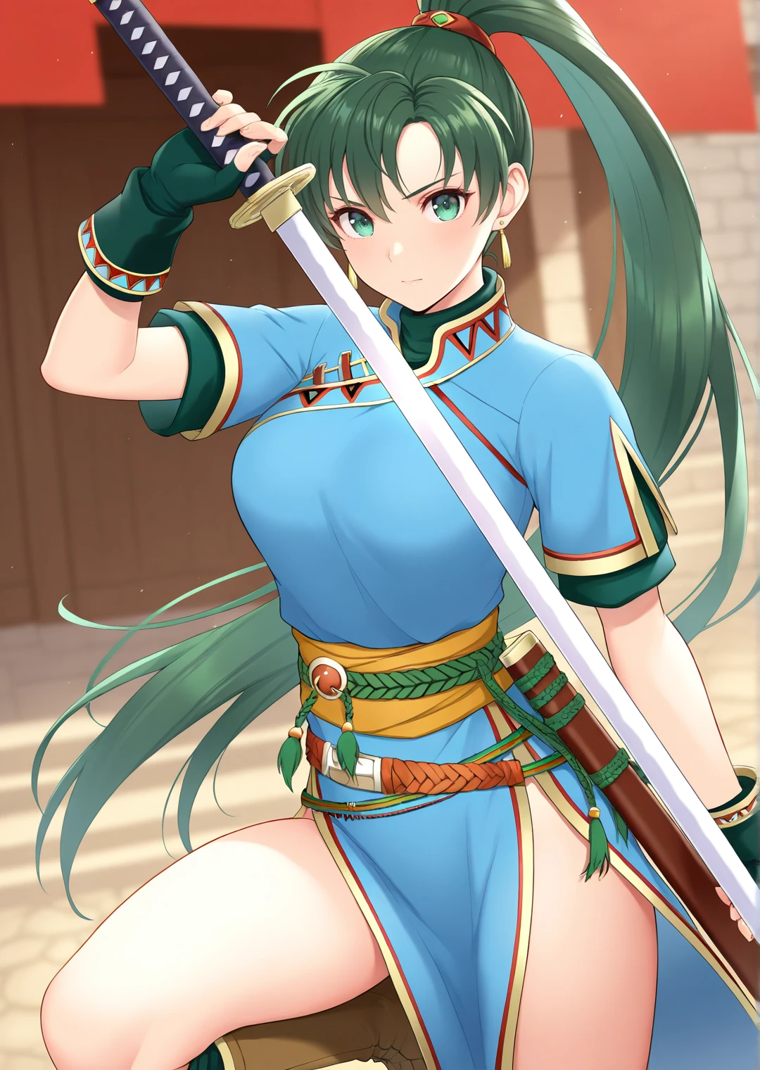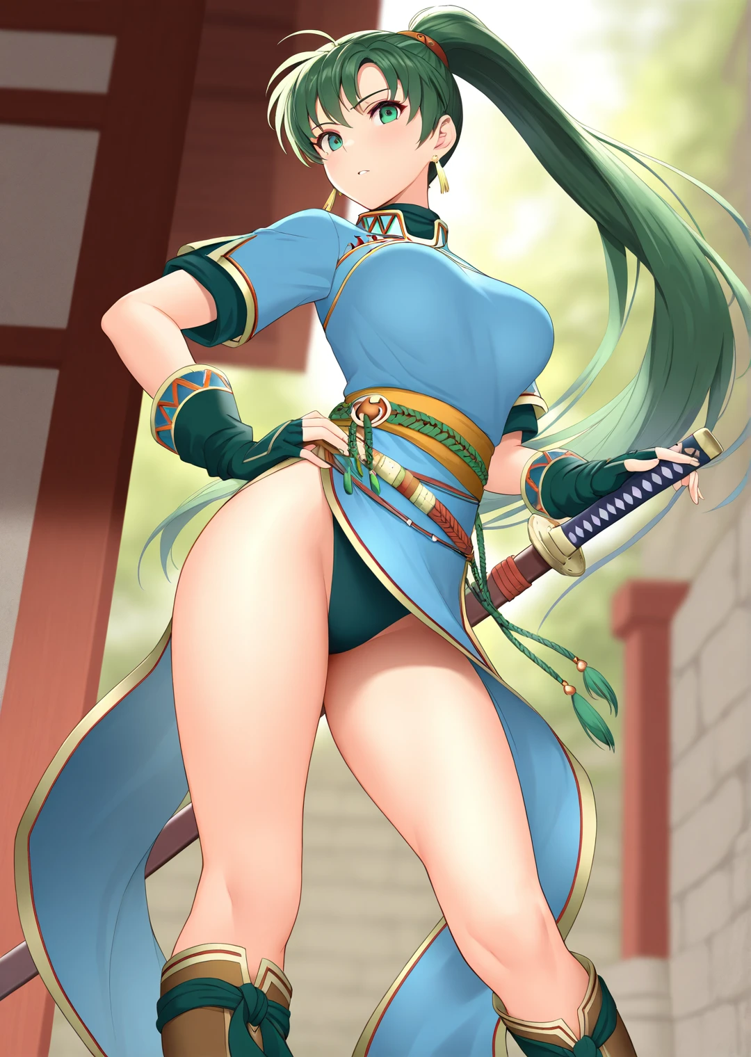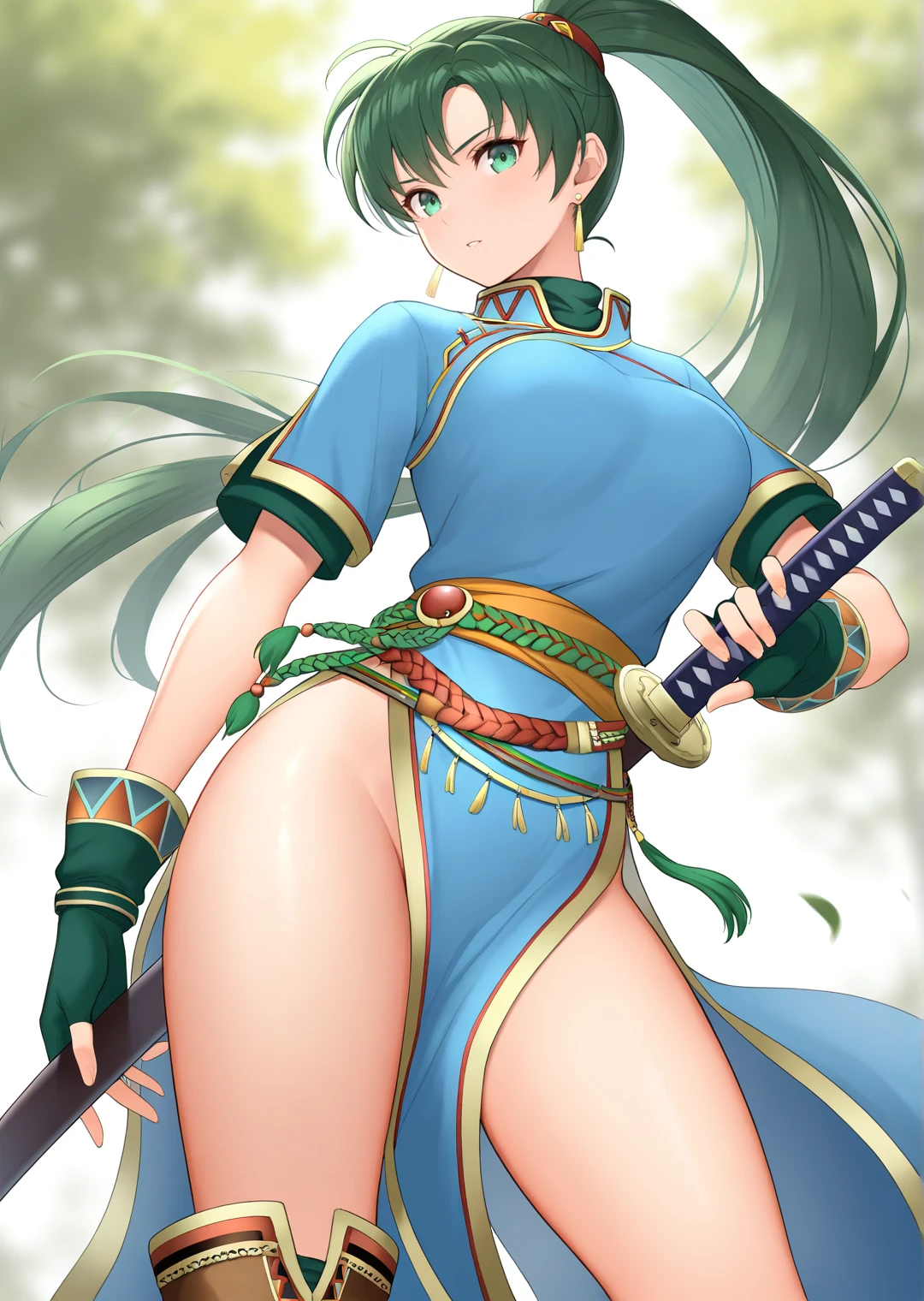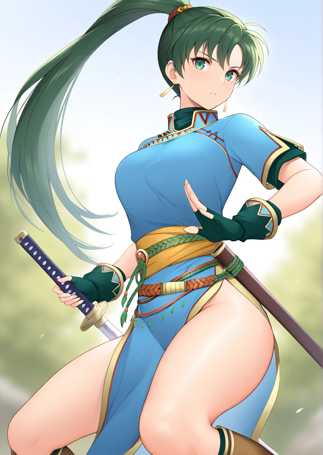lyn_fire_emblem, 1girl, solo, long hair, green hair, green eyes, high ponytail, medium breasts