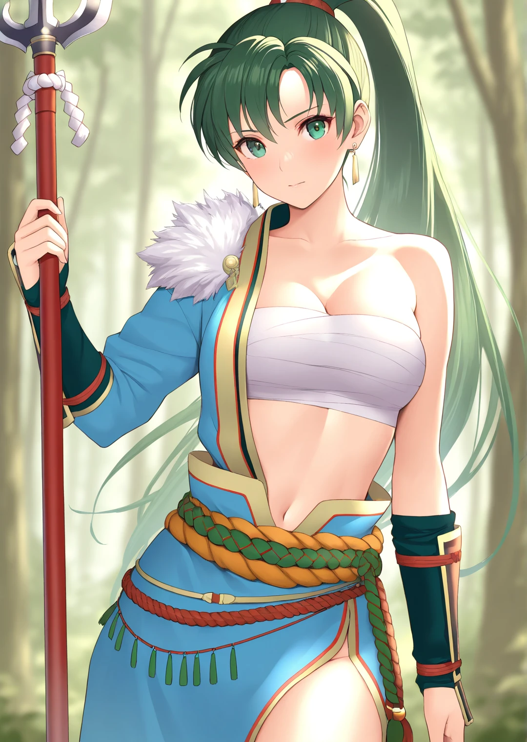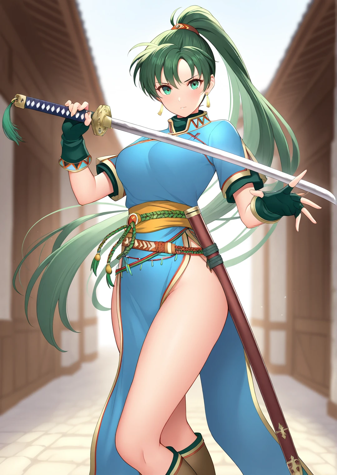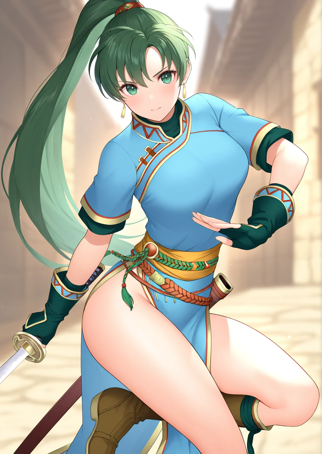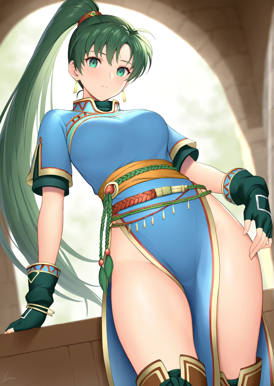lyn_fire_emblem, 1girl, solo, long hair, green hair, green eyes, high ponytail, medium breasts