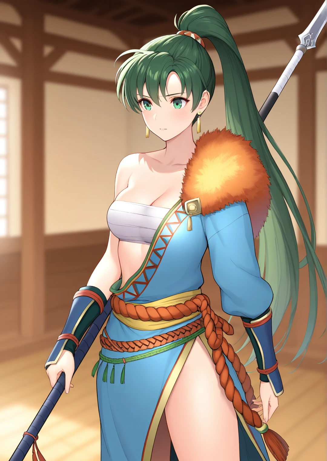 navel, cleavage, japanese clothes, belt, earrings, midriff, blue dress, strapless, spear, sarashi, bandeau, vambraces, tube top, shimenawa, single bare shoulder, chest sarashi, single sleeve, rope belt, fur trim