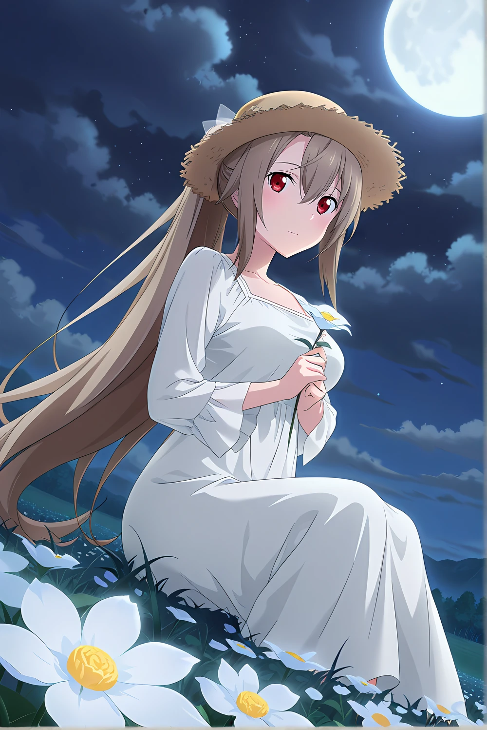 eydis_(character), 1girl, brown hair, red eyes, ponytail, hair between eyes, very long hair, bow, hair bow