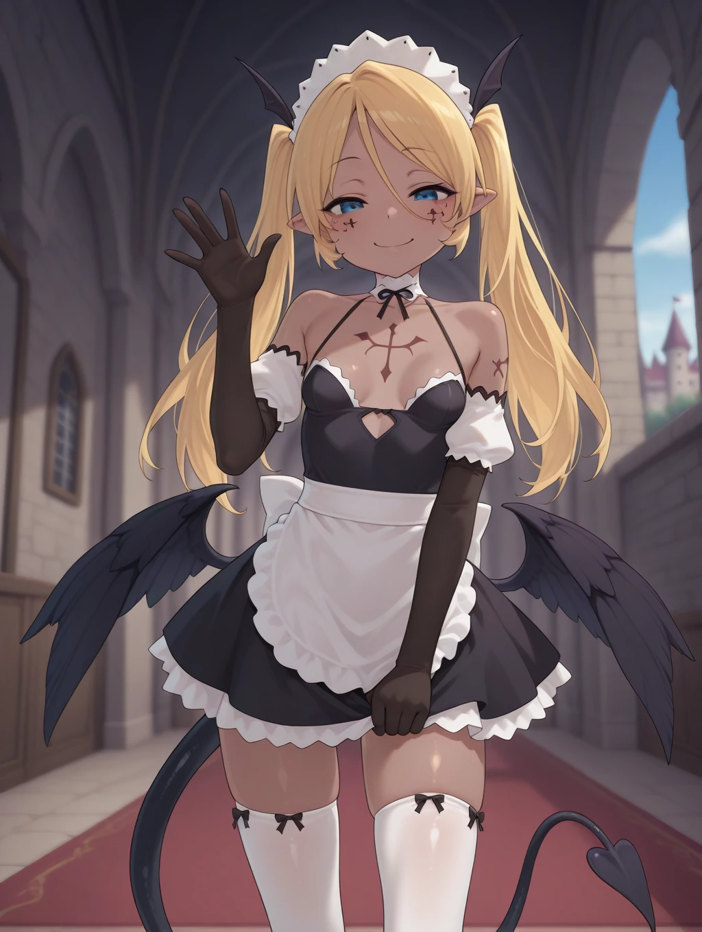 Lilithm, blonde hair, long hair, twintails, pointy ears, blue eyes, small breasts, body tattoo, facial mark, dark skin, white thighhighs, black elbow gloves, detached sleeves, ????, head accesory, demon tail, succubus, wings, black wings, low wings,