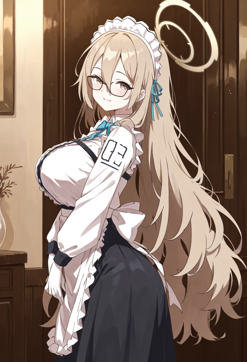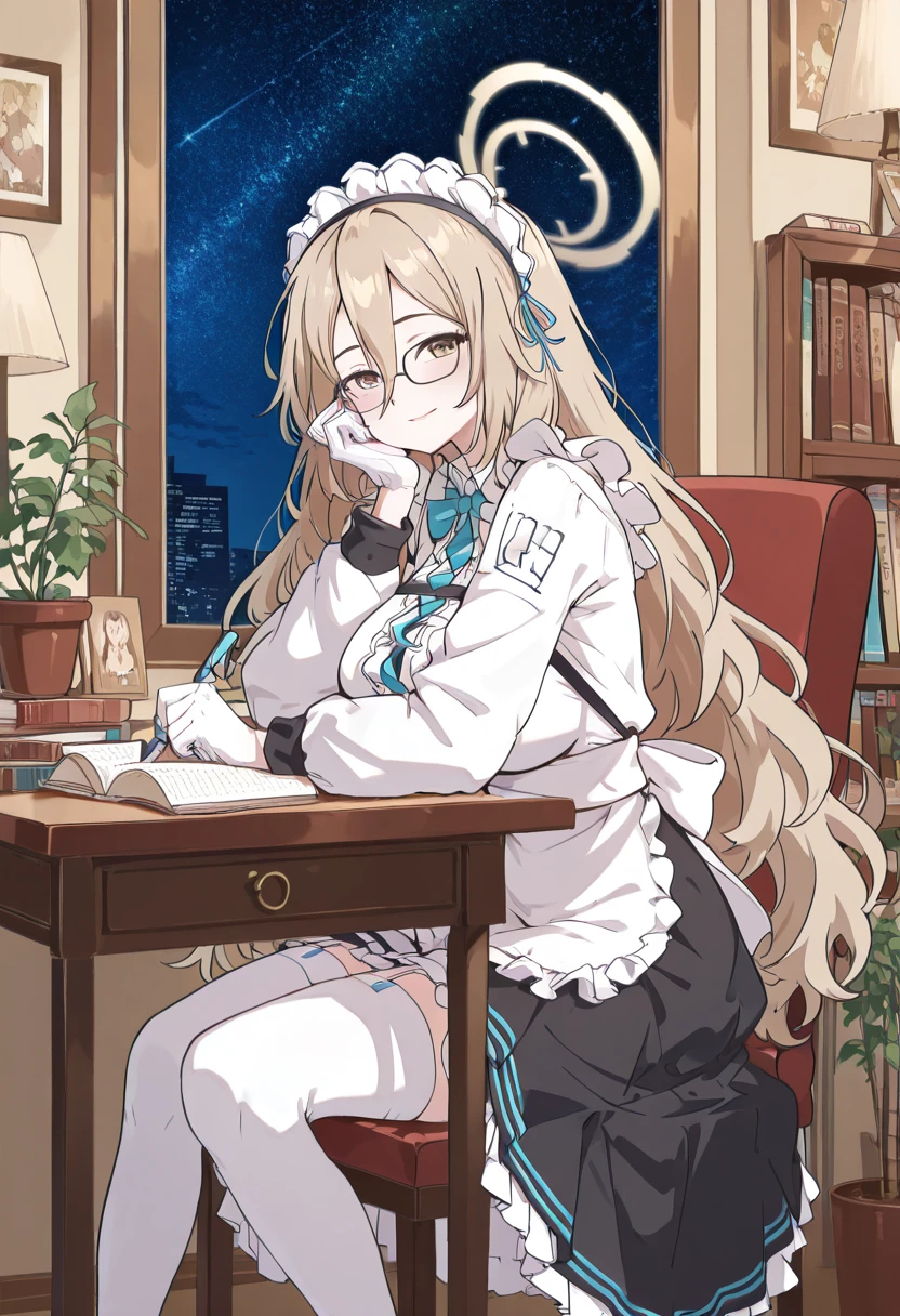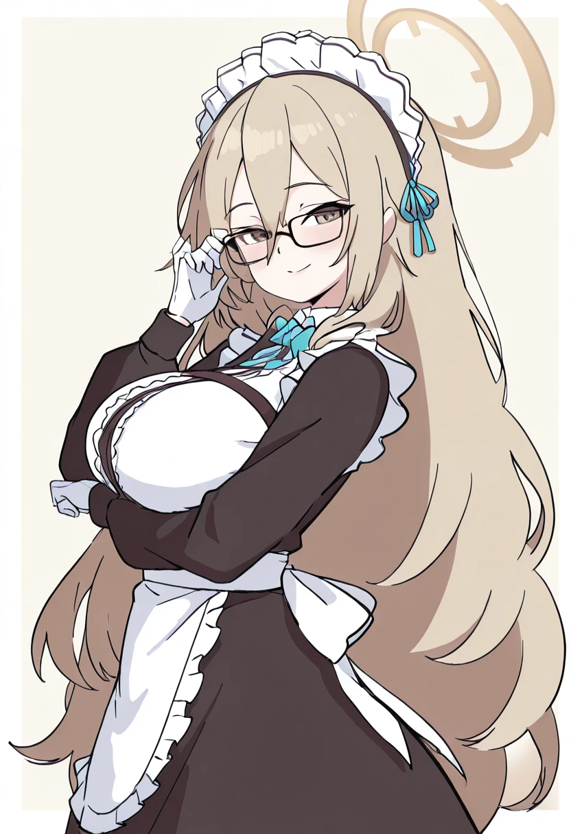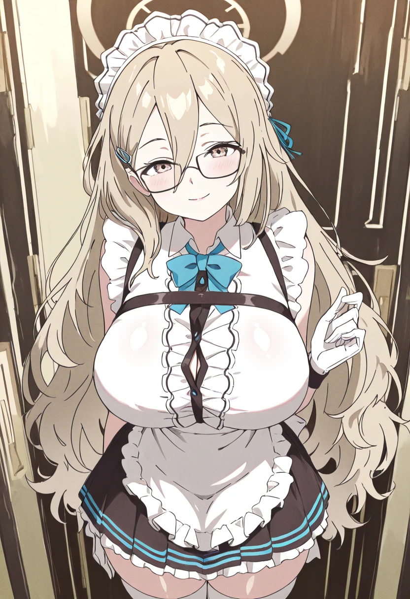 zzAkane, brown eyes, hair between eyes, brown halo, hair ornament, light brown hair, long hair, glasses, black dress, maid apron, white gloves, blue bowtie, white thighhighs,