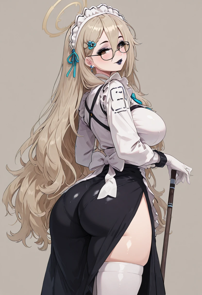 glasses, black dress, maid apron, white gloves, blue bowtie, white thighhighs,