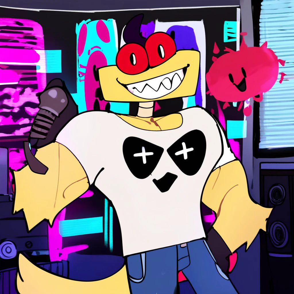 Common Wubbox - wubbox, yellow body, red eyes, red eyelids, grey eye socket, gold teeth, blue electricity, blue energy core, blue orbs, grey hands, purple connectors