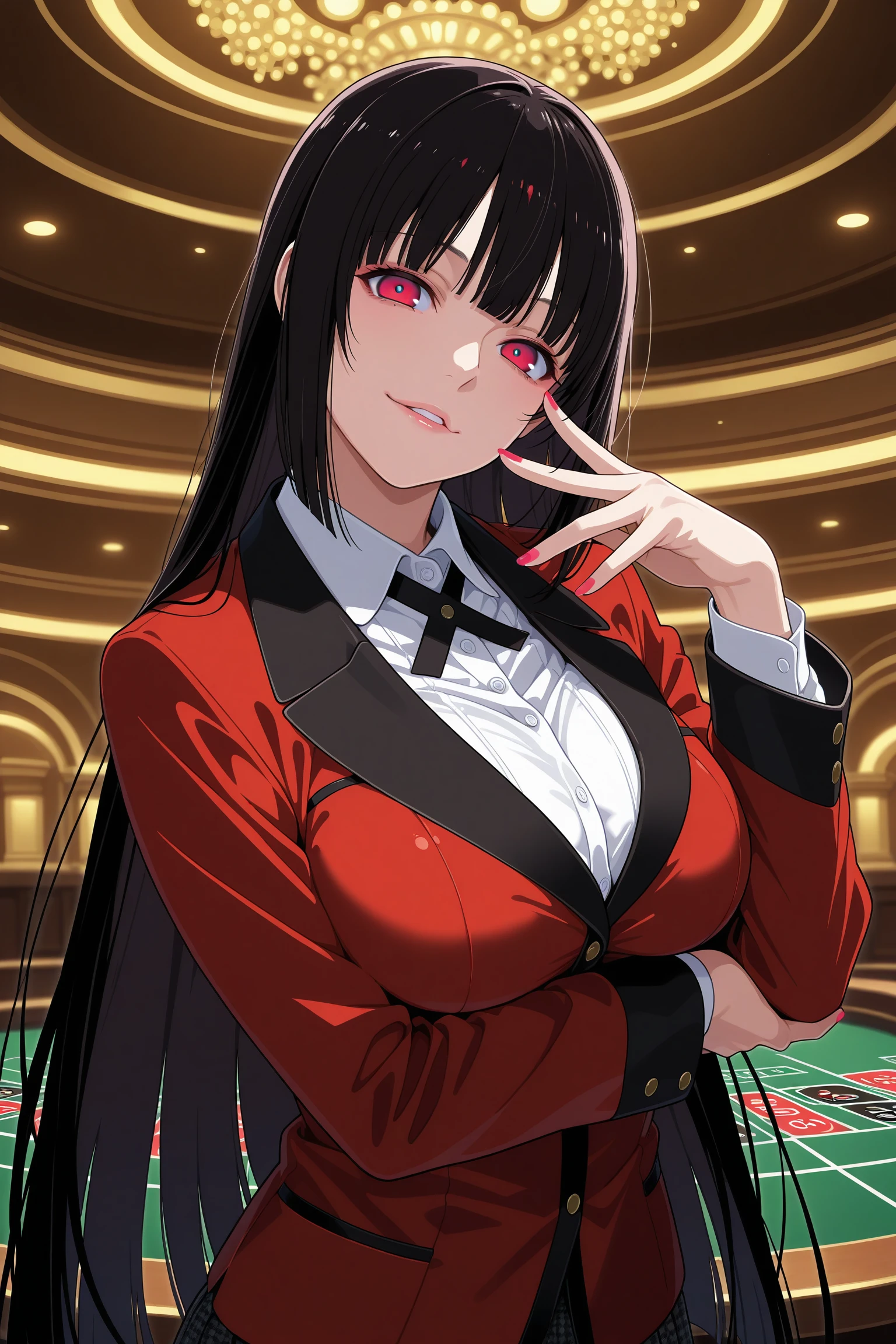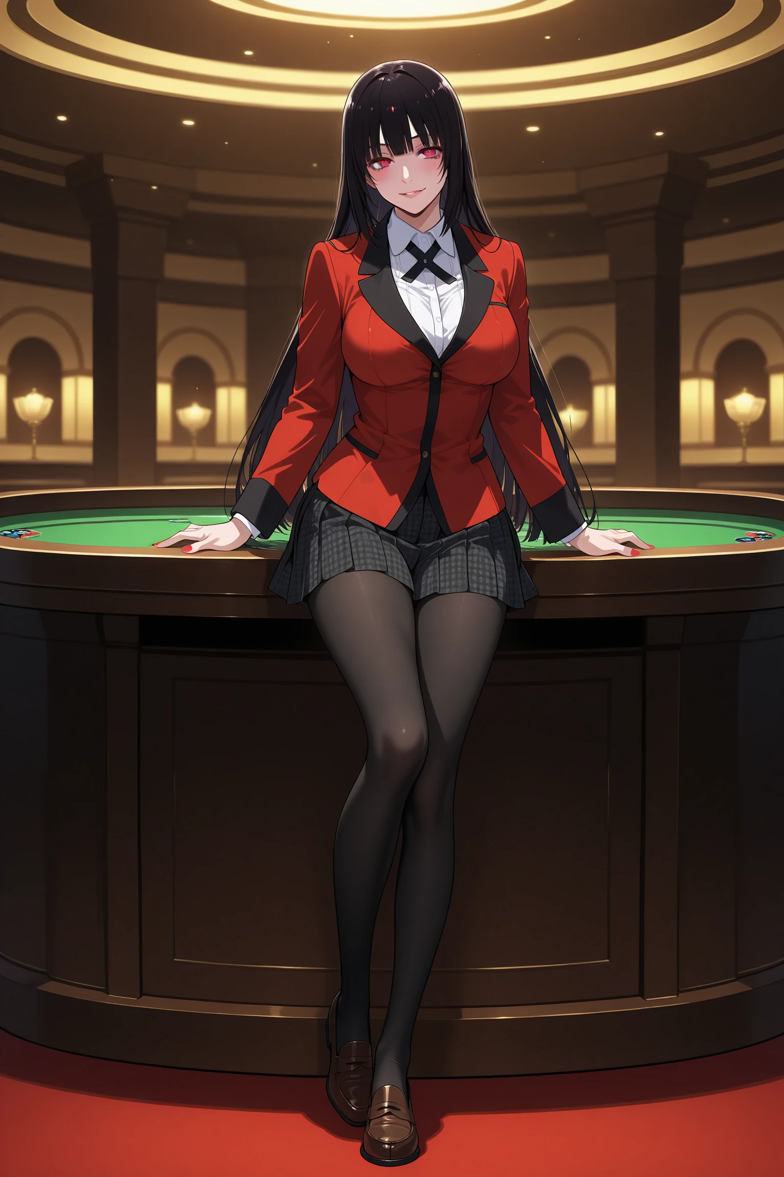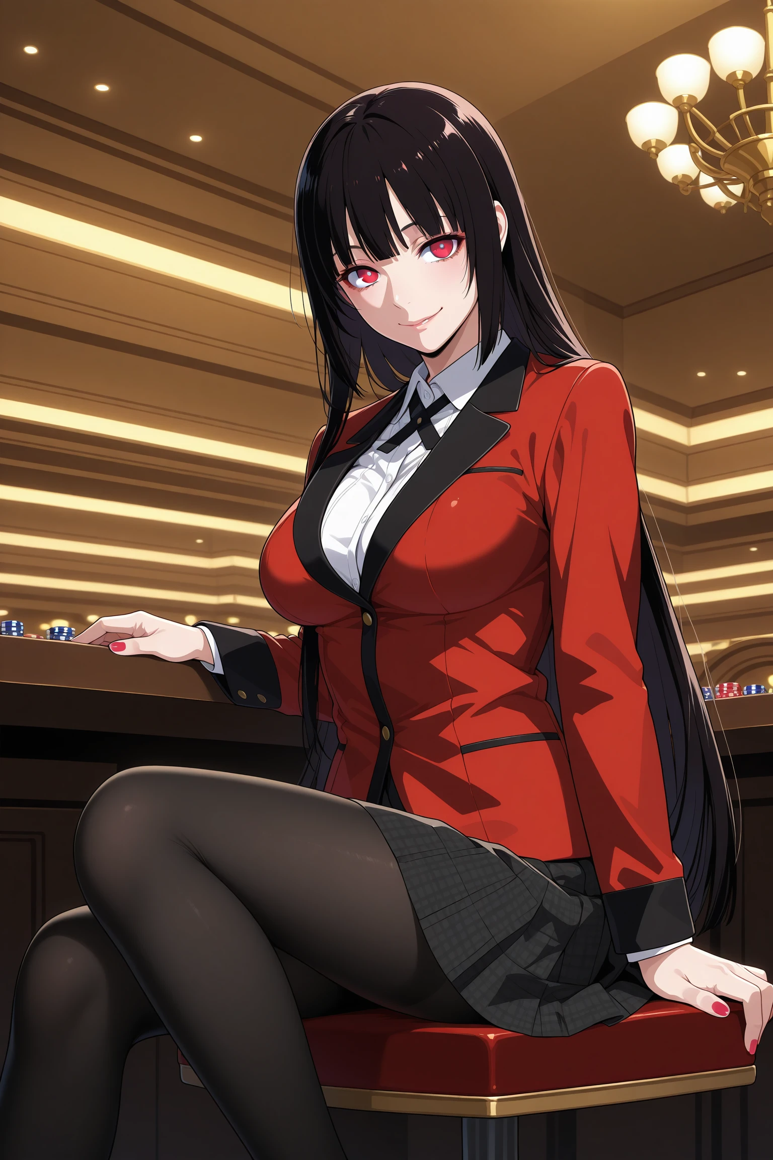 jabami yumeko, long hair, black hair, bangs, himecut, red eyes, hyakkaou academy school uniform, long sleeves, red nails, nail poilsh, blazer, red jacket, suit jacket, white shirt, collared shirt, black neck ribbon, black skirt, plaid skirt, pleated skirt, black pantyhose, loafersDescription