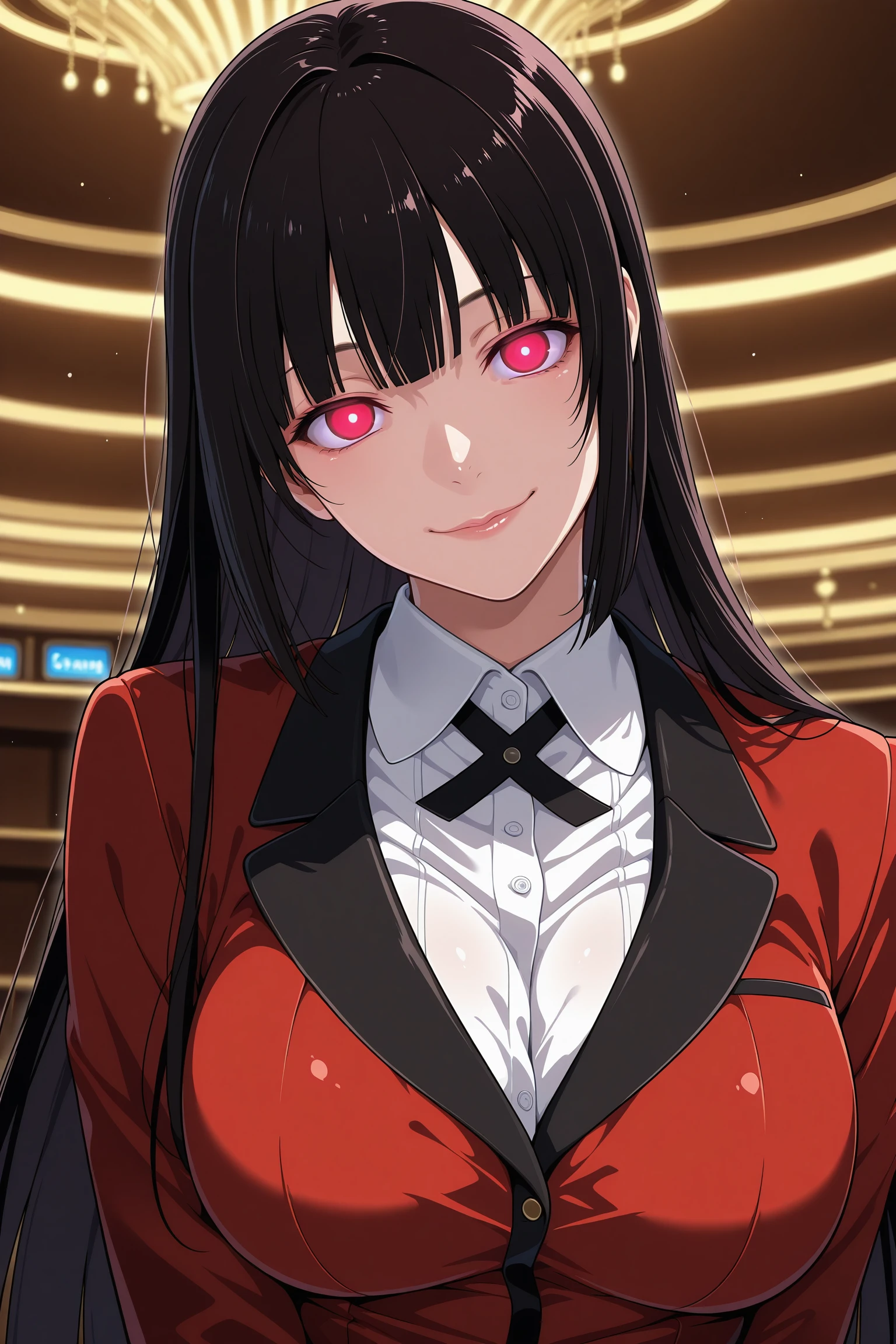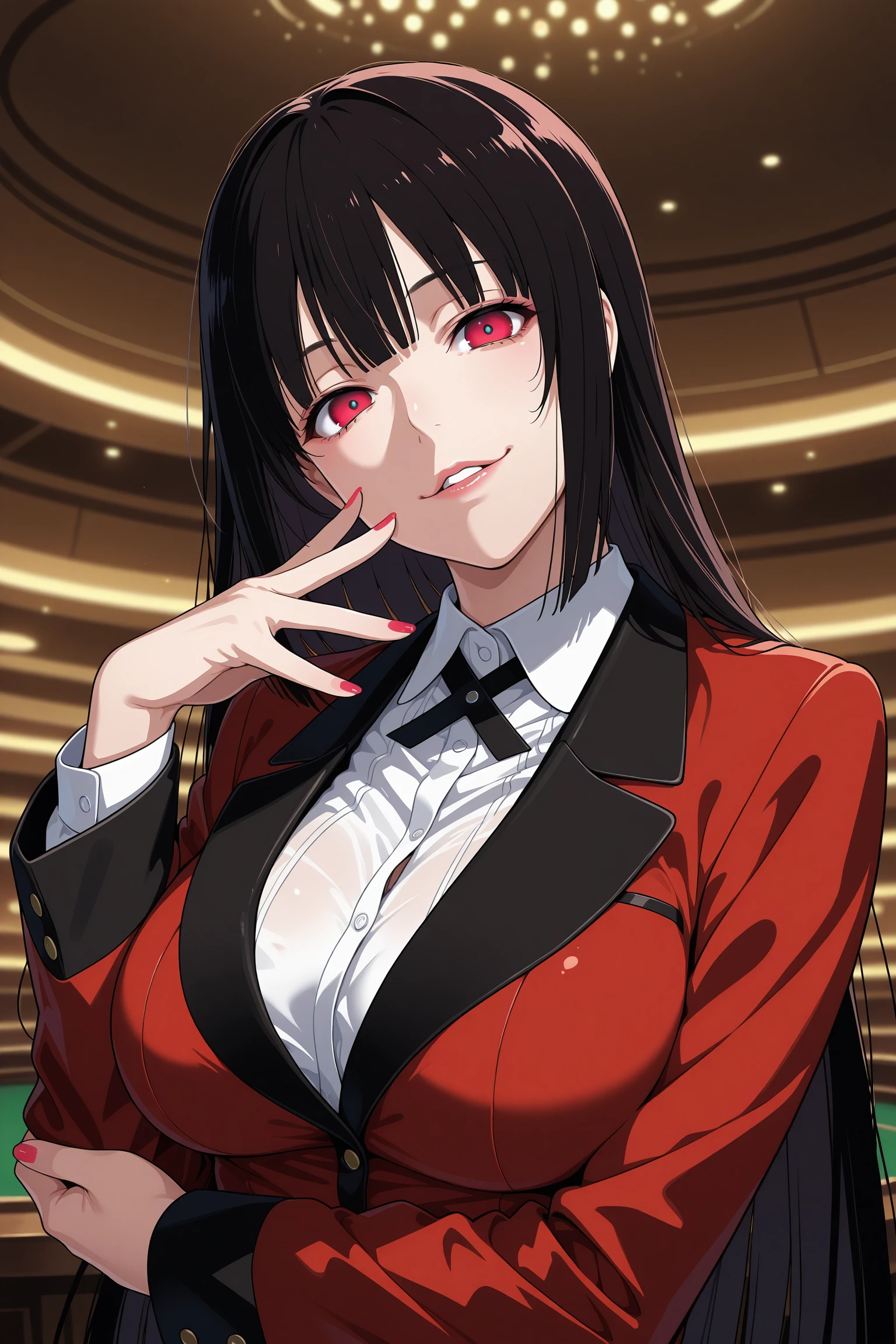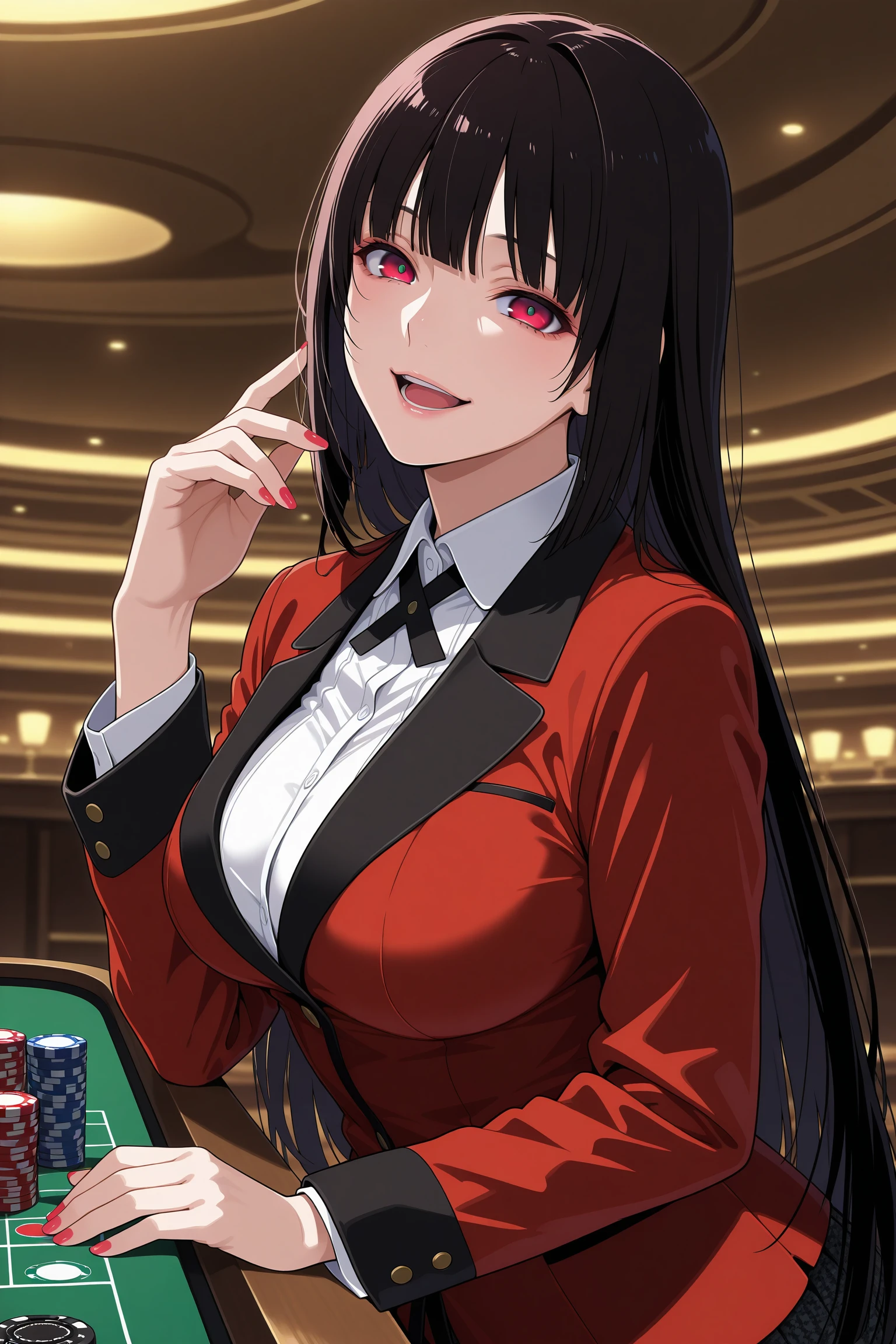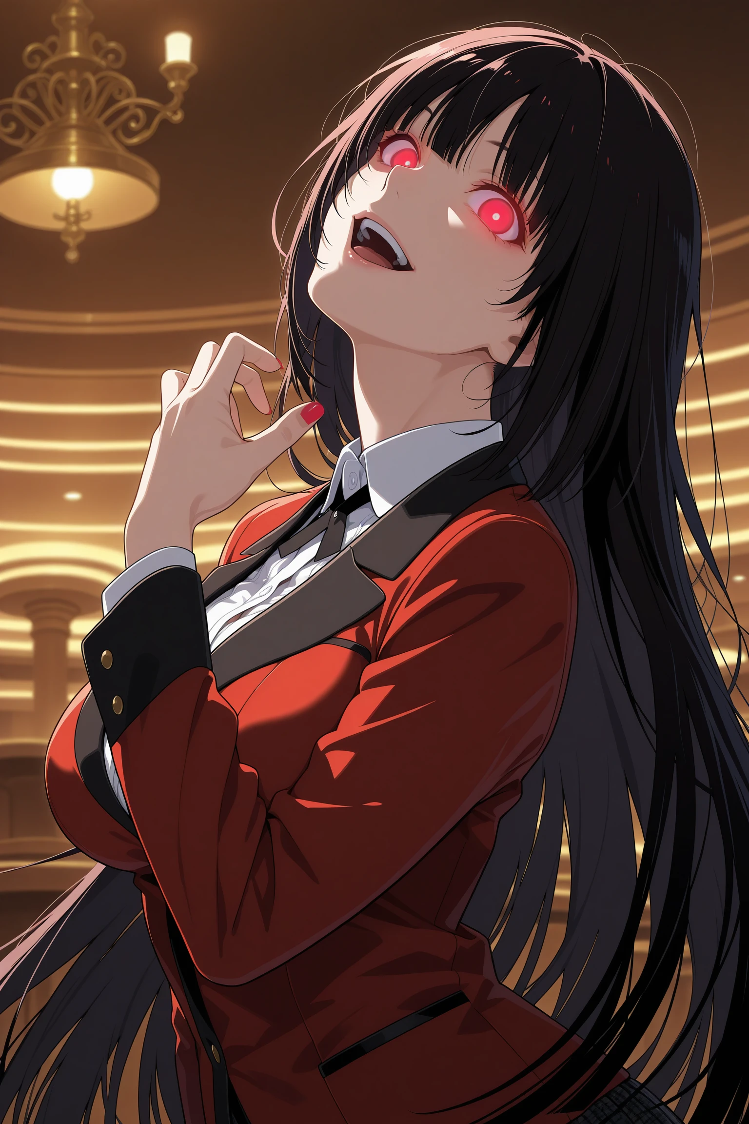 jabami yumeko, long hair, black hair, bangs, himecut, red eyes, hyakkaou academy school uniform, long sleeves, red nails, nail poilsh, blazer, red jacket, suit jacket, white shirt, collared shirt, black neck ribbon, black skirt, plaid skirt, pleated skirt, black pantyhose, loafersDescription