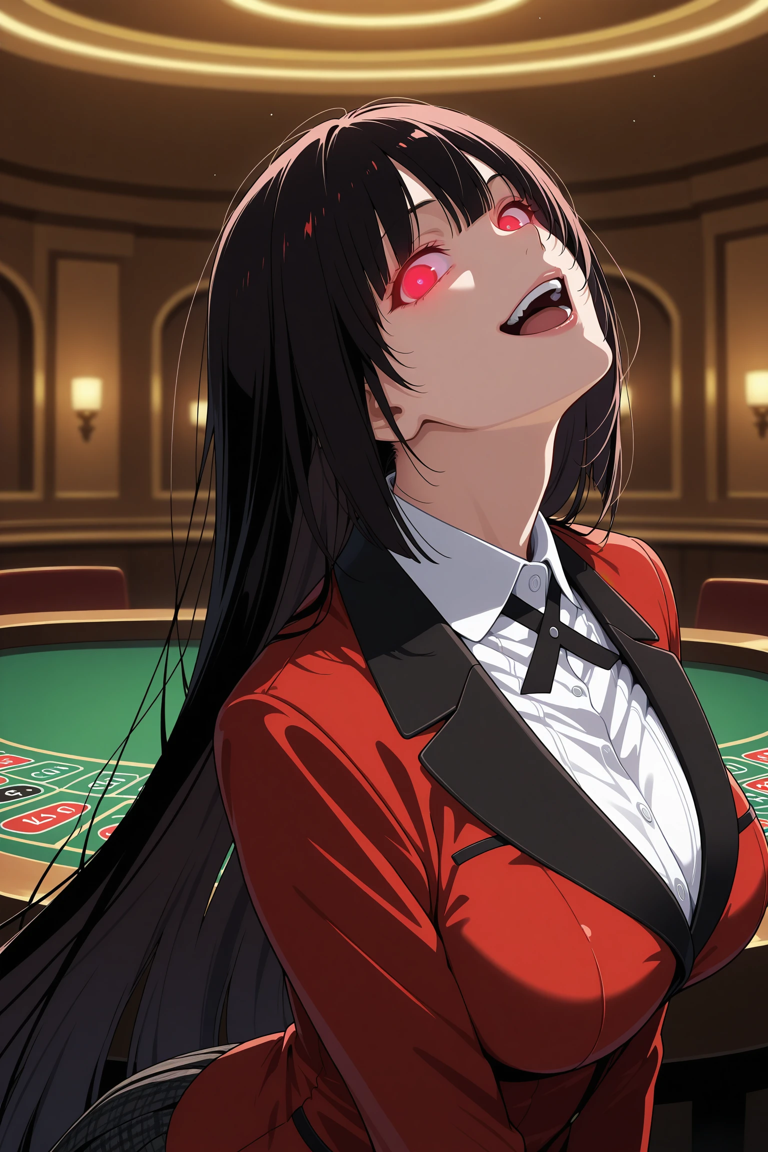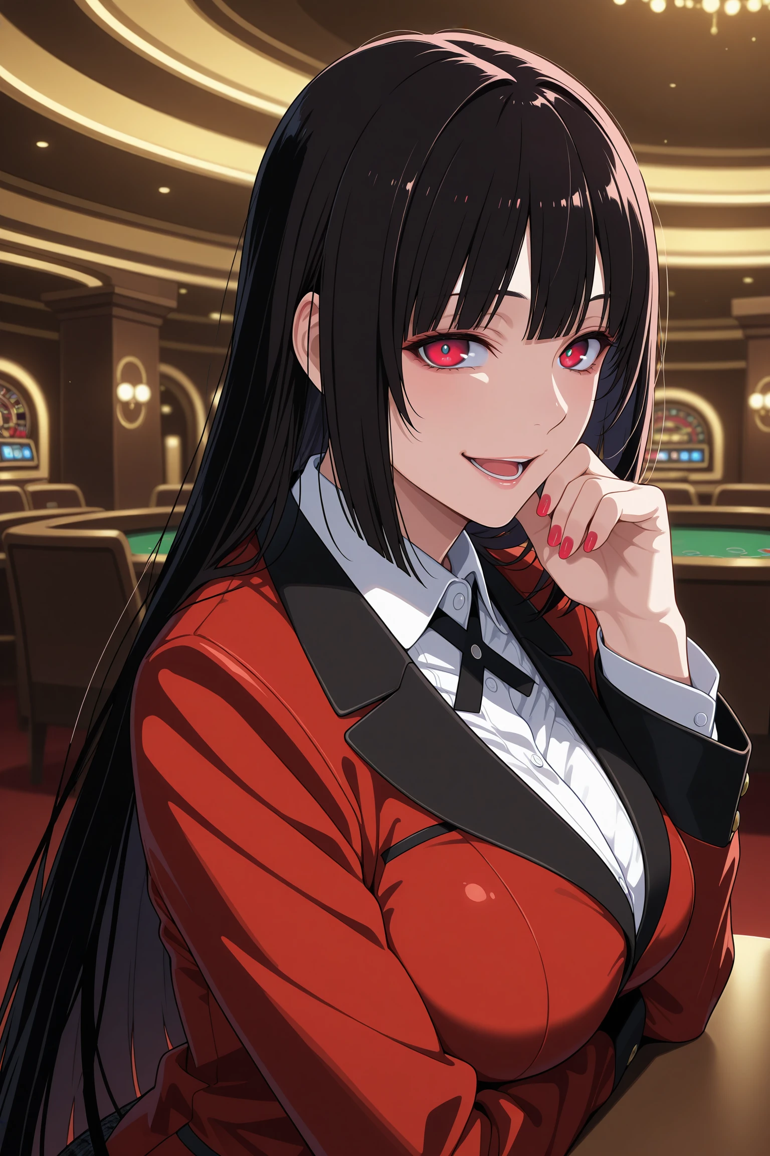 jabami yumeko, long hair, black hair, bangs, himecut, red eyes, hyakkaou academy school uniform, long sleeves, red nails, nail poilsh, blazer, red jacket, suit jacket, white shirt, collared shirt, black neck ribbon, black skirt, plaid skirt, pleated skirt, black pantyhose, loafers