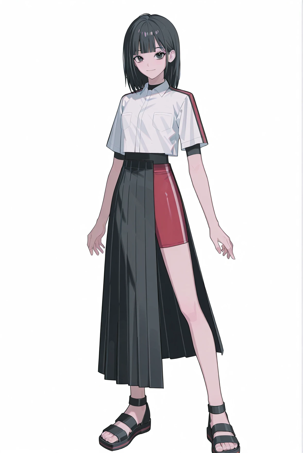 outfit: white shirt, collared shirt, school uniform, short sleeves, bodysuit, shirt tucked in, long skirt, pleated skirt, side slit, red bike shorts, sandals
