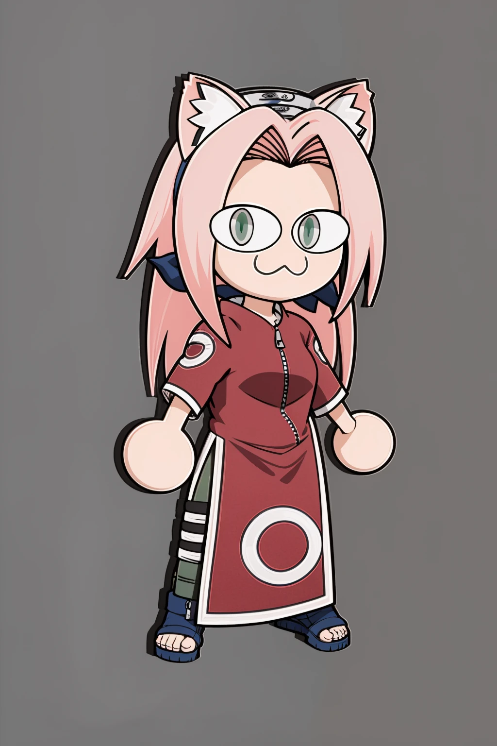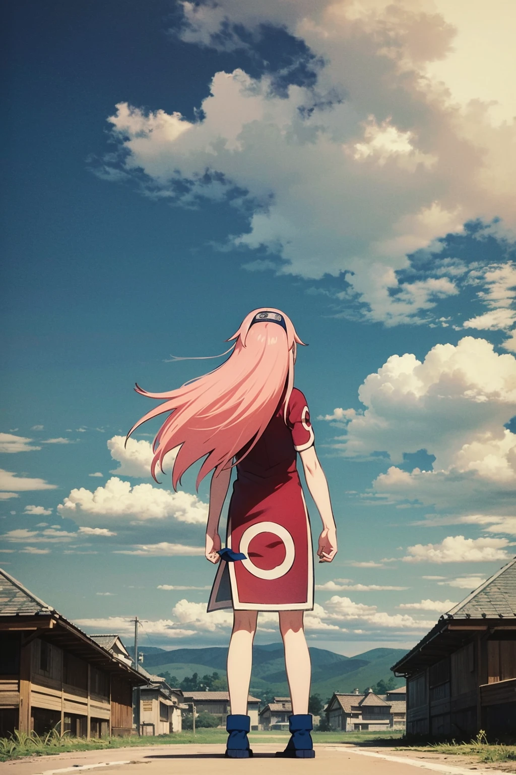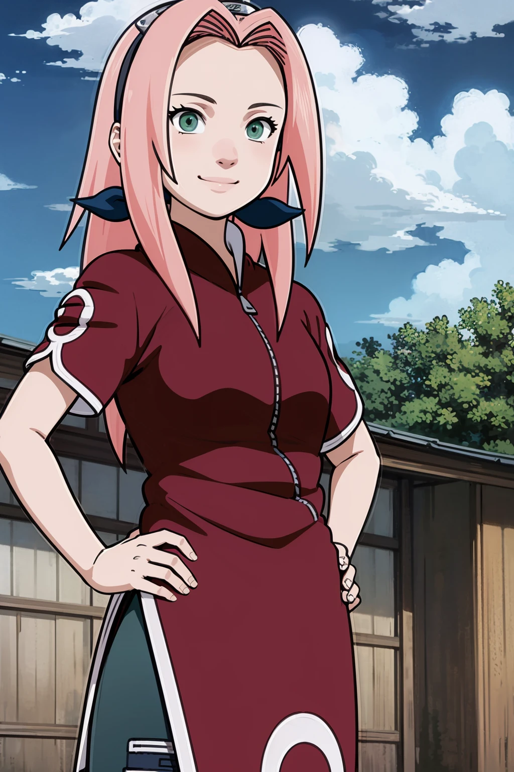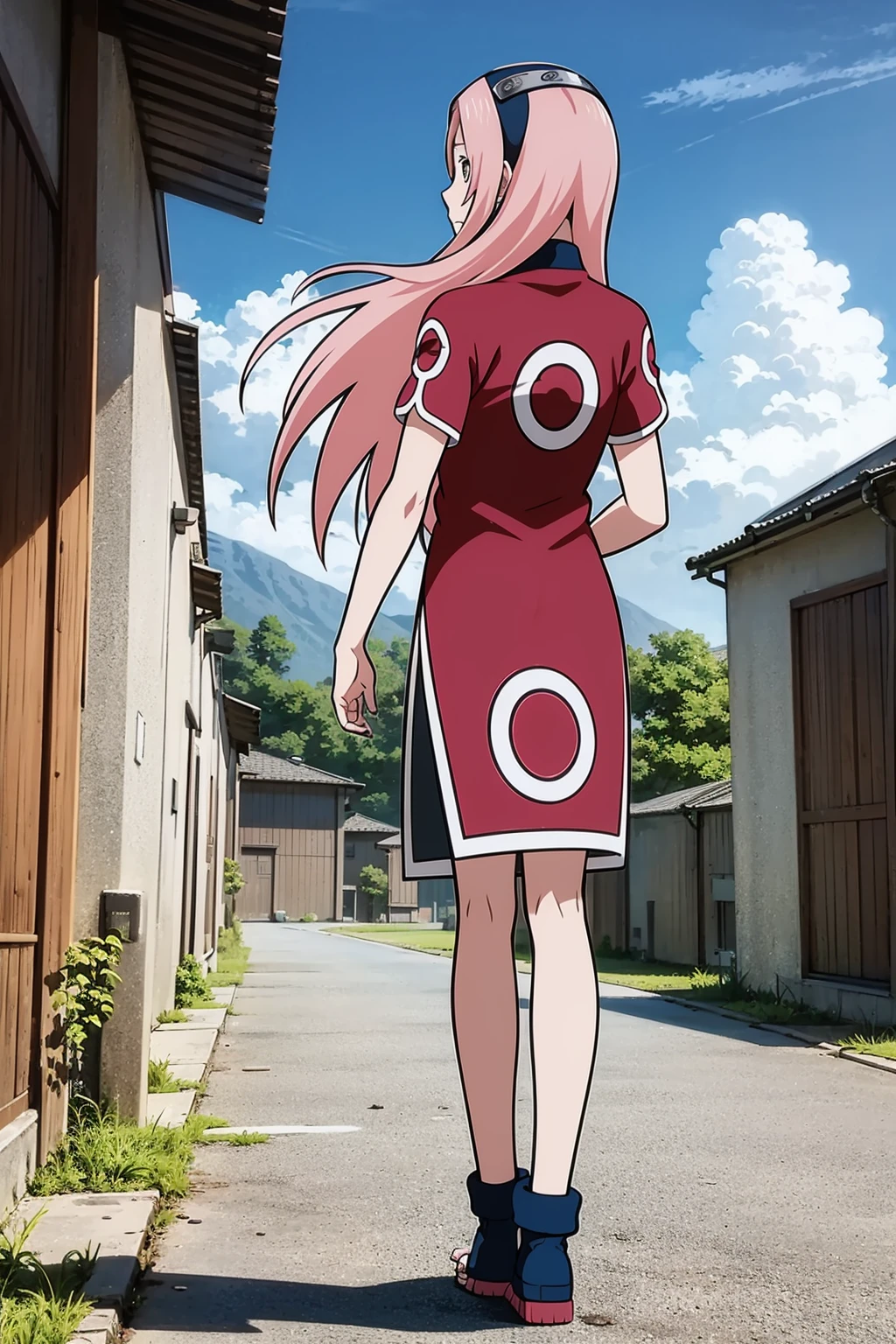 Other prompts : 1girl, pink hair, long hair, short hair, green eyes, forehead protector, short sleeves, red shirt, bike shorts