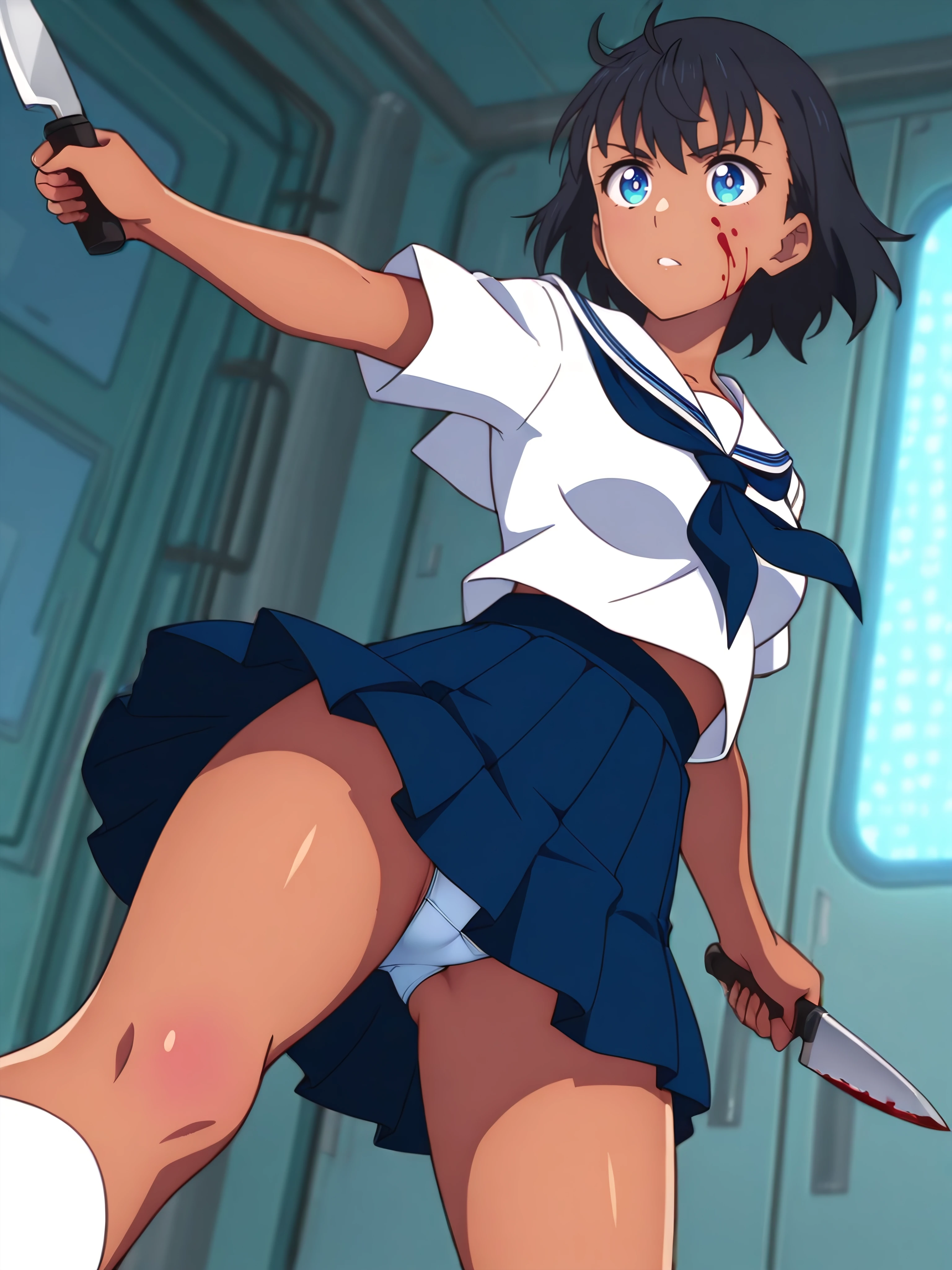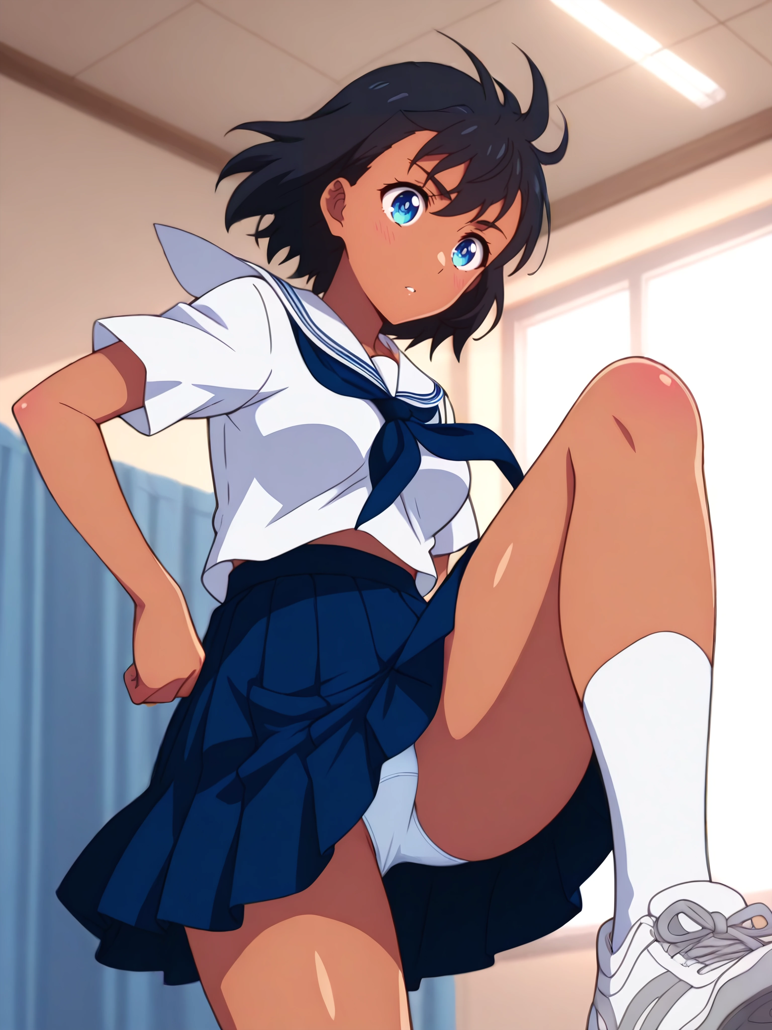 mio, short black hair, bangs,dark skin, blue eyes, anime screenshot,