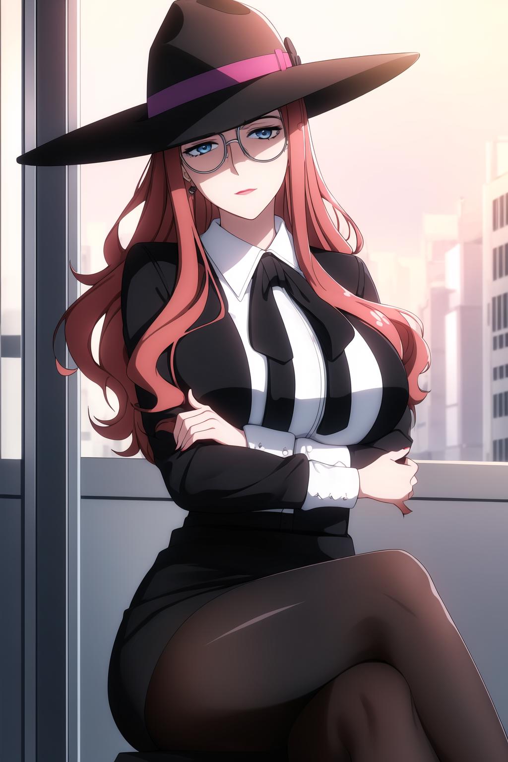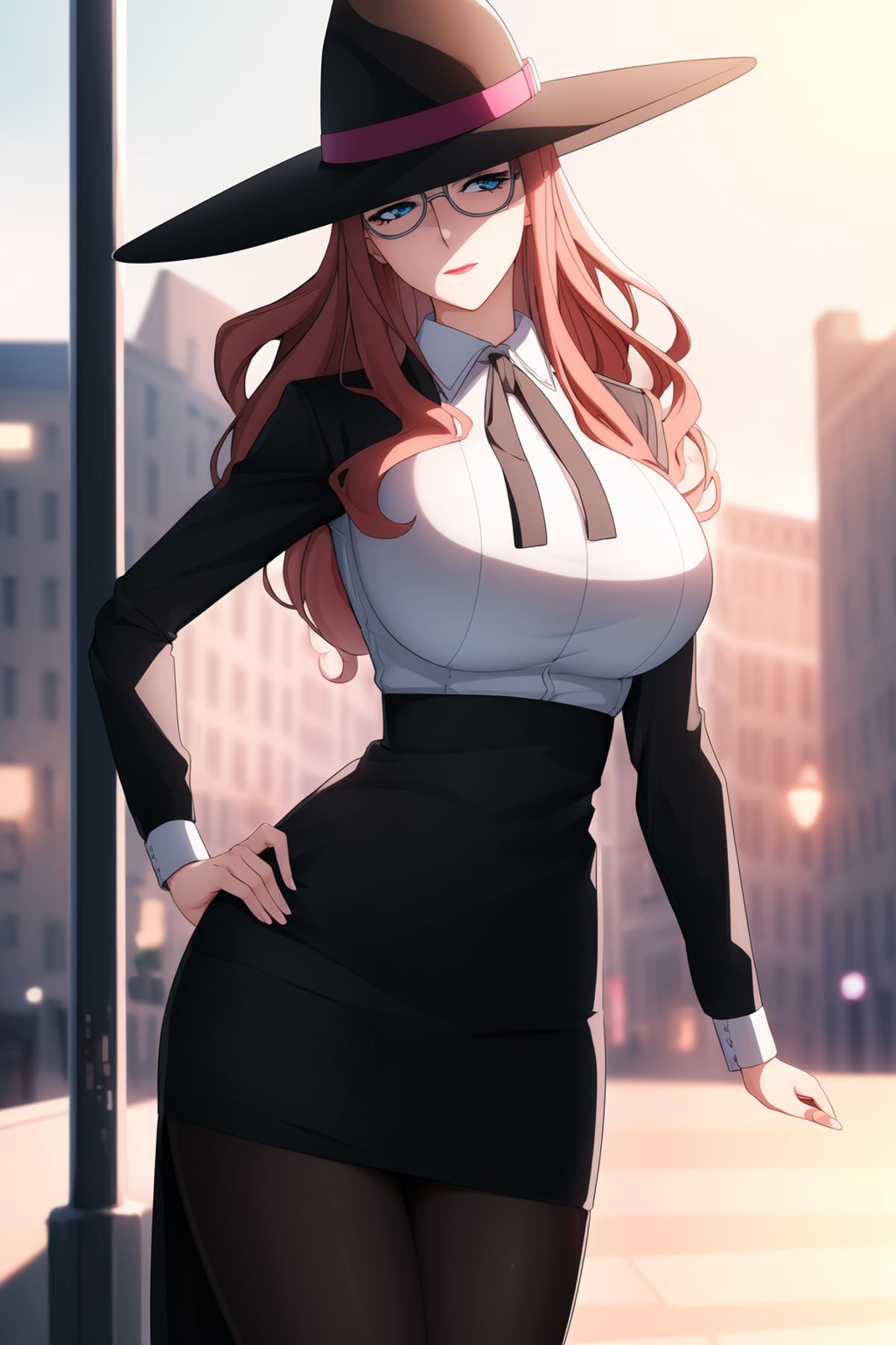 black Jacket,black headwear,witch hat,pantyhose,long sleeves,White_collared shirt, black ribbon,Black_Pencil_skirt,