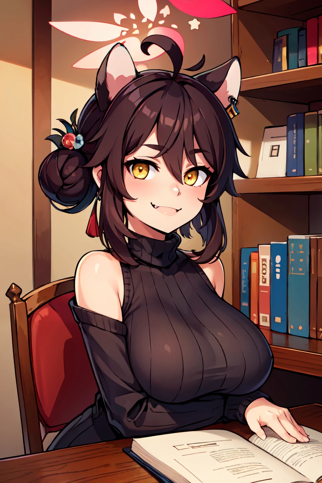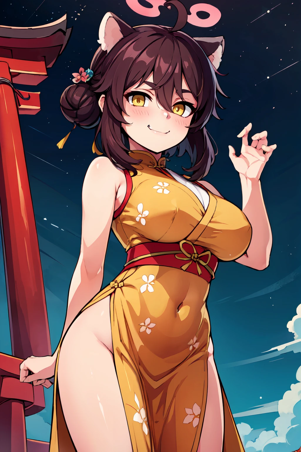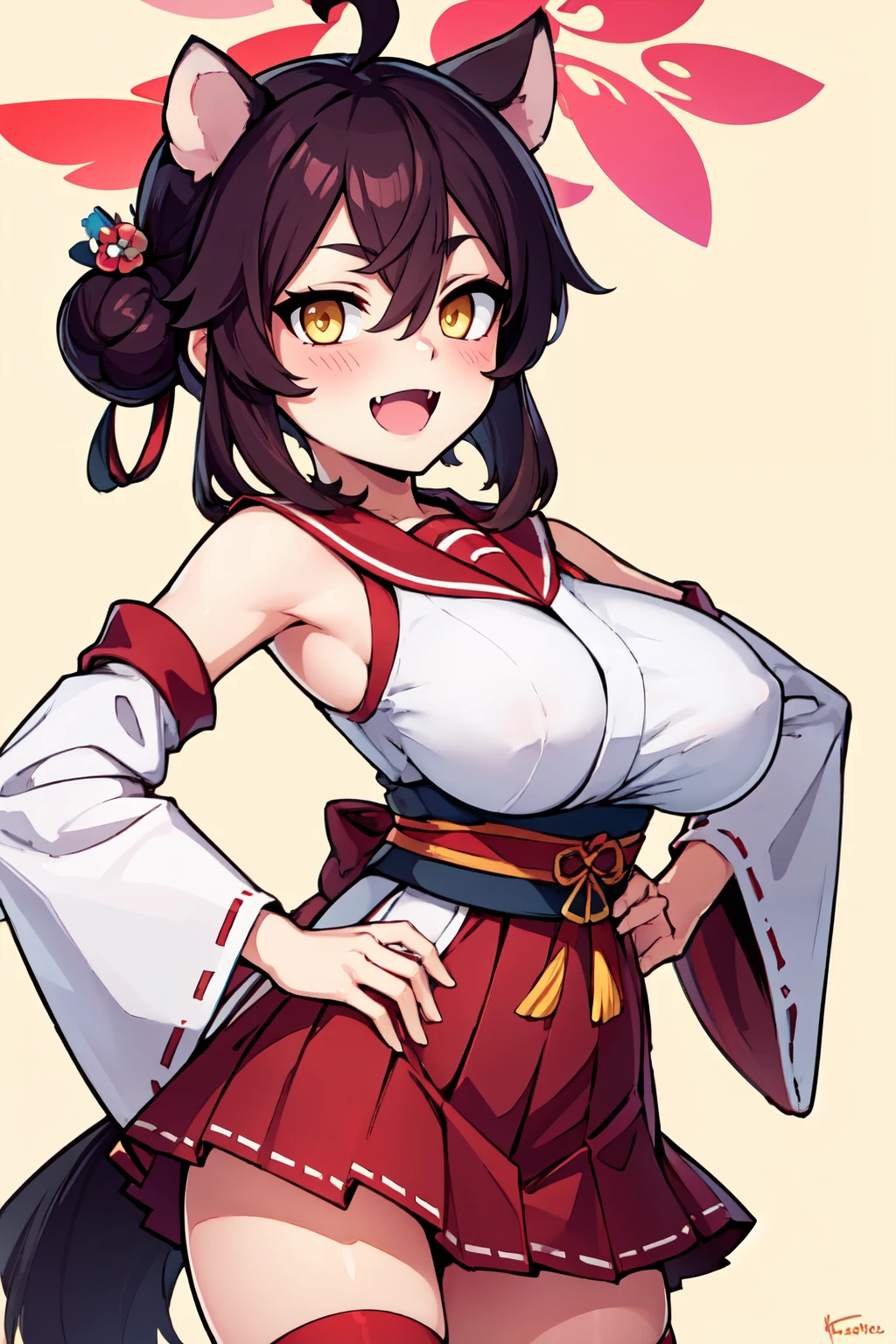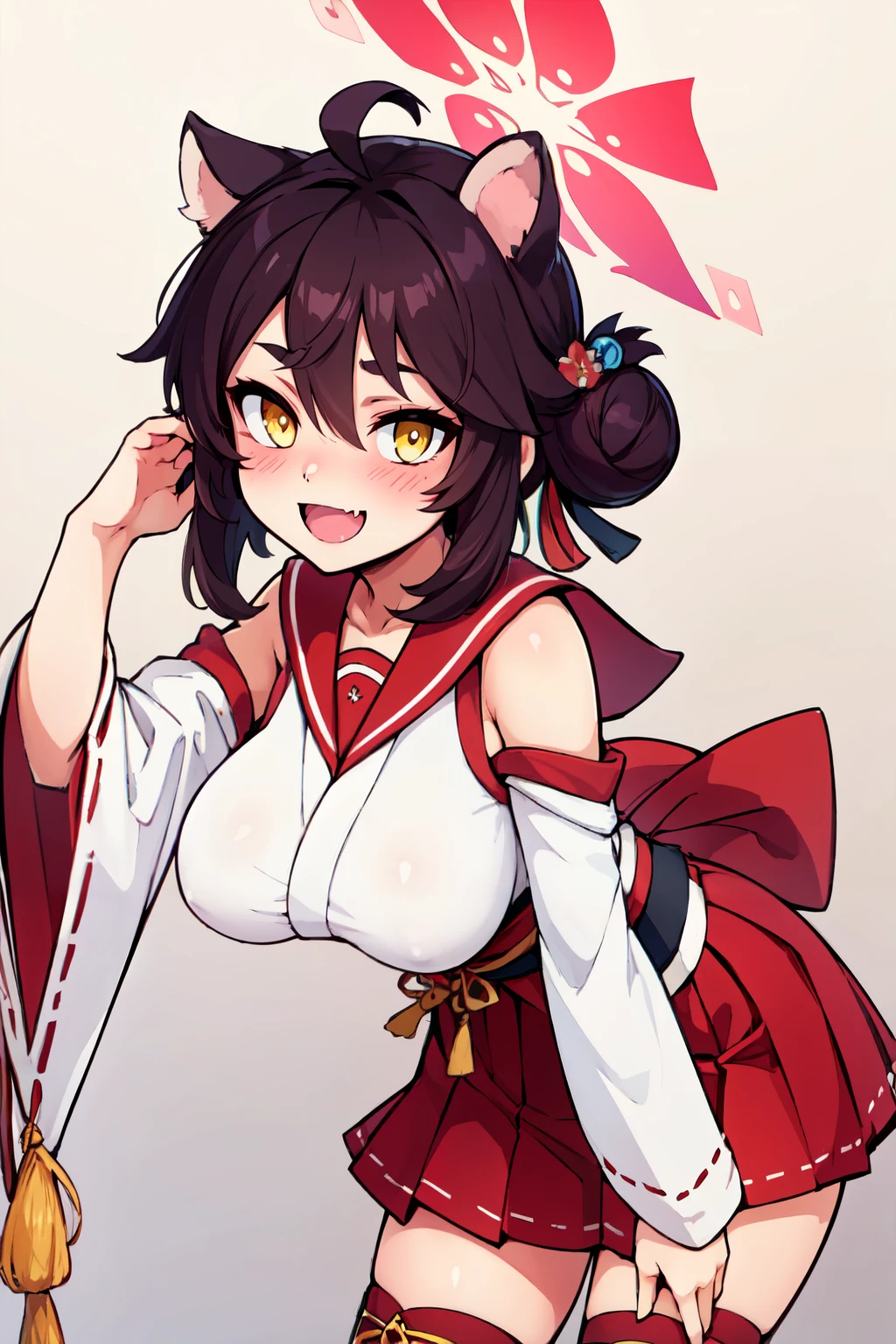 zzKaede, animal ears, halo, yellow eyes, hair bun, ahoge, large breasts, single side bun, black hair, hair between eyes, fang, hair ornament, skin fang, brown hair blush, detached sleeves, red sailor collar, solo, white thighhighs, red skirt, wide sleeves, hakama skirt, red hakama, red halo,