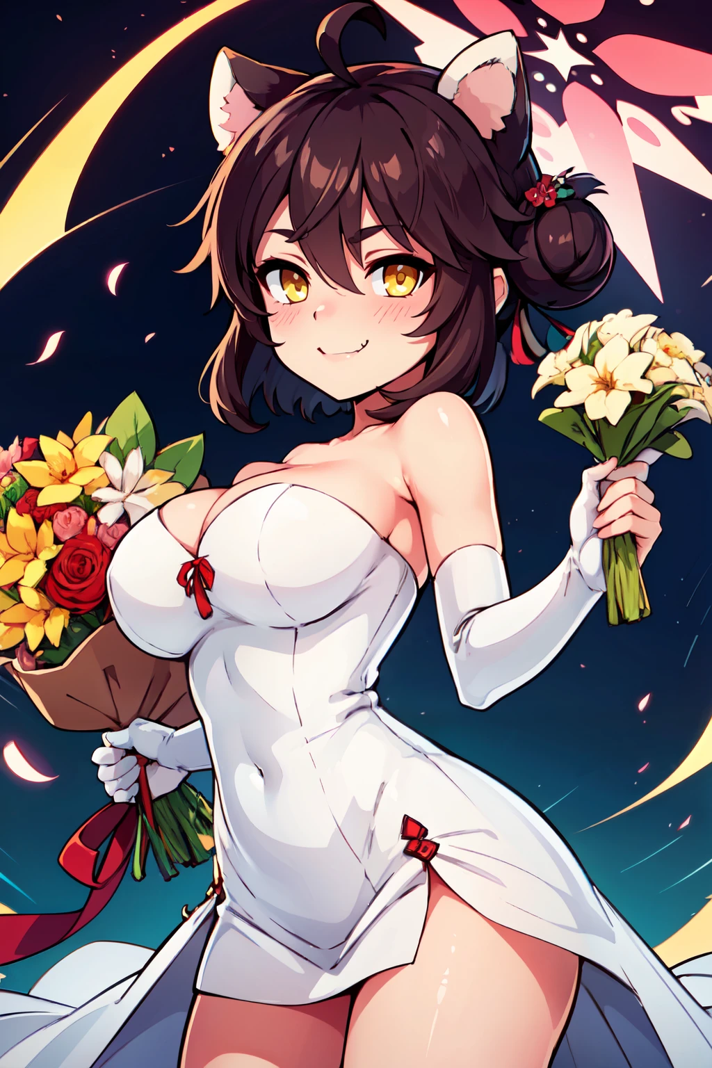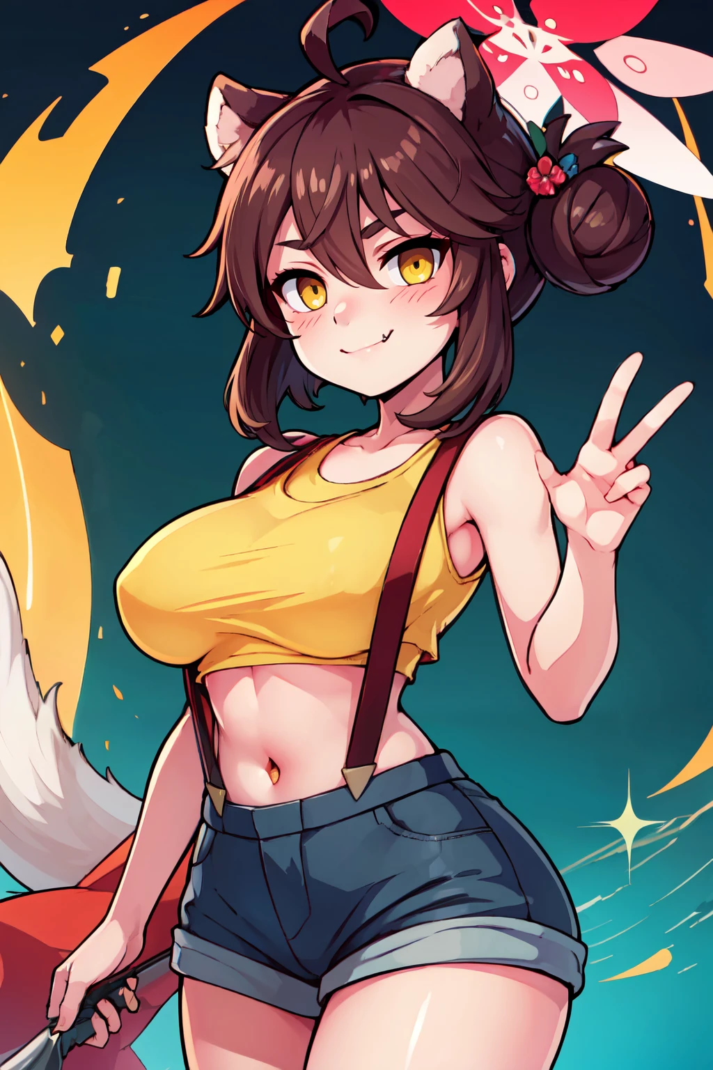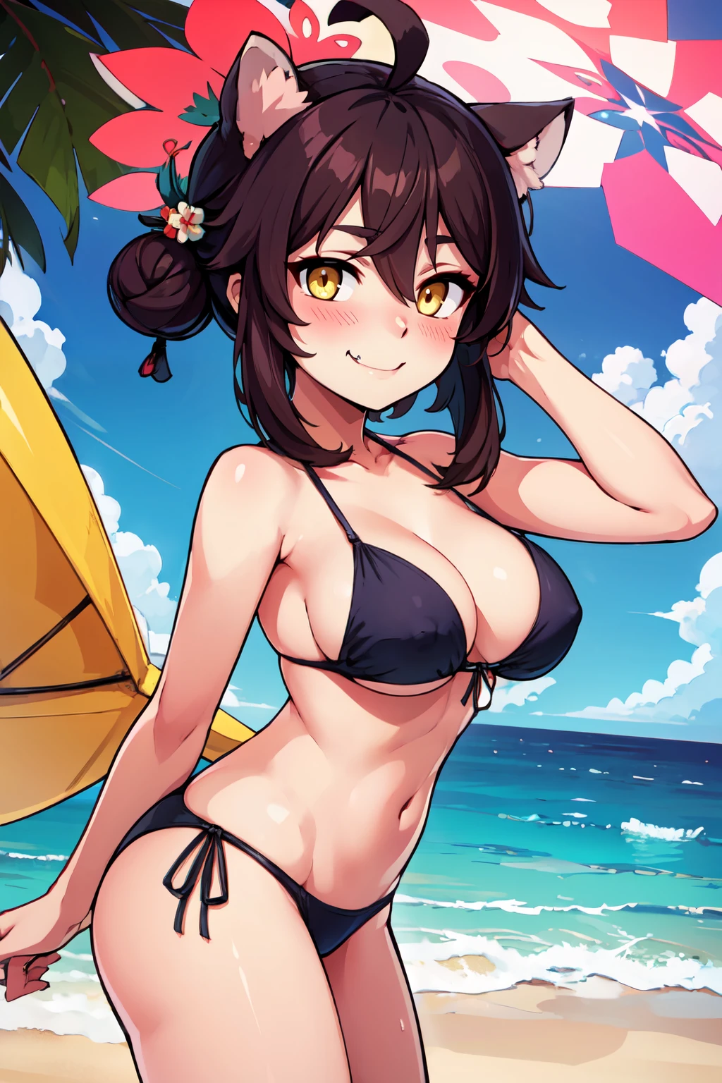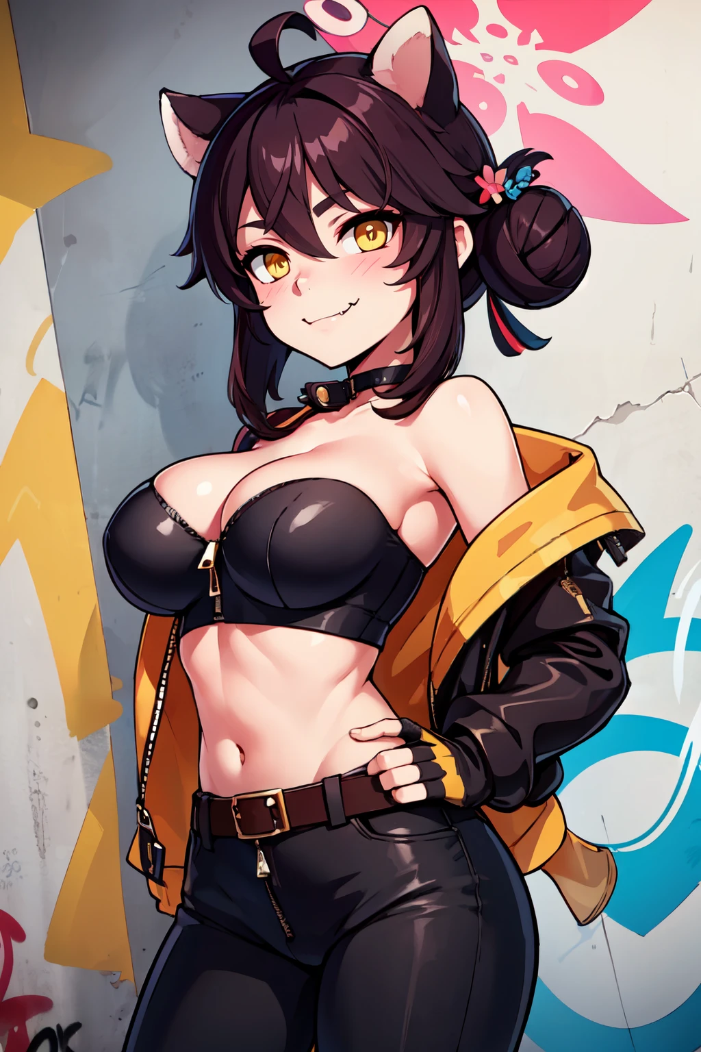 zzKaede, animal ears, halo, yellow eyes, hair bun, ahoge, large breasts, single side bun, black hair, hair between eyes, fang, hair ornament, skin fang, brown hair blush, detached sleeves, red sailor collar, solo, white thighhighs, red skirt, wide sleeves, hakama skirt, red hakama, red halo,
