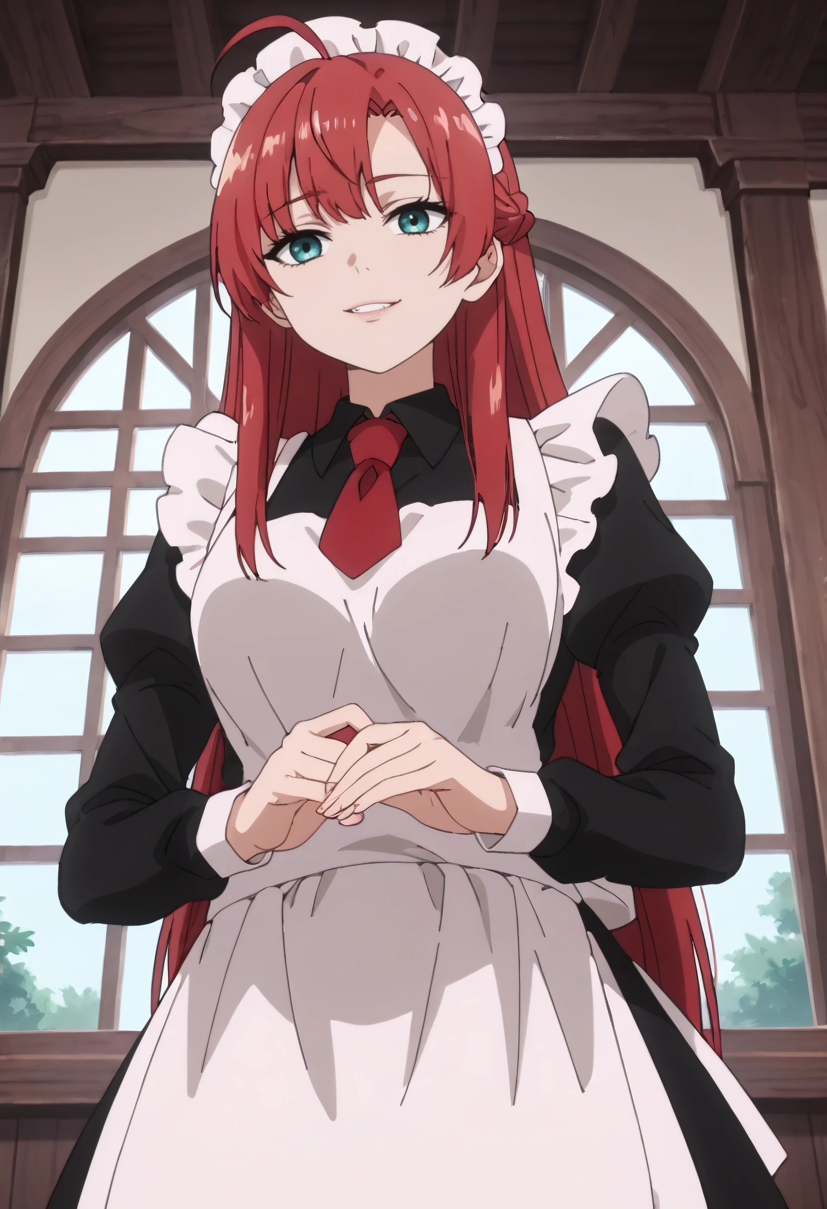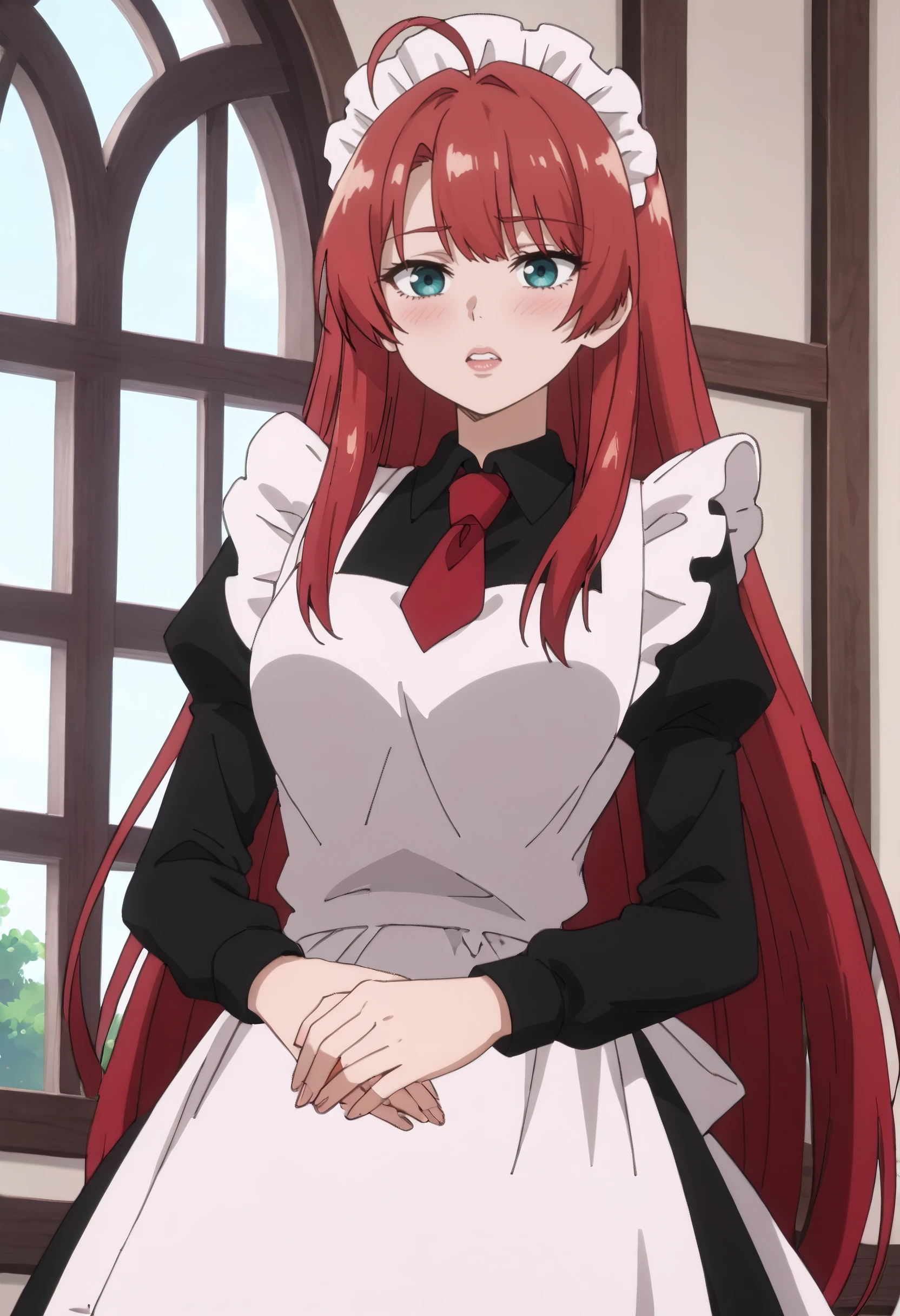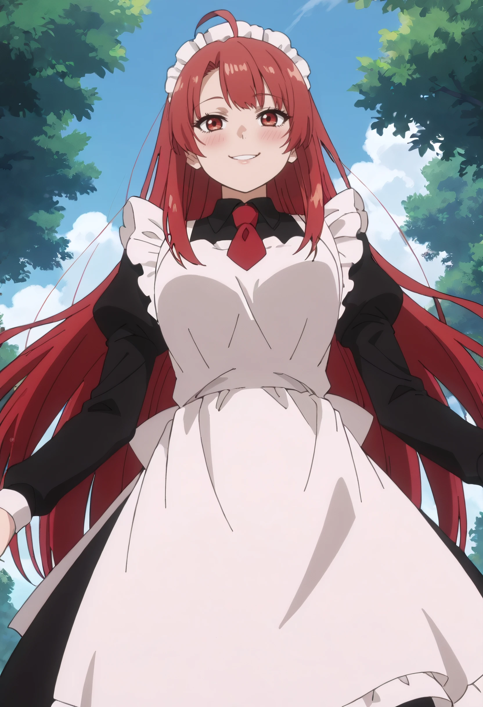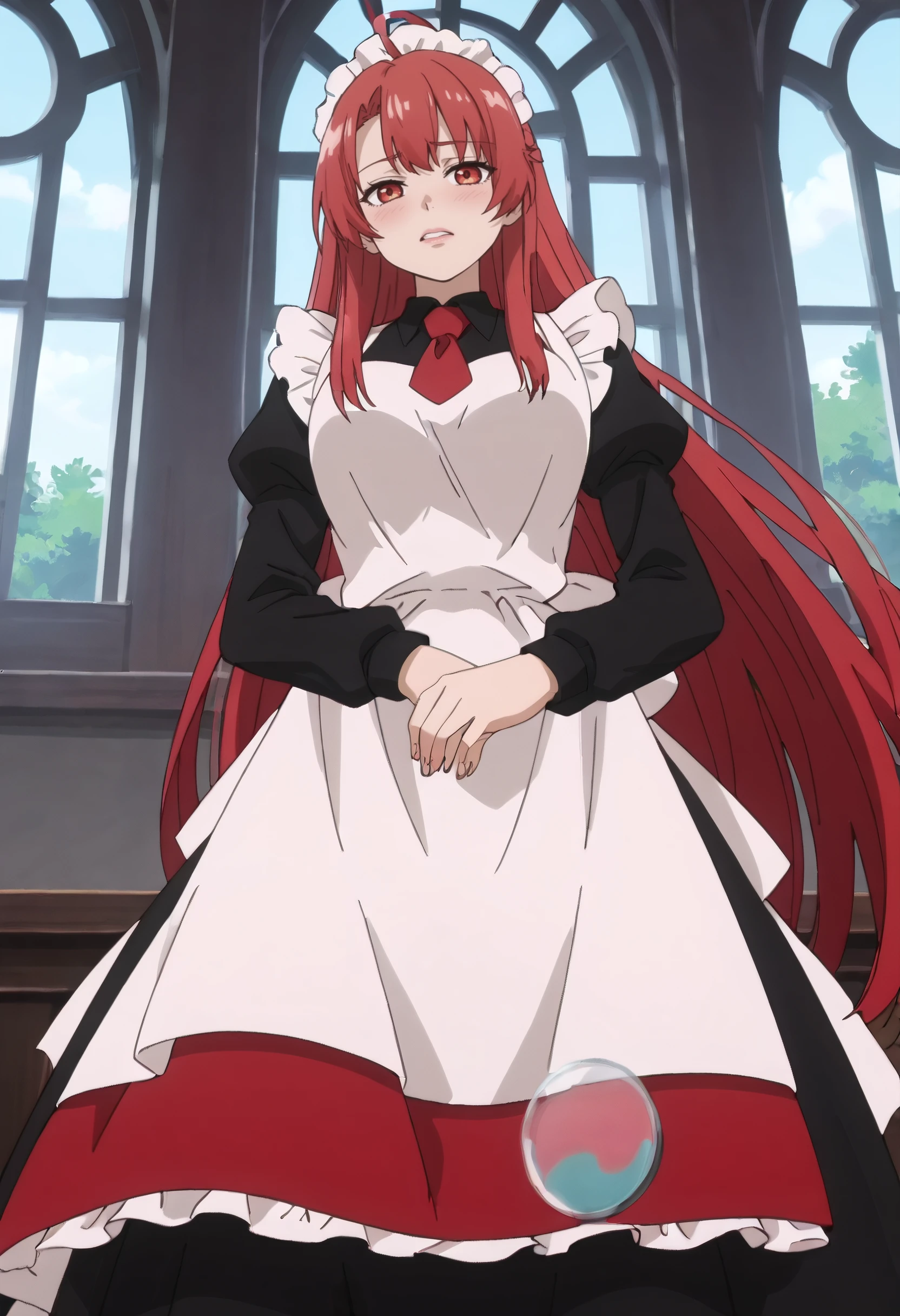 A4ORedMaid, long hair, red hair, eyebrows visible through hair, very long hair, bangs, ahoge,