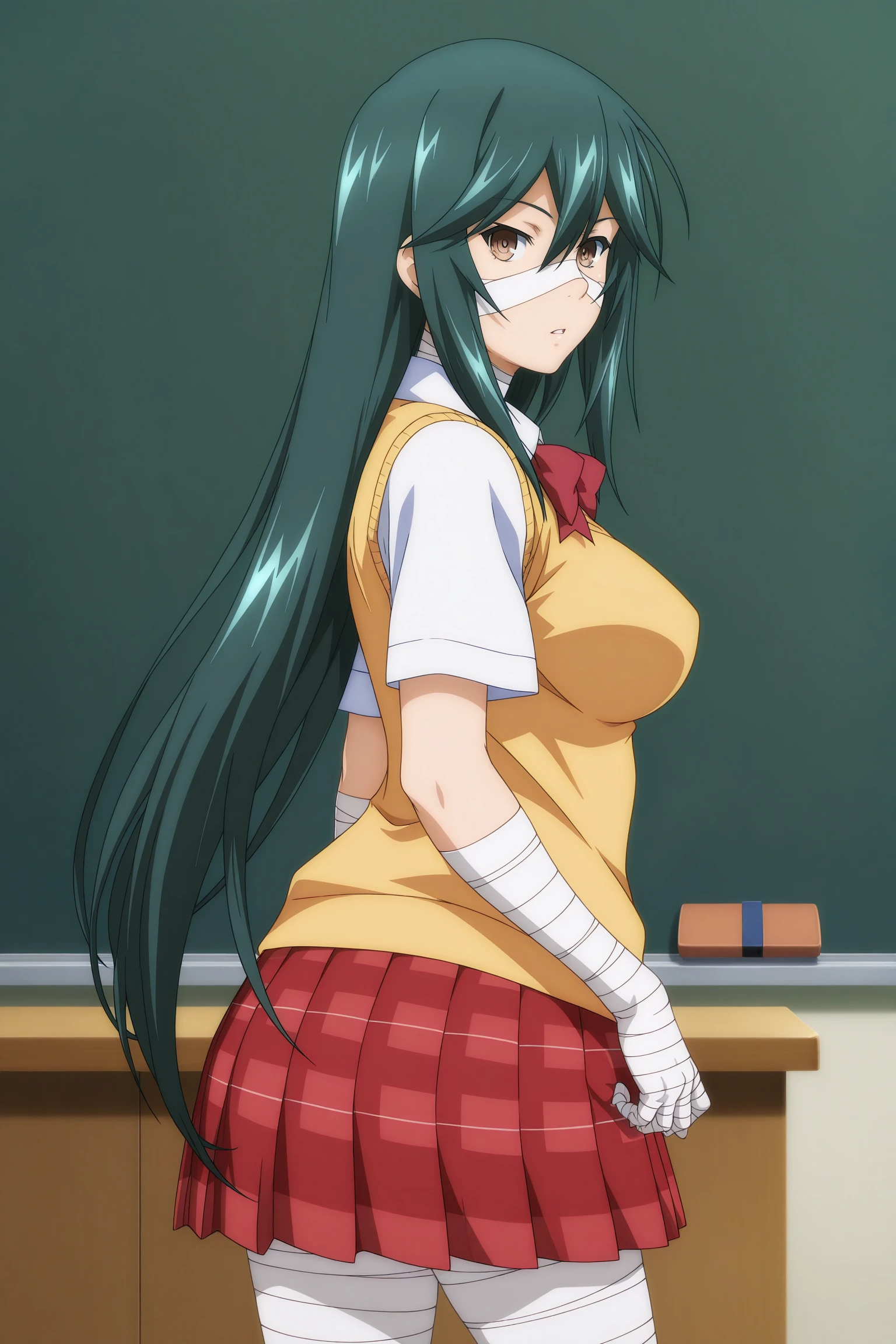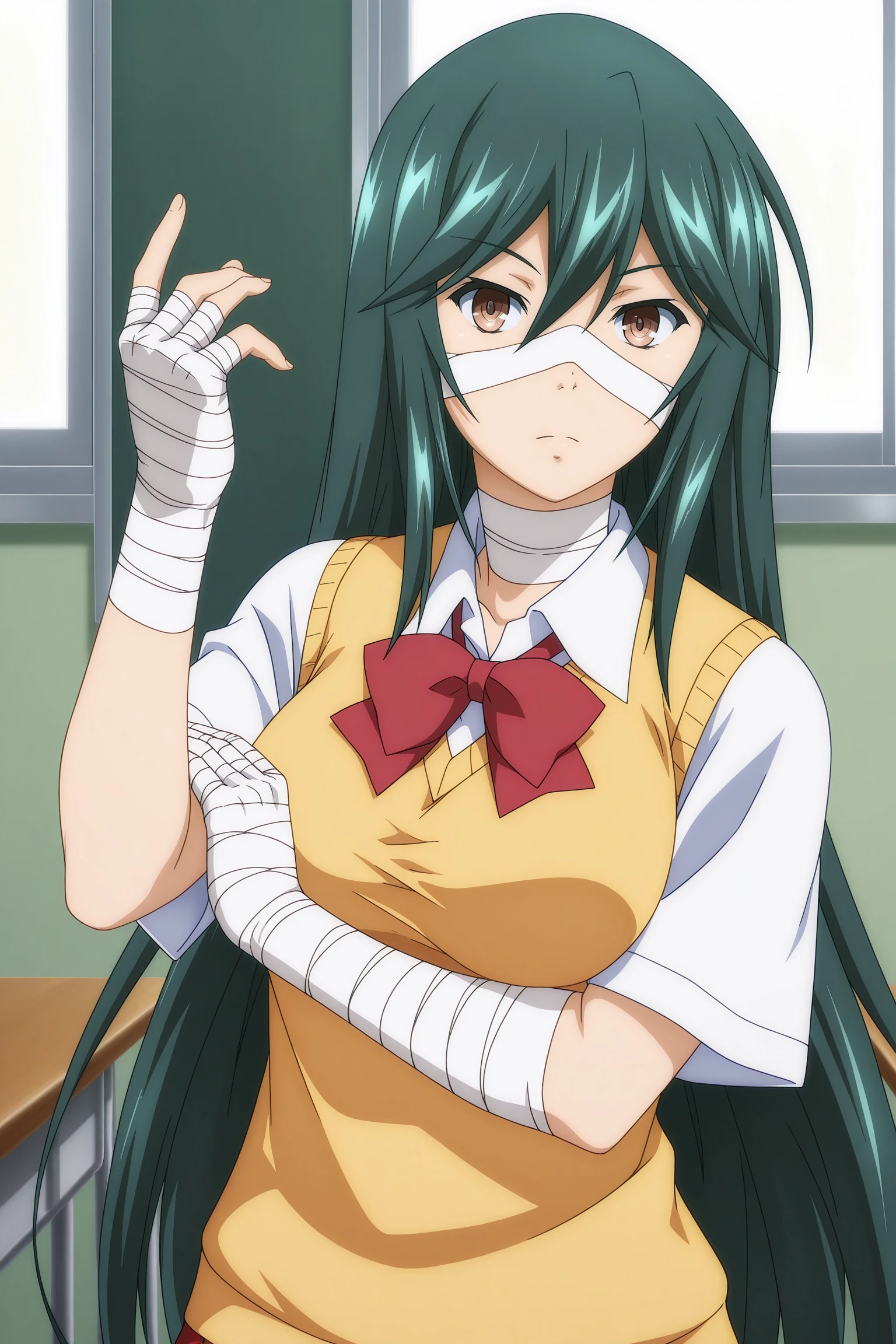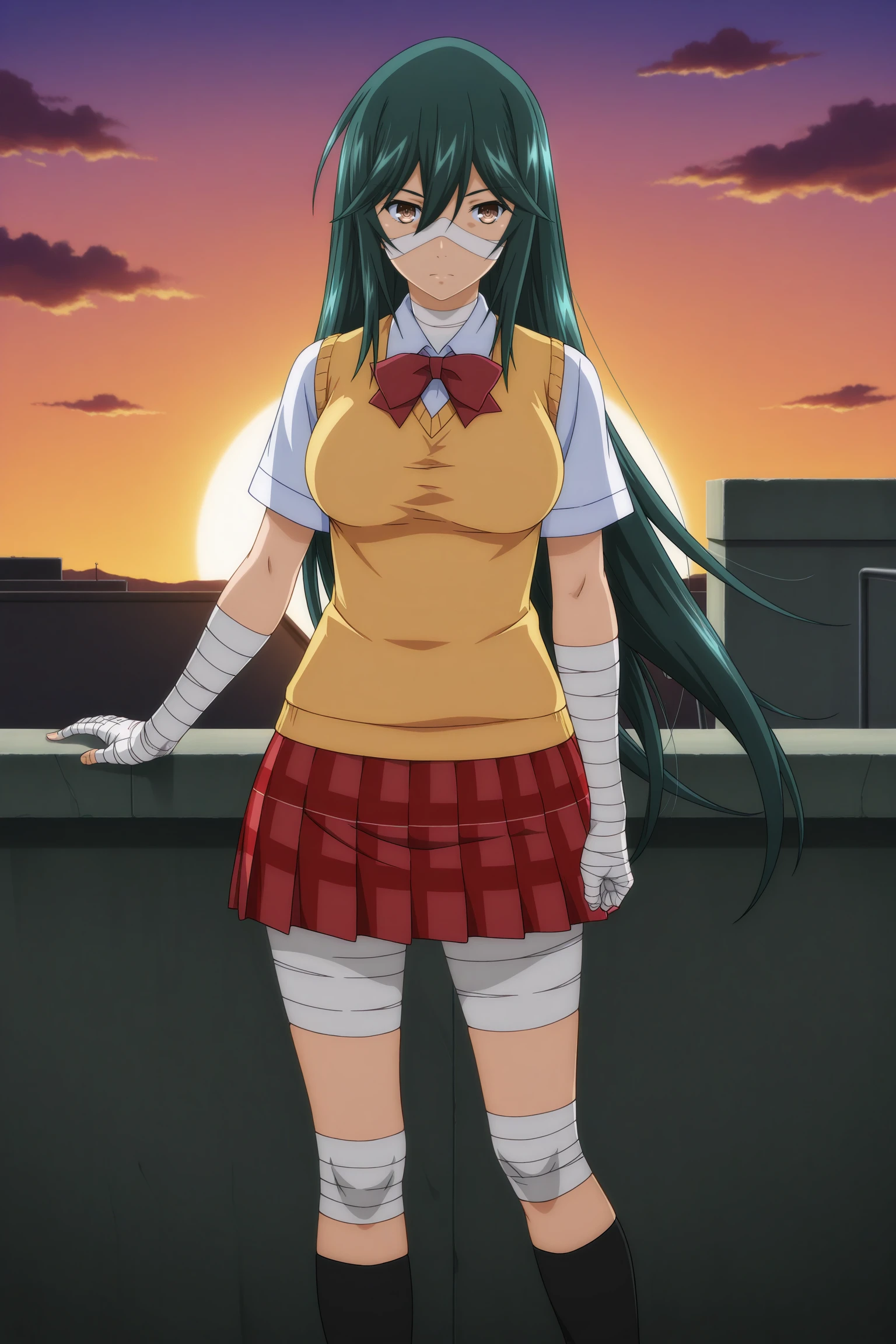 roshuku shikei, long hair, green hair, sidelocks, wispy bangs, brown eyes, bandage on face, short sleeves, white shirt, collared shirt, yellow vest, red bowtie, red skirt, pleated skirt, bandaged arm, bandaged hand, bandaged neck, bandaged leg, bandaged knees, black socks, kneehighs, brown footwear, loafersDescription