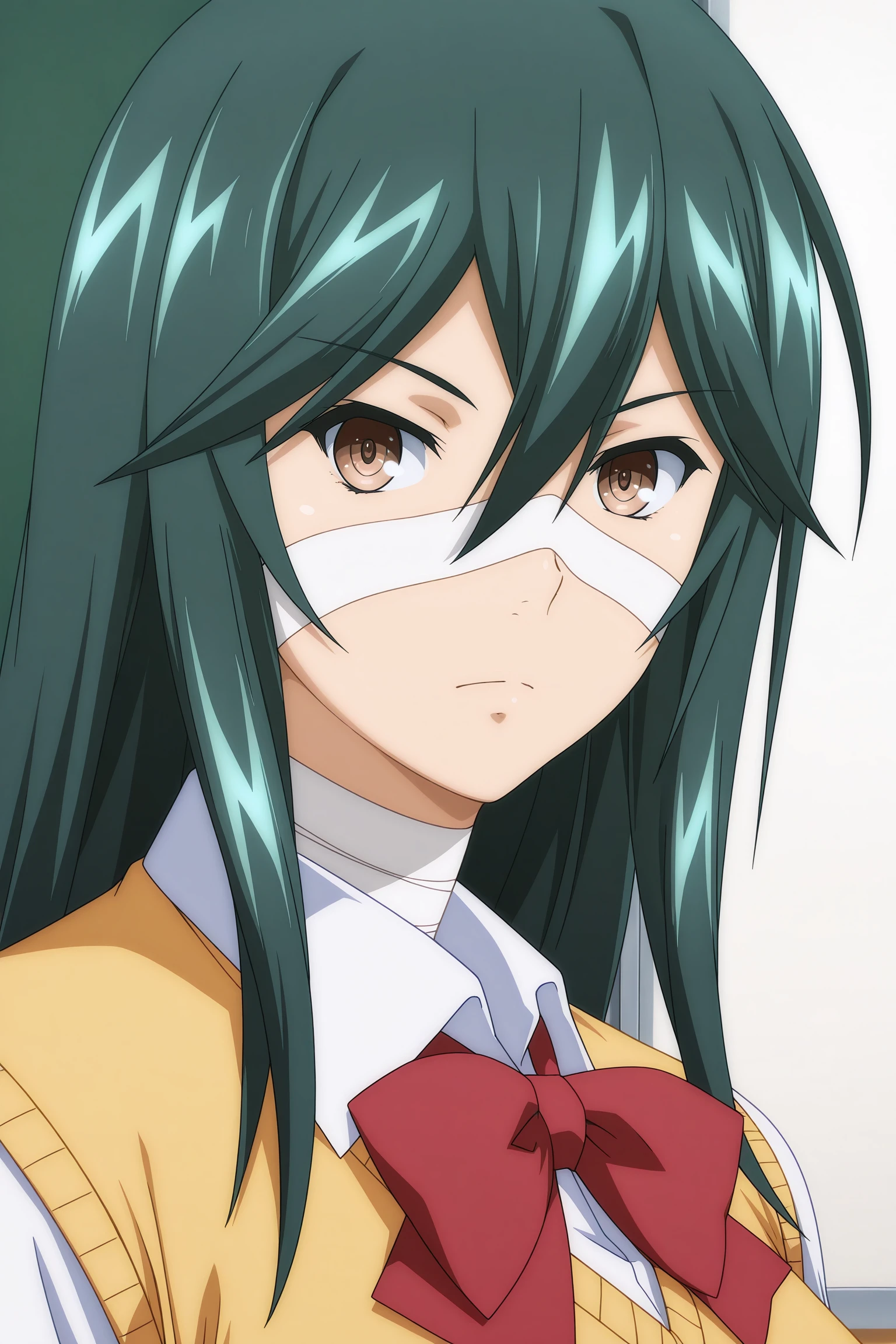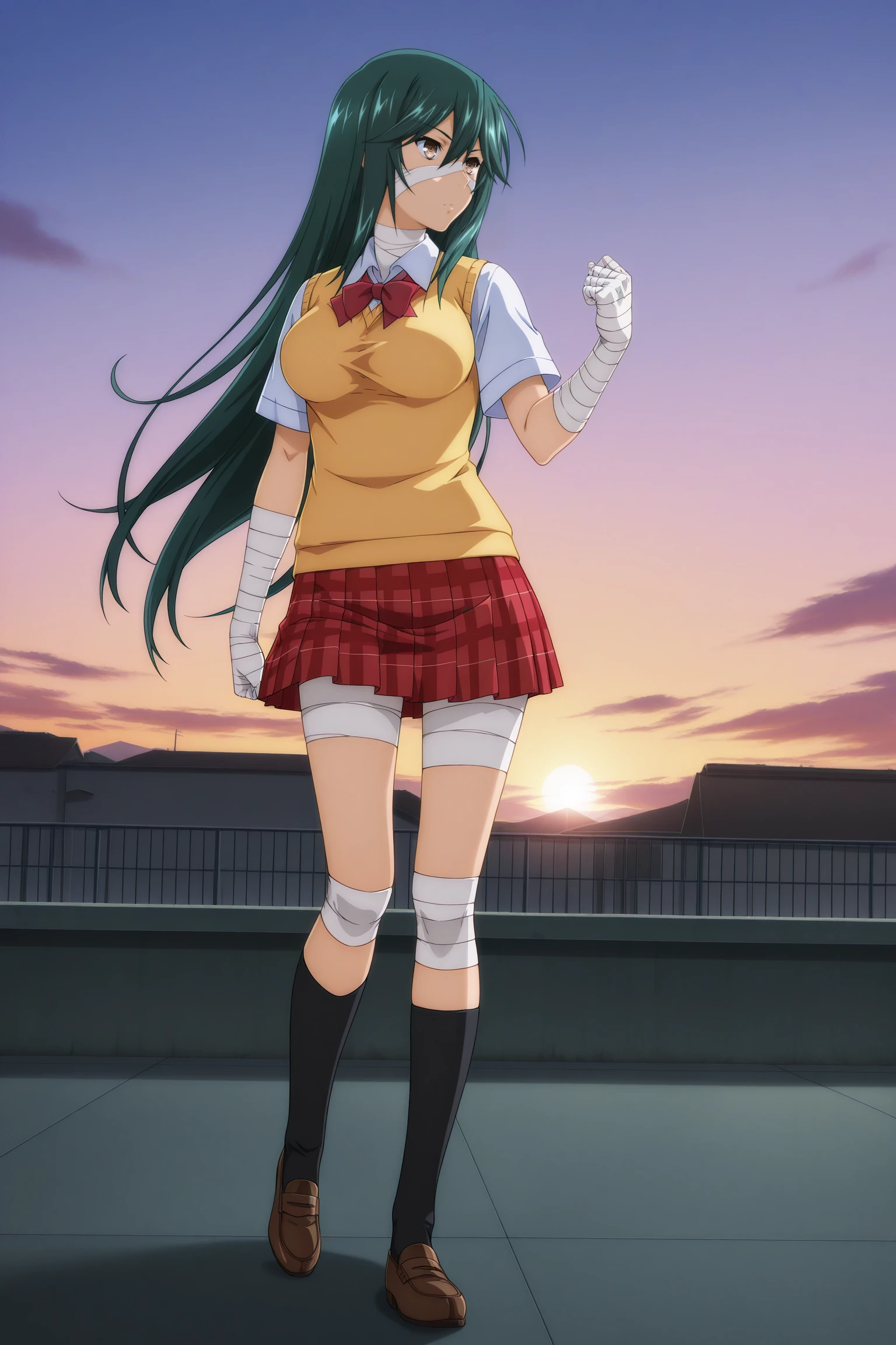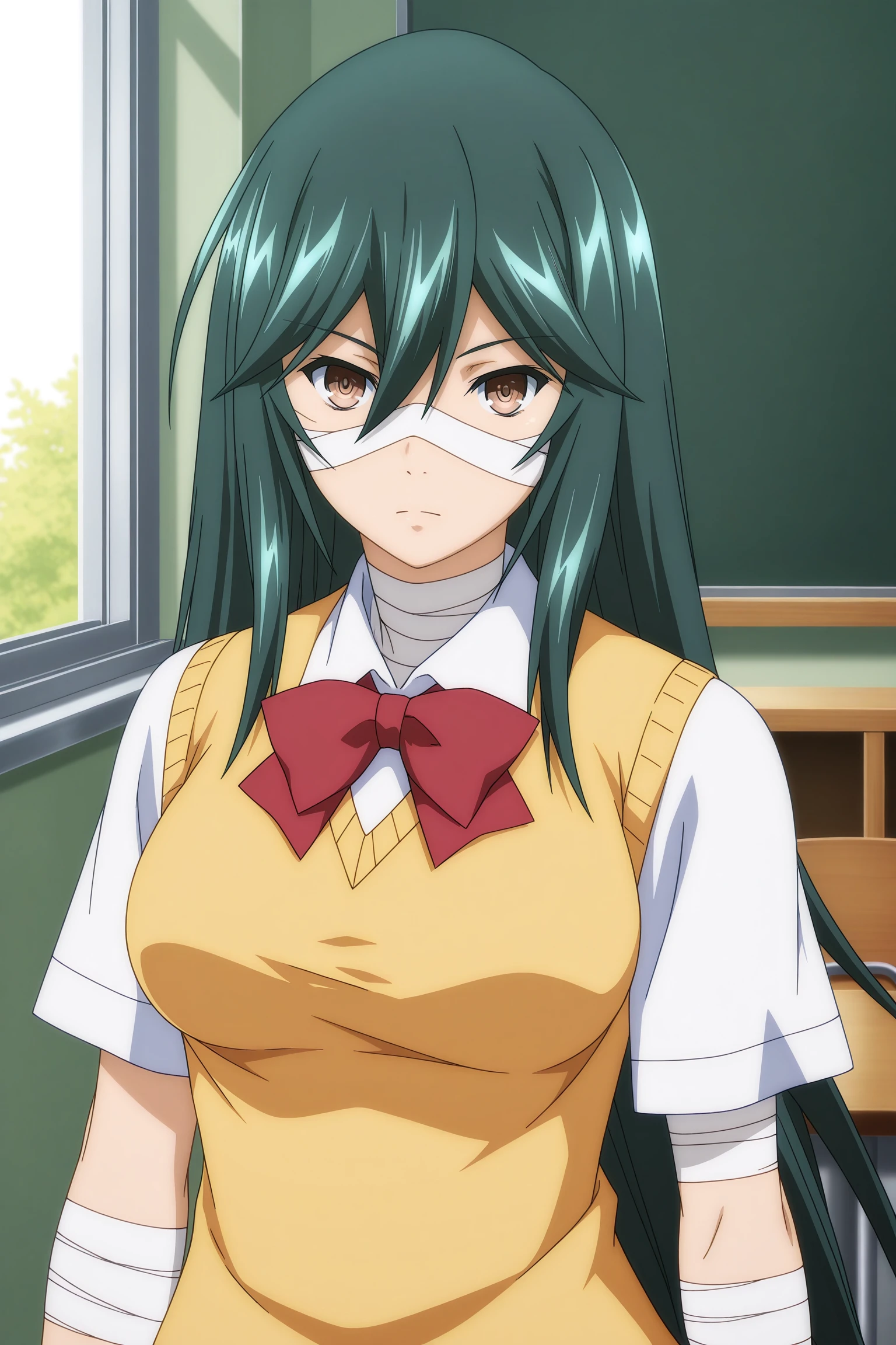 roshuku shikei, long hair, green hair, sidelocks, wispy bangs, brown eyes, bandage on face, short sleeves, white shirt, collared shirt, yellow vest, red bowtie, red skirt, pleated skirt, bandaged arm, bandaged hand, bandaged neck, bandaged leg, bandaged knees, black socks, kneehighs, brown footwear, loafersDescription