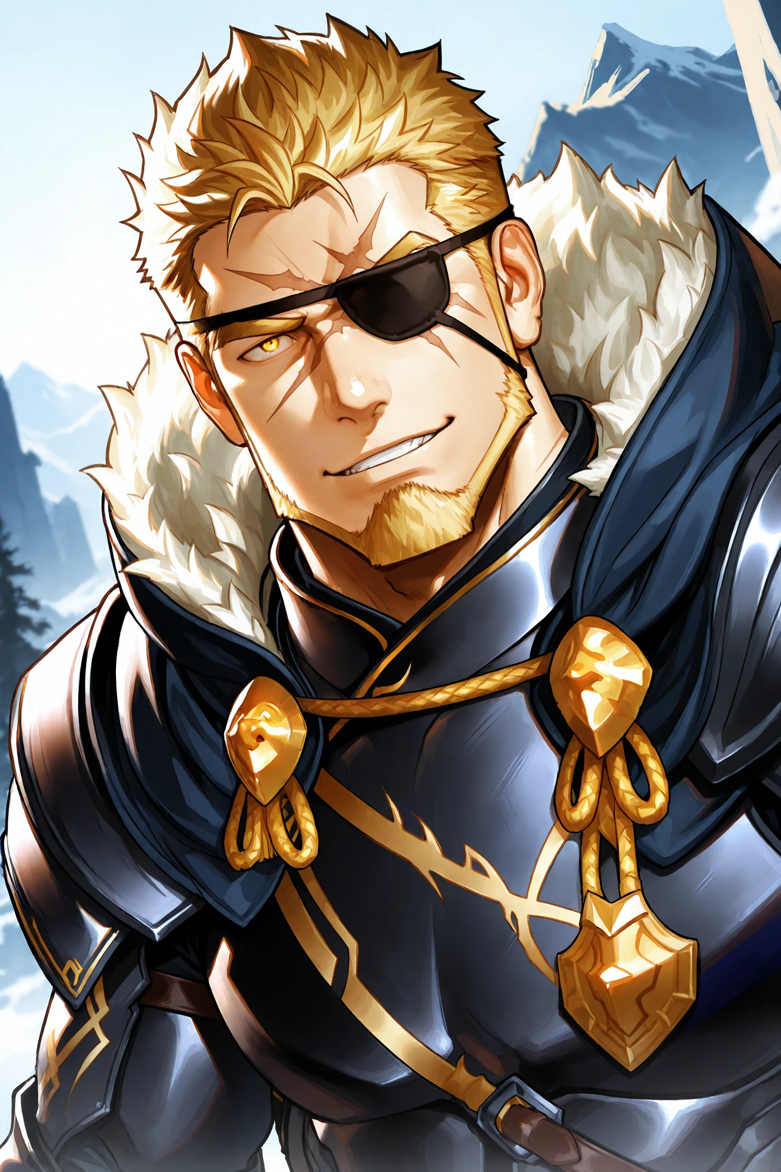 armor, pelvic curtainTry adding thighs if you dont wan't pants with the armor (but it looks a bit strange ngl), also try adding manly if whatever checkpoint you uses makes his face too cute.