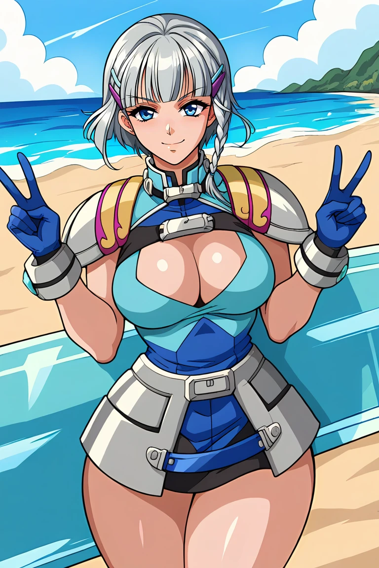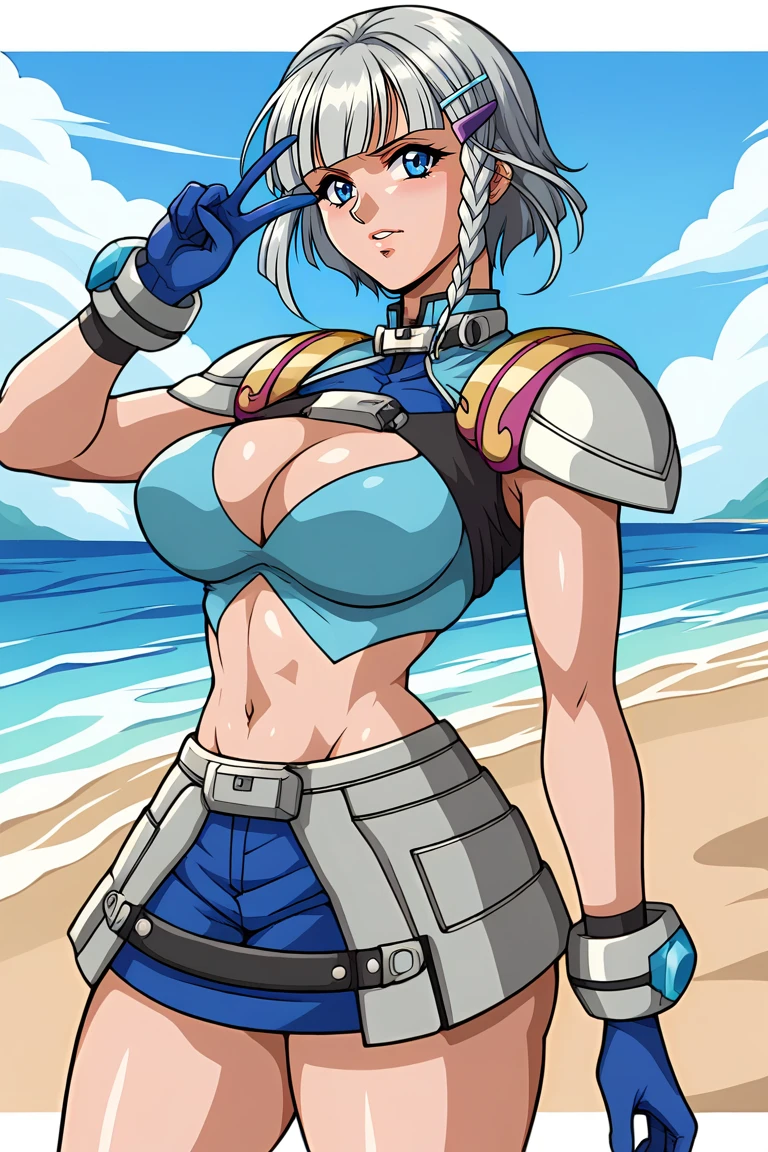 tag:seolla, blue eyes,retro artstyle,white skirt,braid, hairclip, hair ornament, short hair, side braid, grey hair, seolla,cowboy shot,cleavage,blue gloves, cleavage,armor