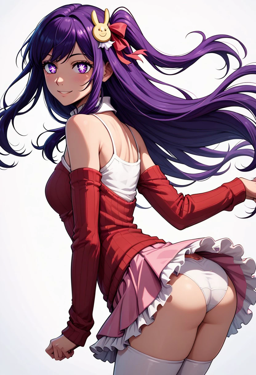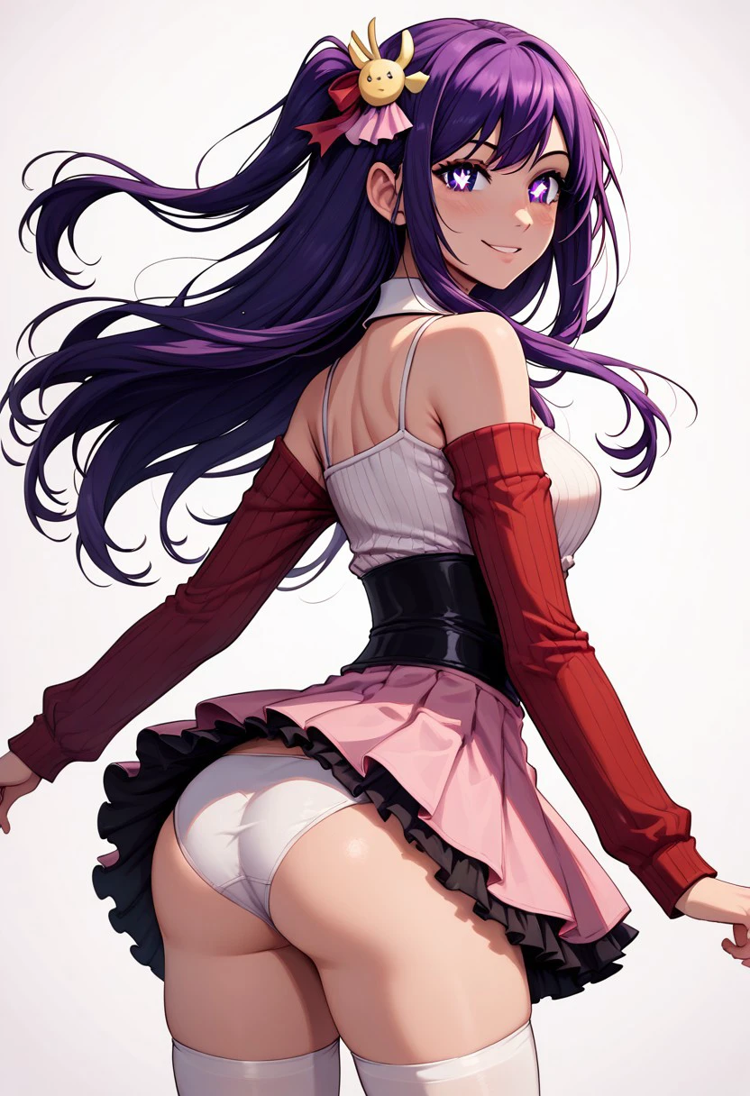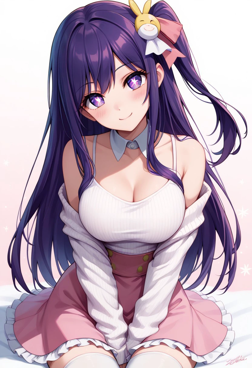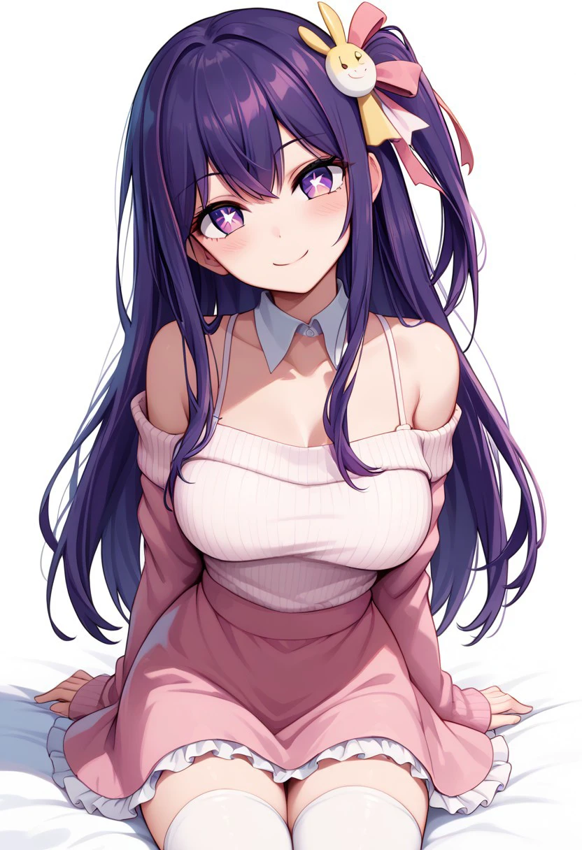 patHoshino, ai hoshino, hoshino ai, long hair, bangs, purple eyes, purple hair, symbol-shaped pupils, long sleeves, sweater, ribbed sweater, white camisole, one side up, hair ornament, hair ribbon, white thighhighs, zettai ryouiki, idol, pink dress, sleeveless, pink skirt, frilled skirt, bare shoulders, white collar,