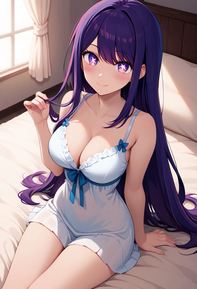 patHoshino, ai hoshino, long hair, bangs, purple eyes, purple hair, symbol-shaped pupils, long sleeves, sweater, ribbed sweater, white camisole, one side up, hair ornament, hair ribbon, white thighhighs, zettai ryouiki, idol, pink dress, sleeveless, pink skirt, frilled skirt, bare shoulders, white collar,