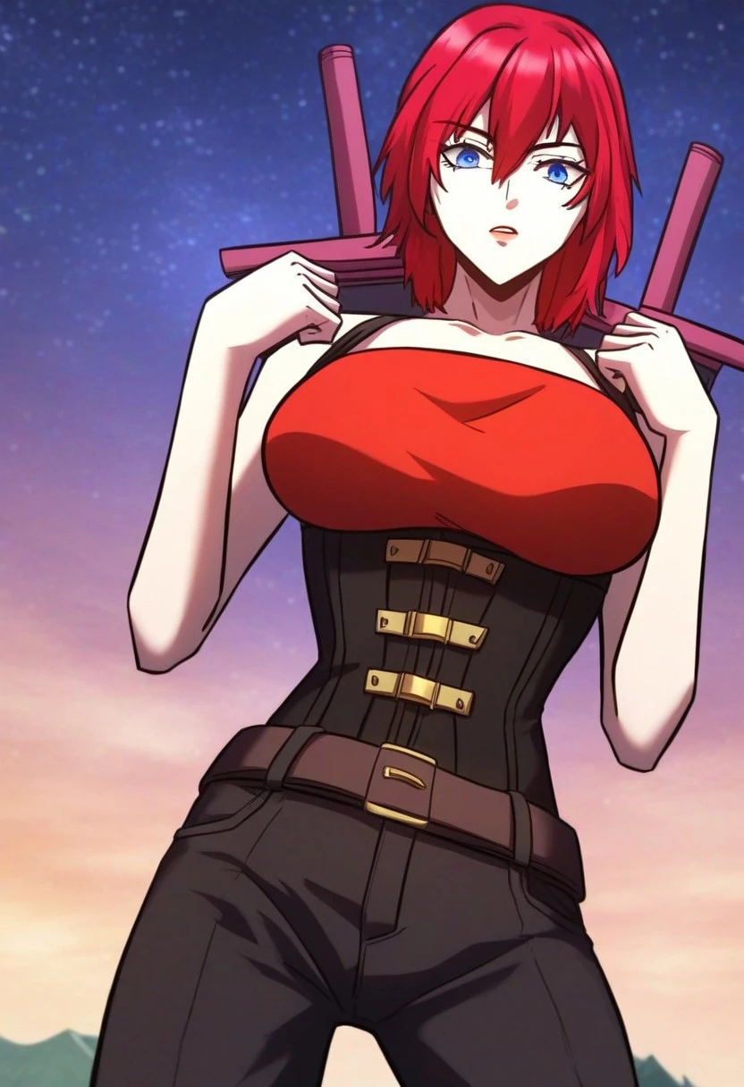 red top, high neckline, short-sleeved, over the top, black underbust corset, multiple buckles down the front, black cargo pants, belt loops