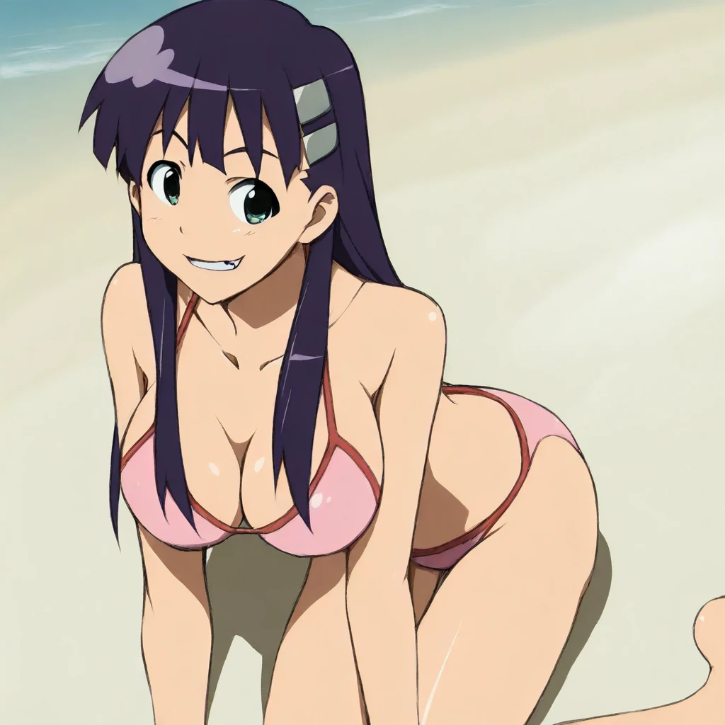 kiyal bachika, kiyal bachika (gurren lagann), purple hair, long hair, green eyes, pink outfit, hairclips, fang, large breasts, 1girl, solo
